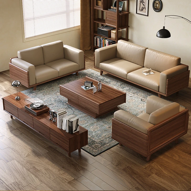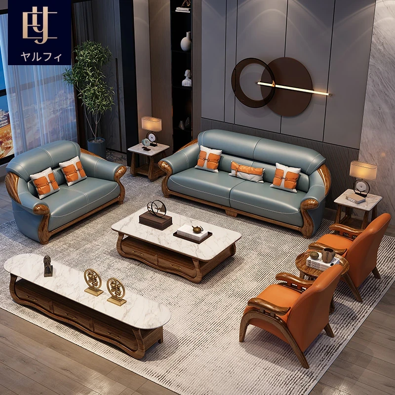 高級別荘用 本物の革&高級無垢材 新中式デザインの一流牛革ソファ ウッドウッドフィニッシュ 124cm コンビネーションリビングソファ