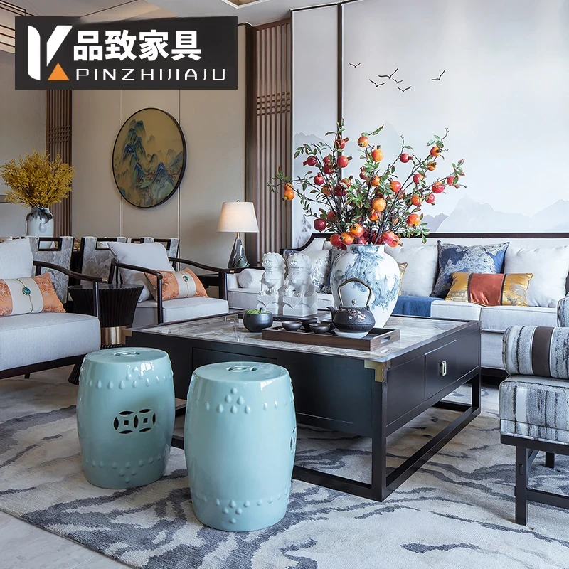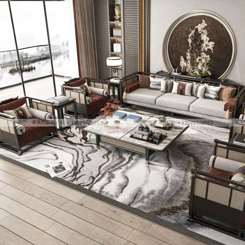 新中式スタイルの無垢材ソファセット - モダンでシンプルな宋風リビング、別荘やホテルのモデルルームに最適な贅沢な家具。快適さと美しさを兼ね備えた一品です!