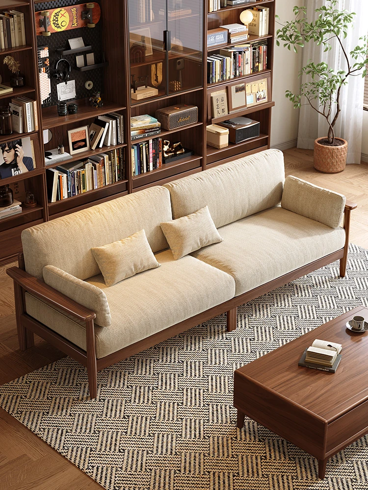 北欧風新中式ブラックウォールナットのモダンミニマリストソファ - 小型リビングに最適な直線デザインの天然木製ファブリックソファ。スタイリッシュで快適な空間を演出します!