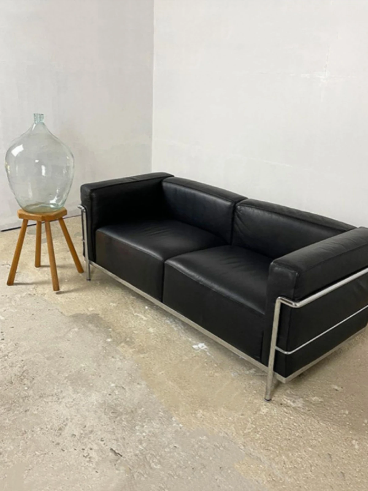 イタリアンデザイナーコルビジェLC3本革ソファセット - ブラックの2人掛け、ファッション店の接客に最適なラグジュアリーなリラクゼーション空間を提供します。