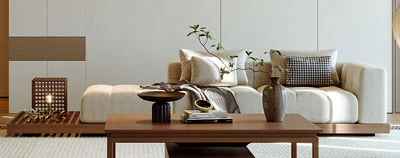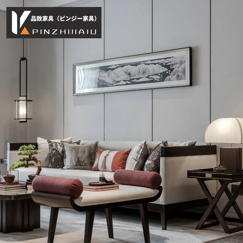 シンプルでモダンな新中式デザインの無垢材ソファセット - 禅の雰囲気漂うホテルロビーやサロンの接待スペースに最適なモデルルームリビング家具。洗練された居心地の良さを体験してください!