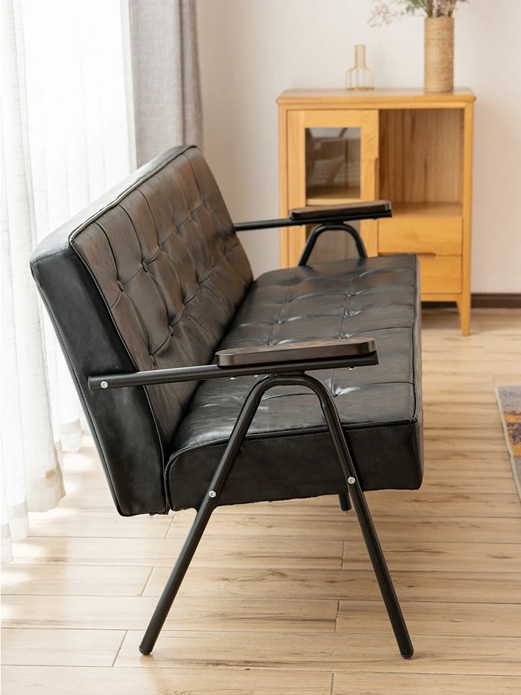 ミニマルレトロデザインの皮製ソファ—2人掛けと3人掛けのコンパクトサイズ。小さなリビングやオフィスに最適なアイアンフレームの一人掛けソファ。ビジネスシーンにもぴったりなスタイリッシュなカウンターチェア。