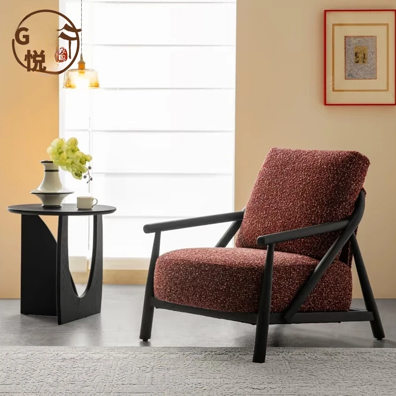 シンプルでモダンな新中式デザインの無垢材ソファチェア。上質なファブリック仕上げで、ホテルや別荘、リビングルームのモデルルームに最適。リラックスできる空間を演出する、スタイリッシュなソファです。