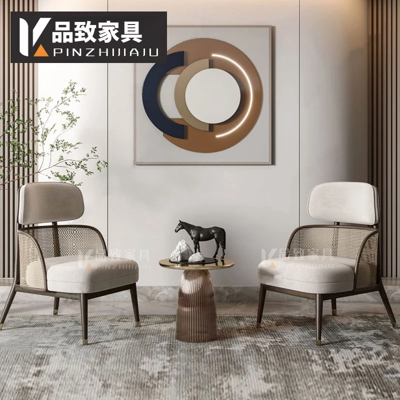 新中式デザインの無垢材ラウンジチェア、北欧風のラタン編み、おしゃれなホテルやレストランに最適な軽奢デザイン。快適な談話スペースを演出する高級感あふれるダイニングチェア!