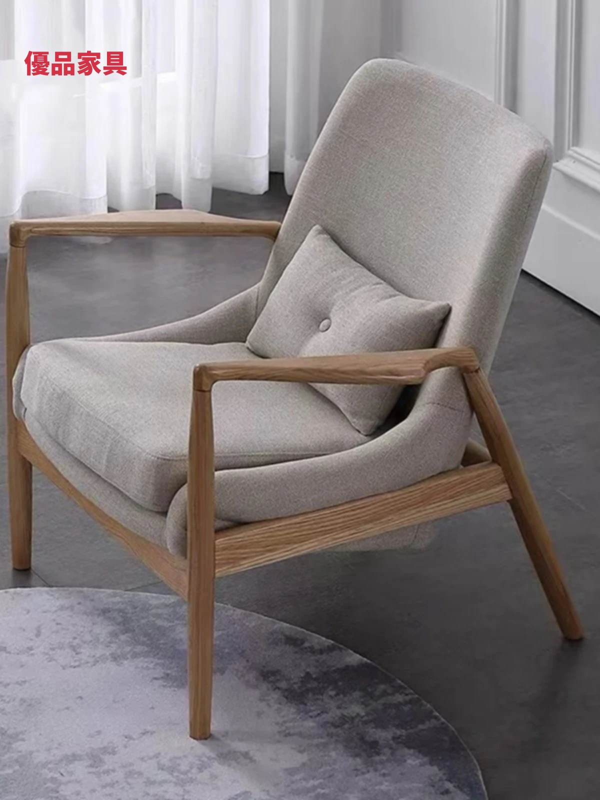 北欧スタイルのホワイトアッシュ無垢材シングルソファチェア - シンプルでおしゃれなデザイン、ホテルやカフェ、書斎、リビング、ティールームに最適なファブリックリラックスチェア!心地よいひとときを提供します。