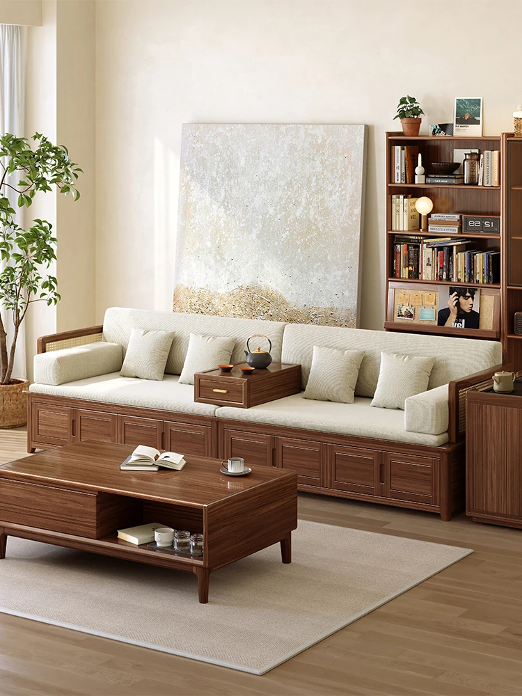 Stylish Black Walnut Solid Wood Sofa Bed with Storage - Versatile Multi-Function Lounger for Small Living Rooms, Ideal for Seating and Sleeping