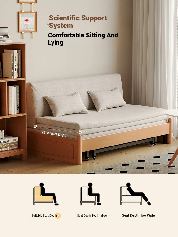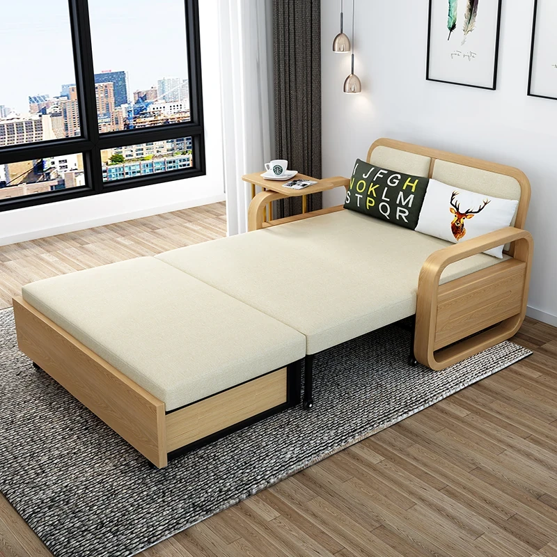 Modern Minimalist New Chinese Style Solid Wood Sofa Bed - Foldable, Dual-Use for Living Room, Perfect for Small Spaces, Elegant and Functional Design