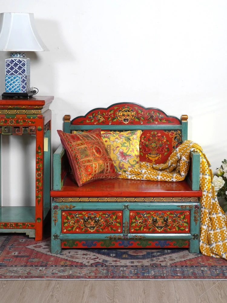 Hand-Painted Tibetan-Style Solid Wood Armchair - Vintage-Inspired Artistic Sofa Chair for Leisure - New Chinese Aesthetic Furniture