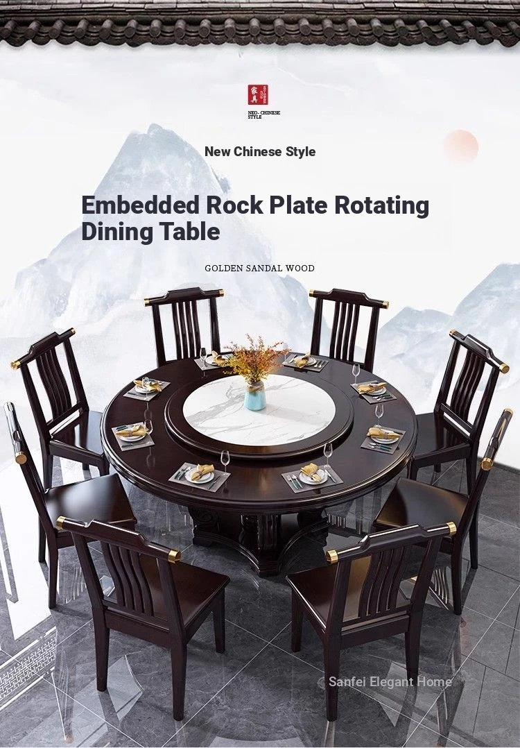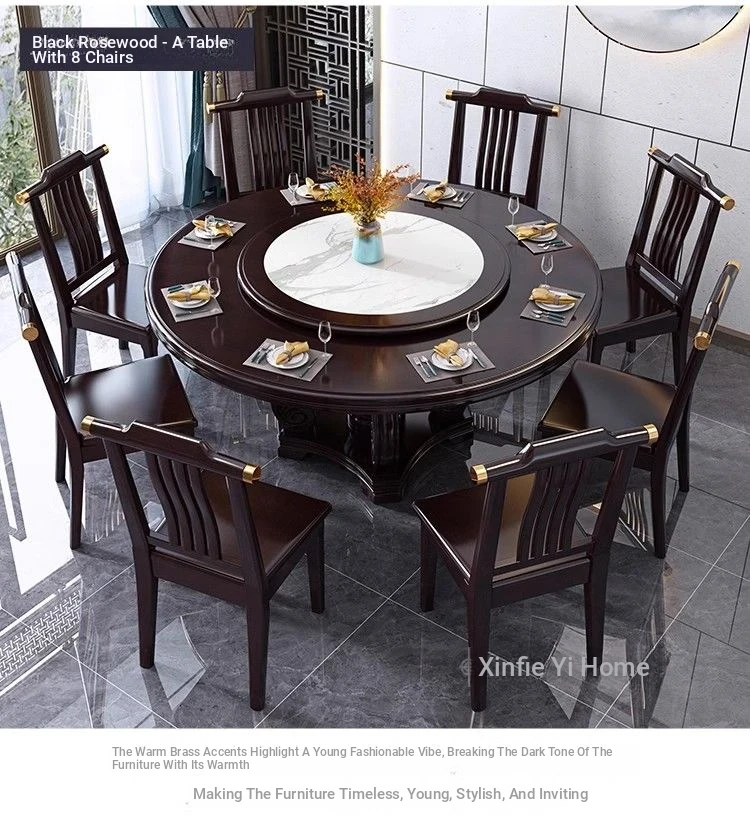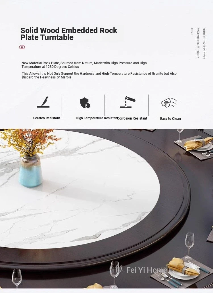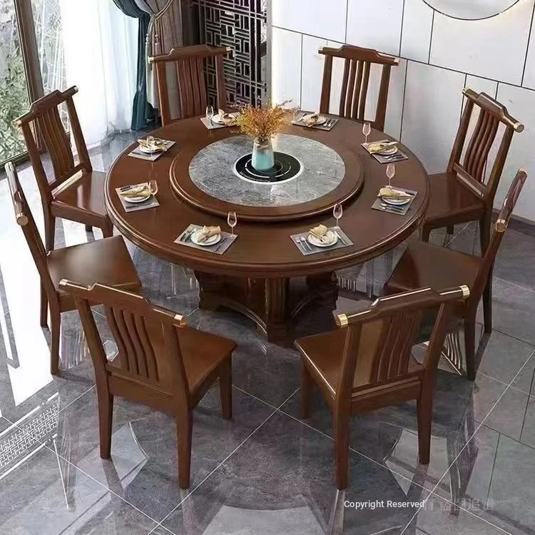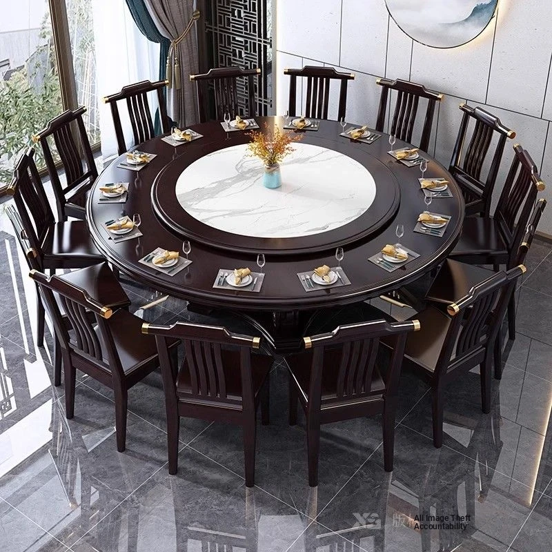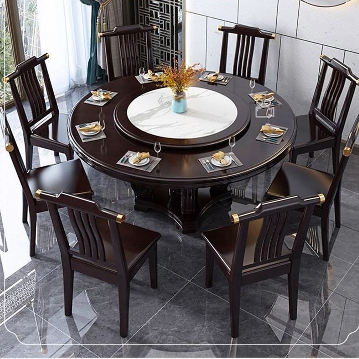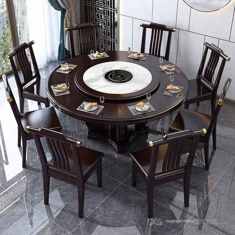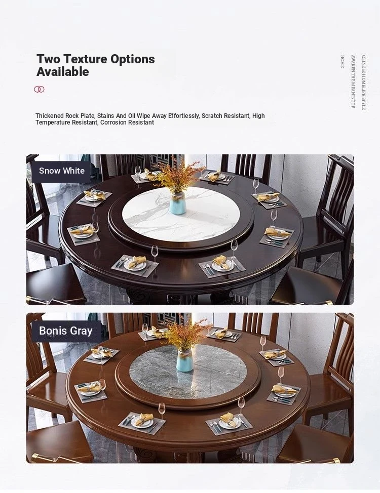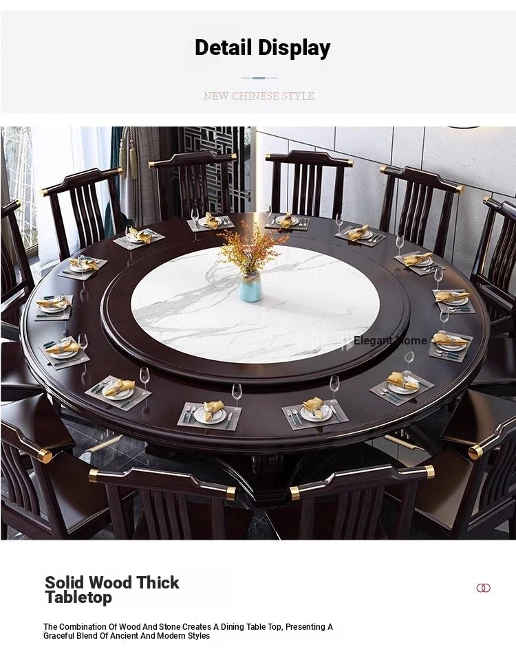 Elegant Chinese Solid Wood Dining Table Set with Round Rock Slab Top - Perfect for Home and Restaurants, Includes Magnetic Induction Stove and Rotating Table for a Unique Dining Experience.