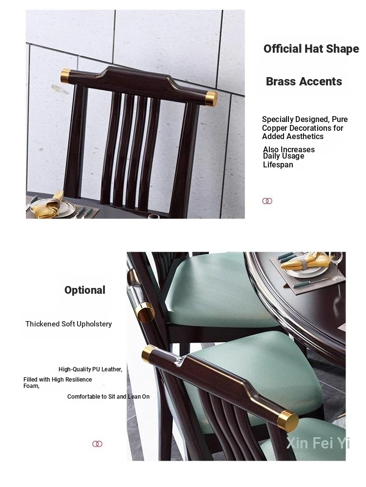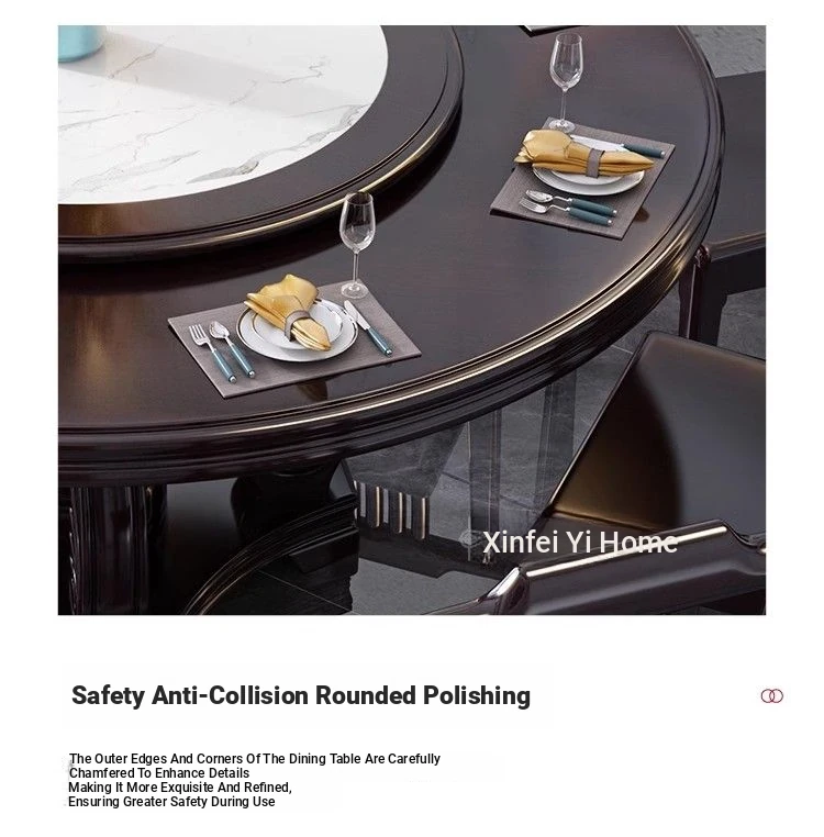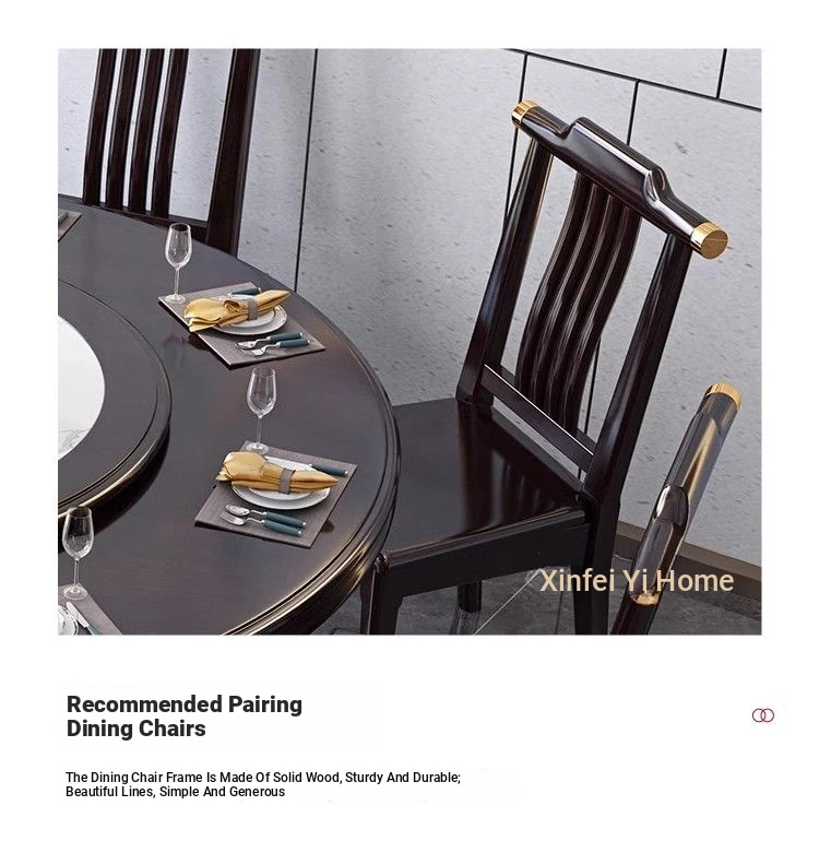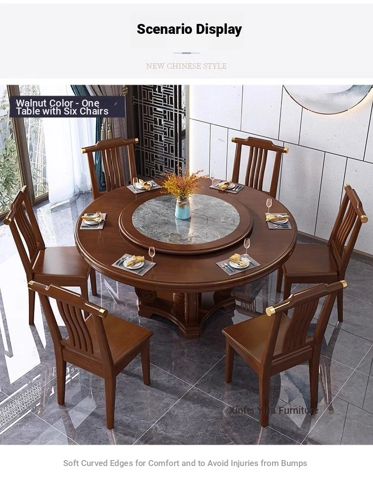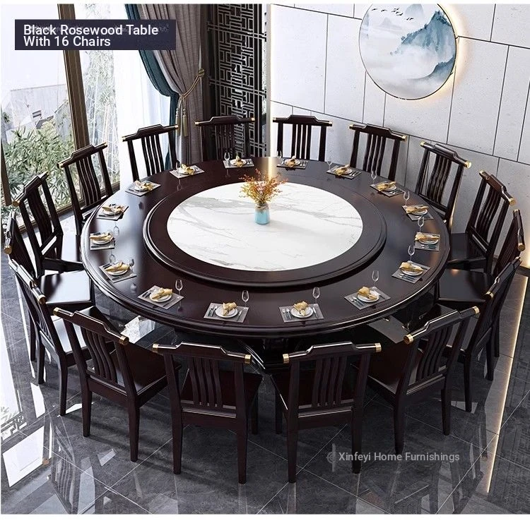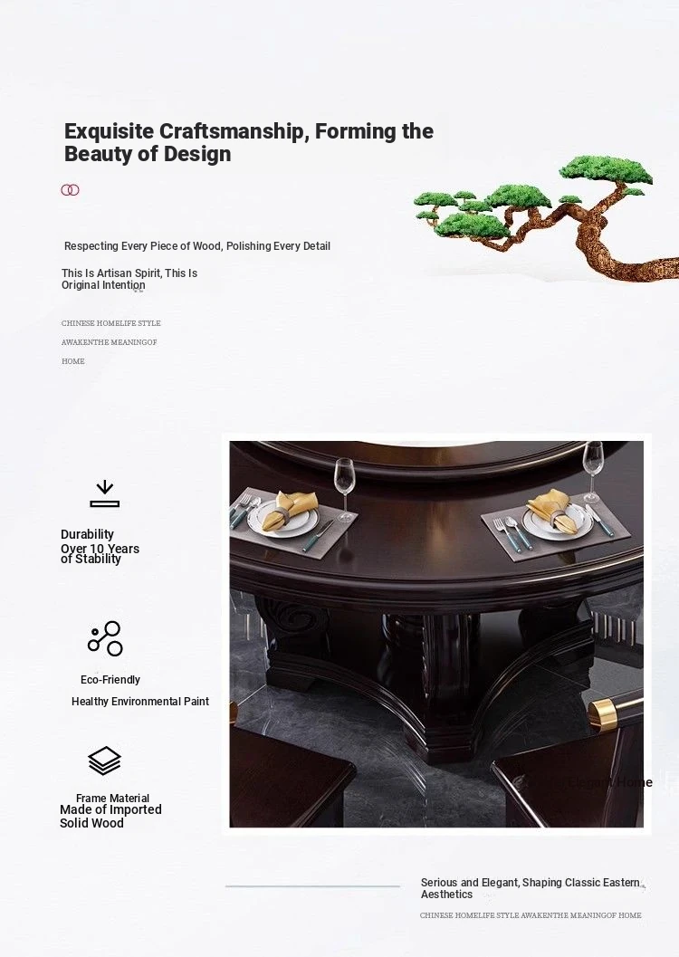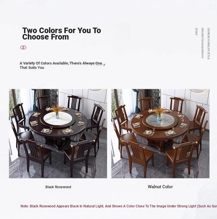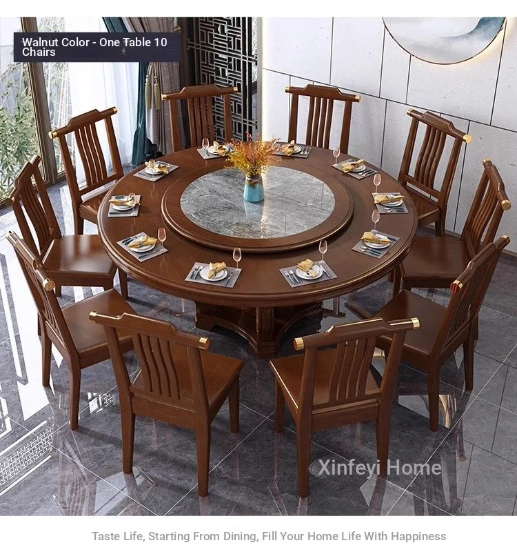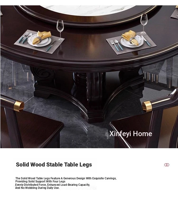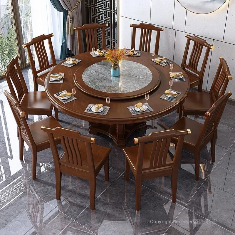 Elegant Chinese Solid Wood Dining Table Set with Round Rock Slab Top - Perfect for Home and Restaurants, Includes Magnetic Induction Stove and Rotating Table for a Unique Dining Experience.