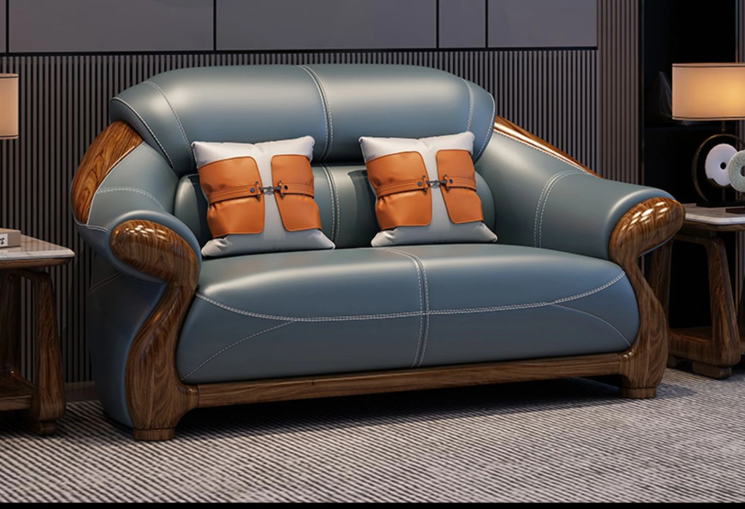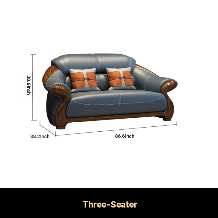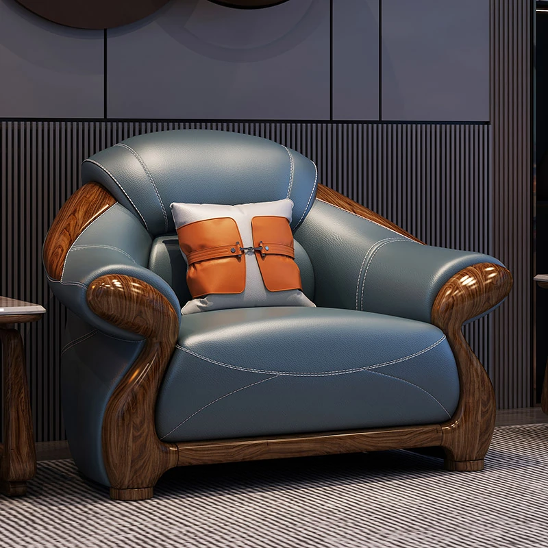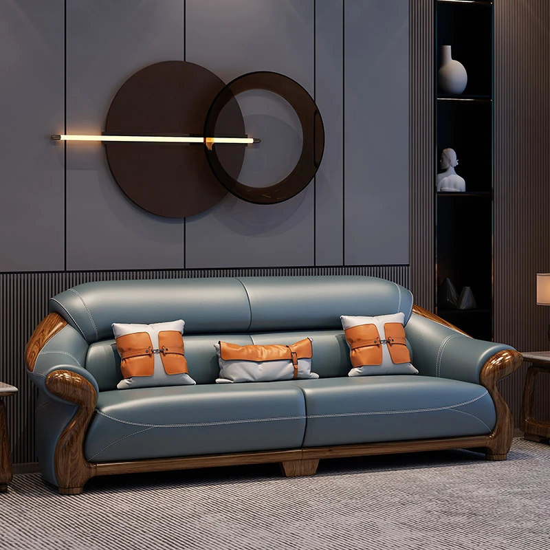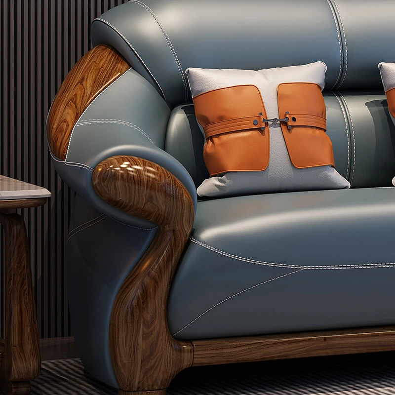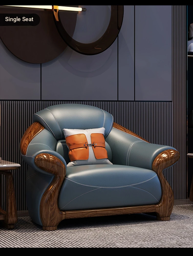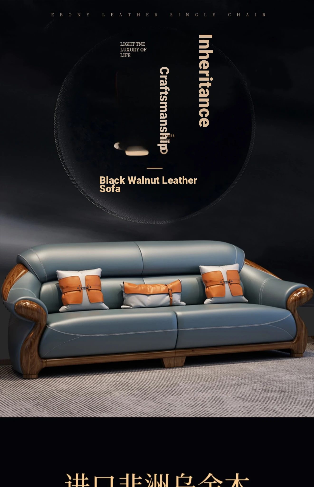 Luxury Villa Real Leather New Chinese Style Top Grain Cowhide Sofa with Black Walnut Veneer - 124-piece Living Room Set