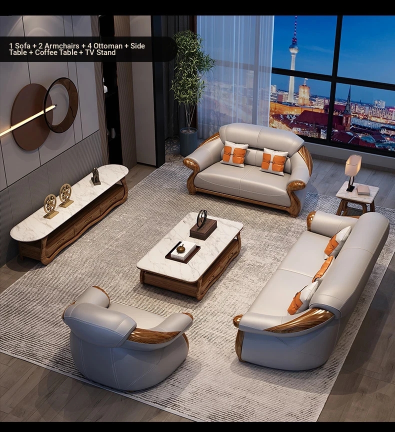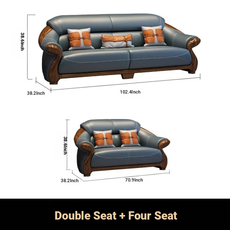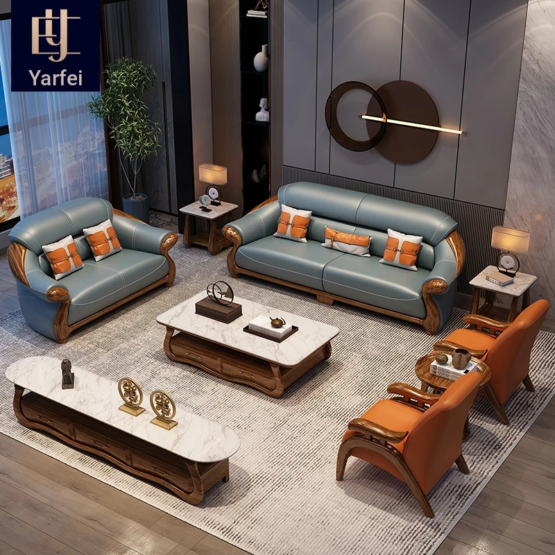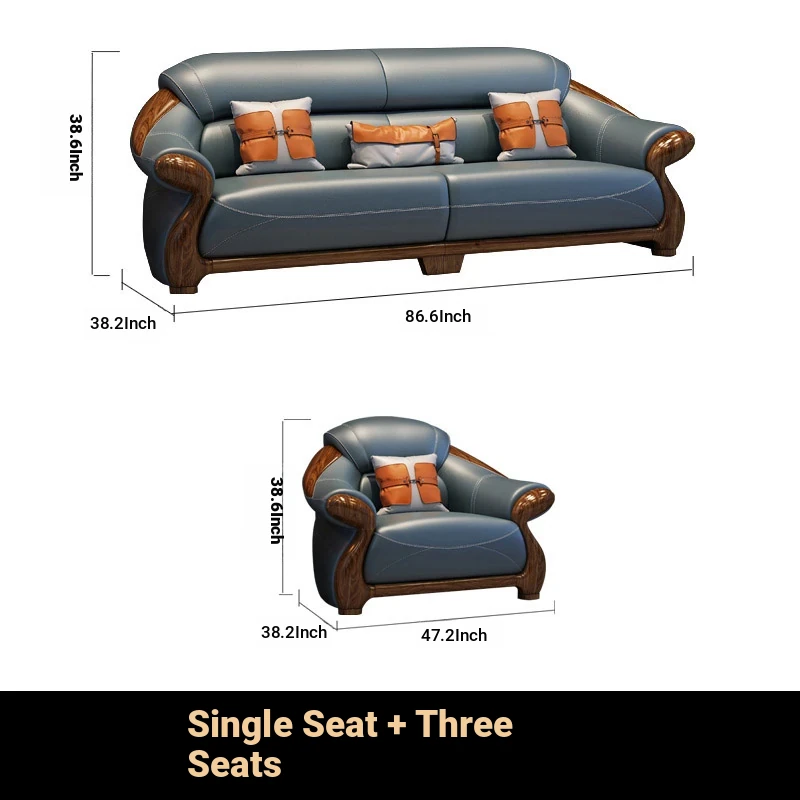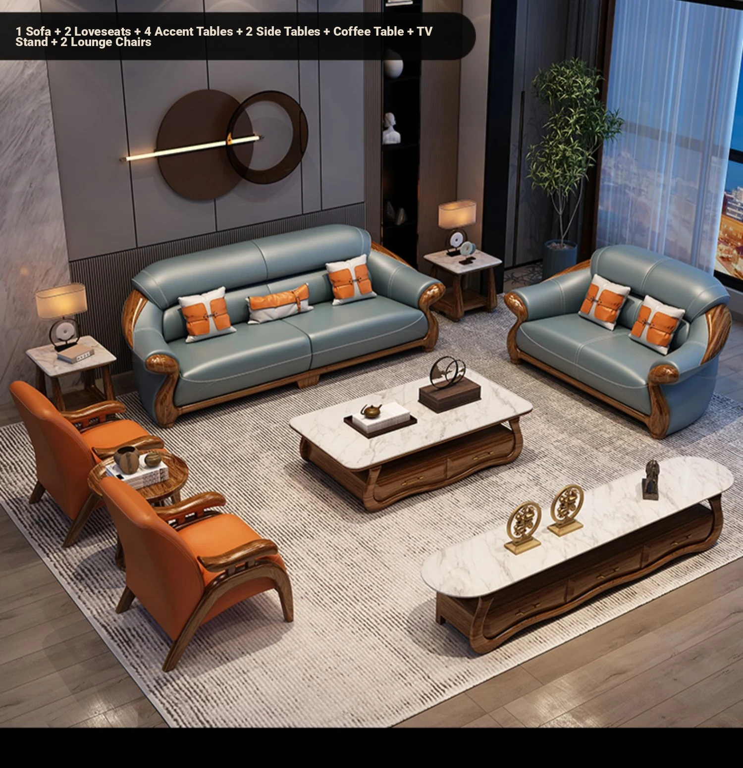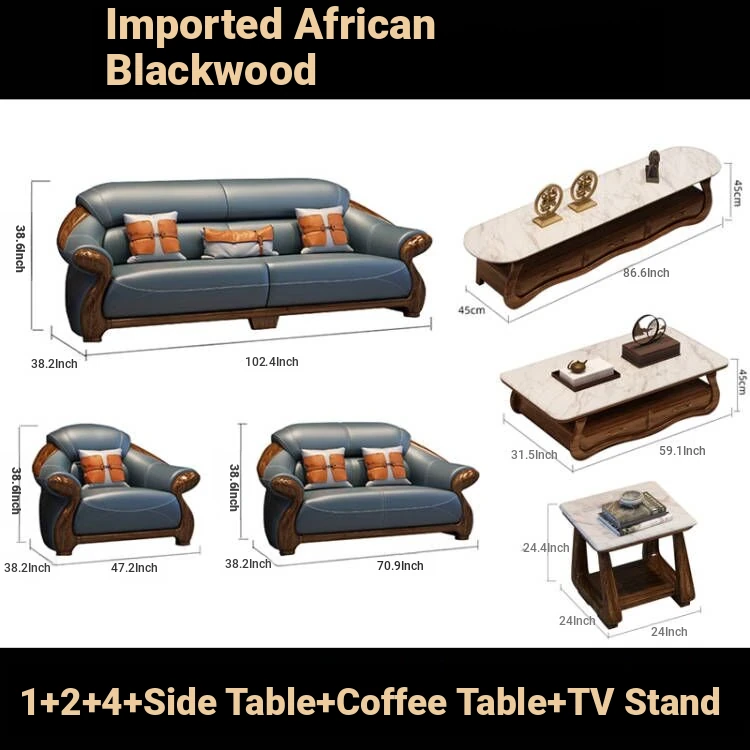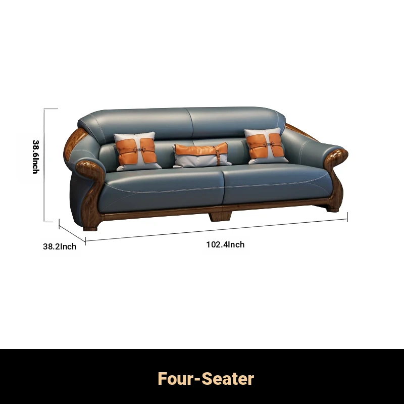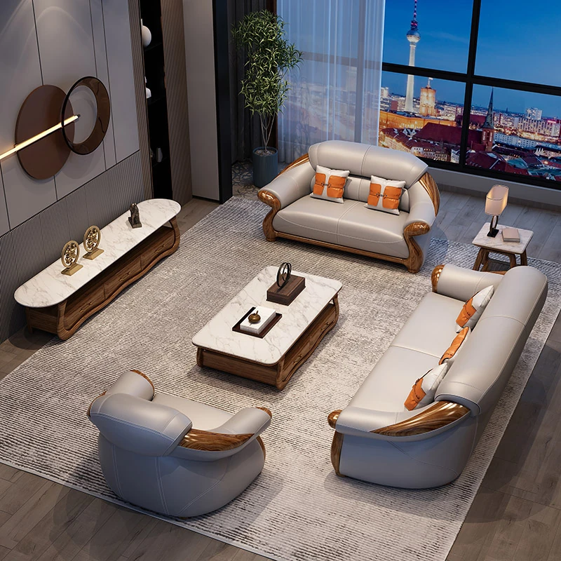 Luxury Villa Real Leather New Chinese Style Top Grain Cowhide Sofa with Black Walnut Veneer - 124-piece Living Room Set