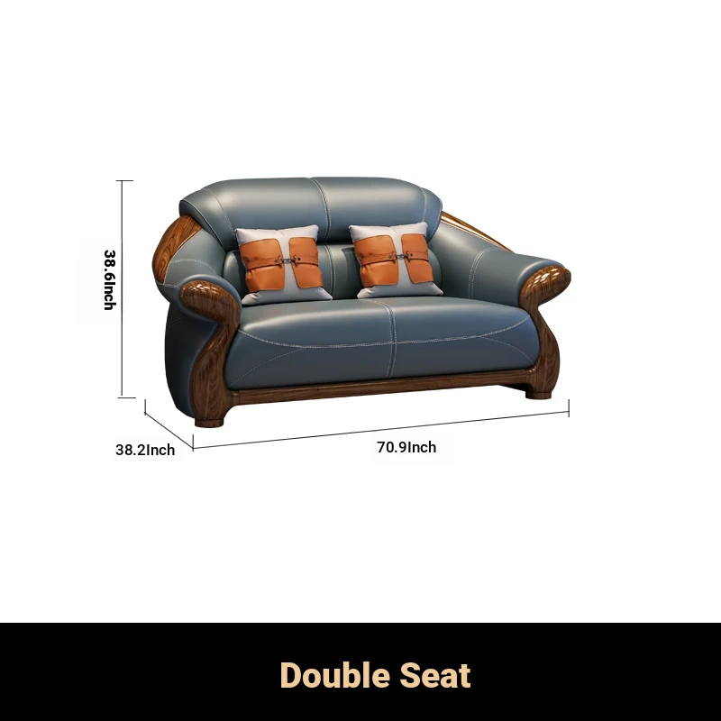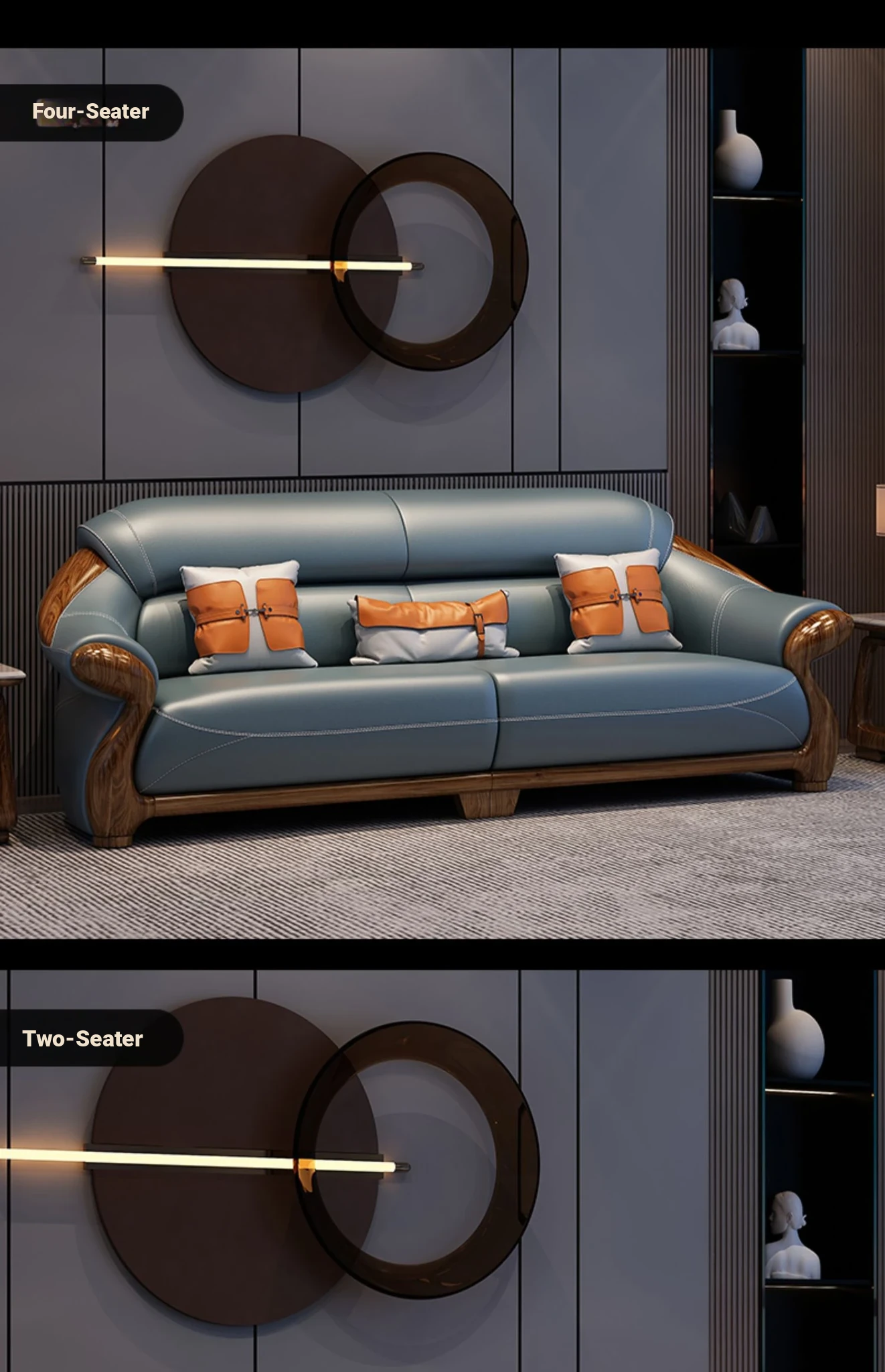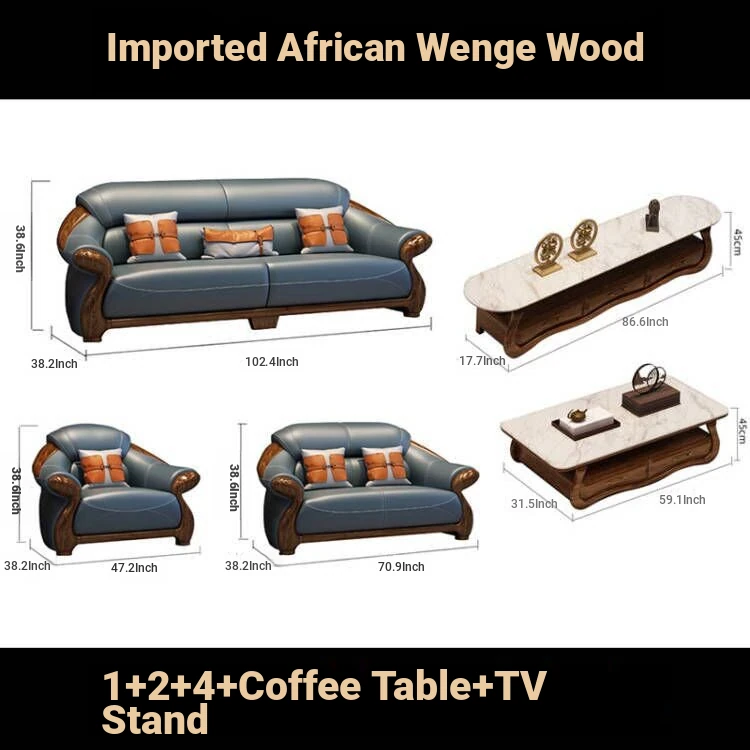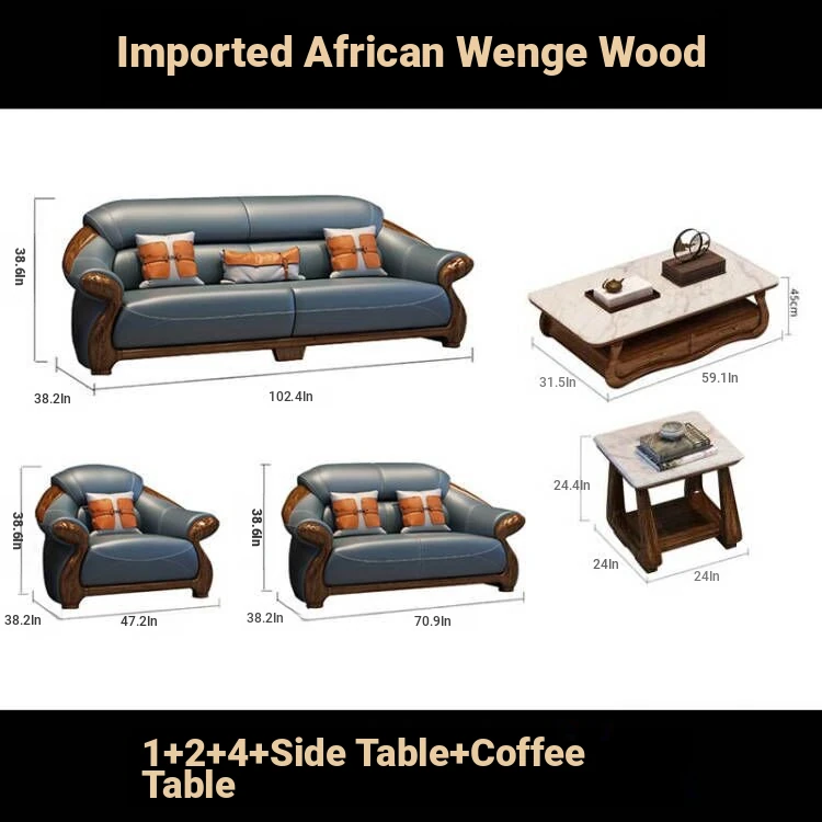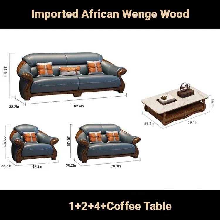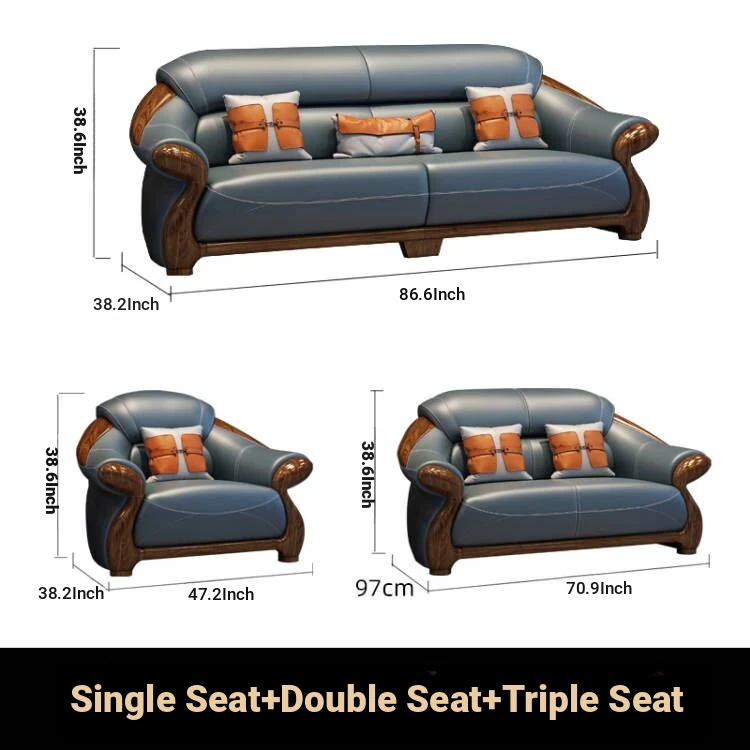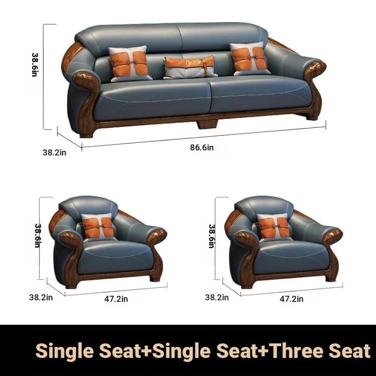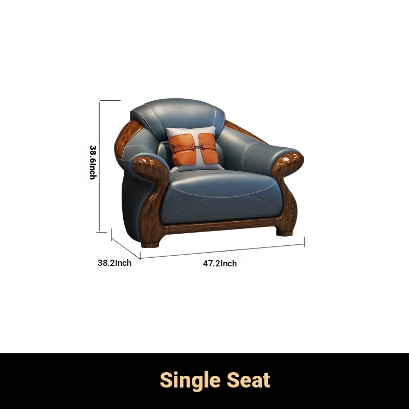 Luxury Villa Real Leather New Chinese Style Top Grain Cowhide Sofa with Black Walnut Veneer - 124-piece Living Room Set