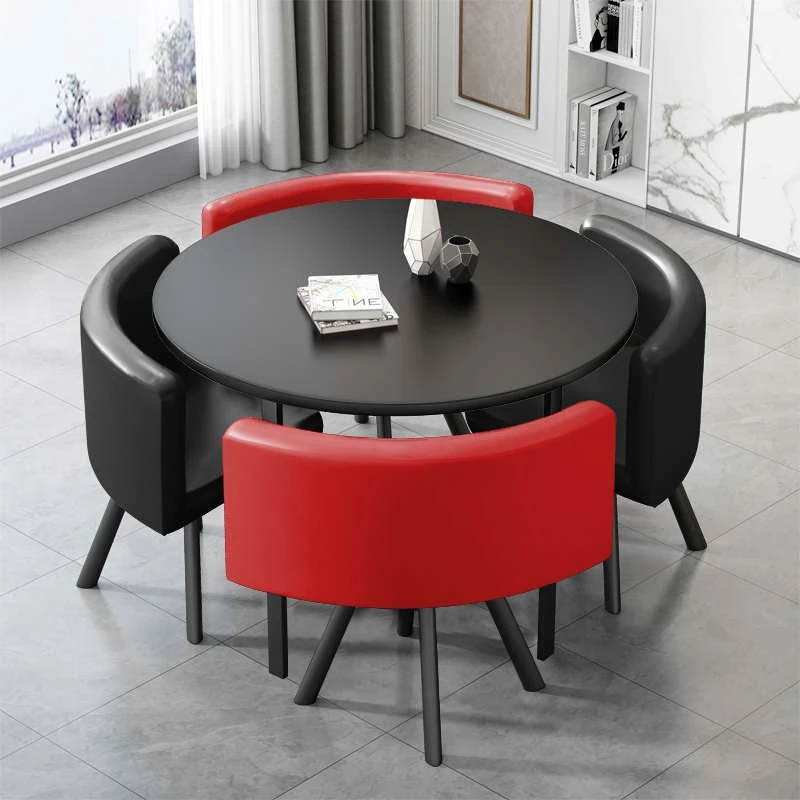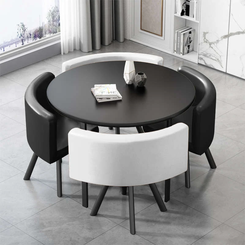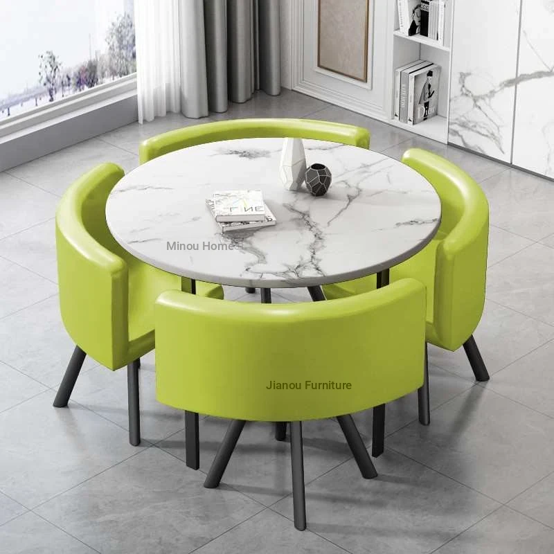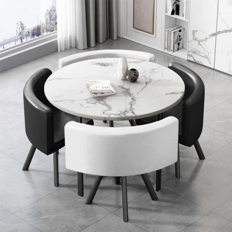 Imitation stone grain round + gray leather chair 1 table 4 chairs