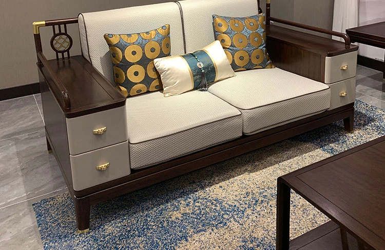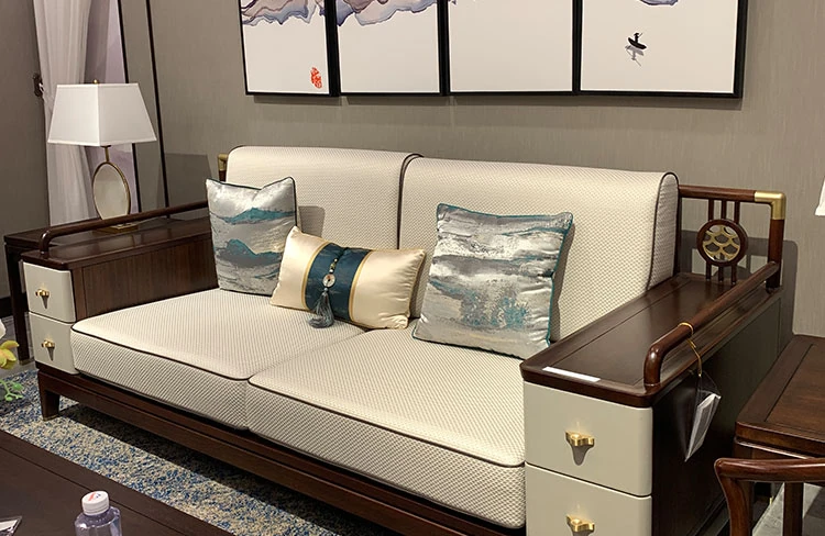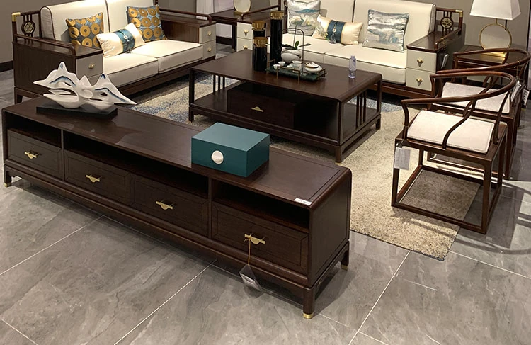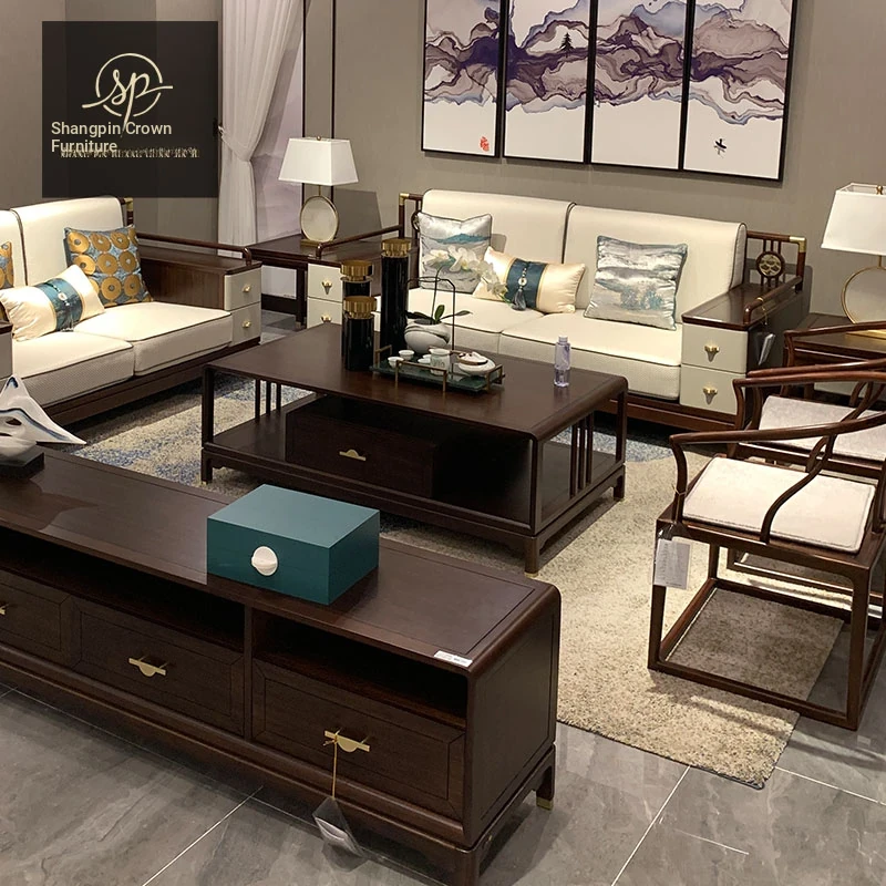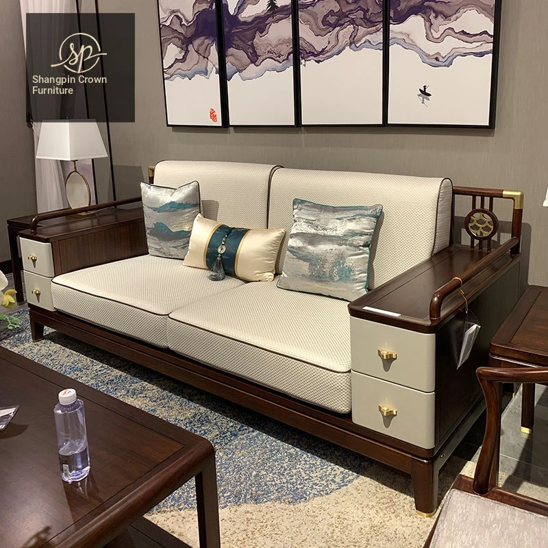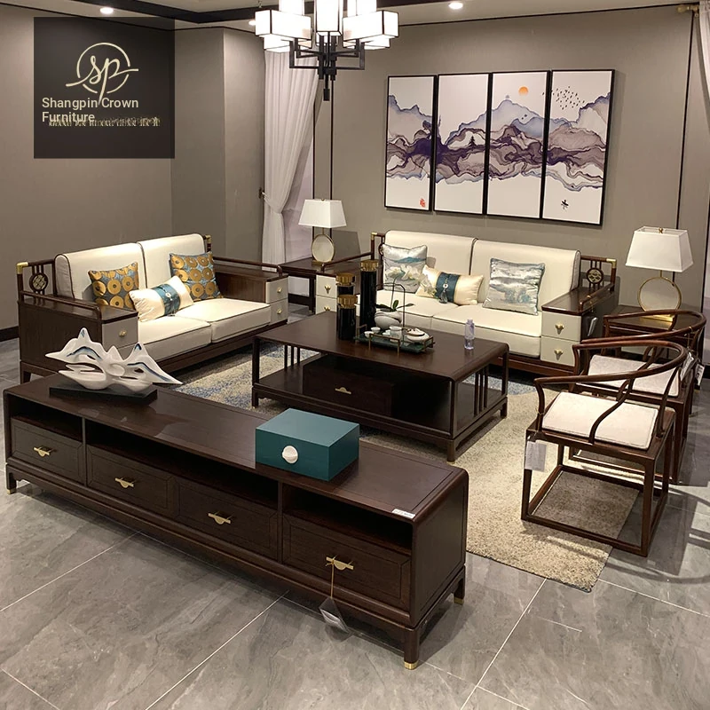 Modern Chinese-Style 321 Solid Wood Sofa Set - Luxurious Villa Fabric Sofa with Wenge Wood and Coffee Table Combination for a Chic Living Room