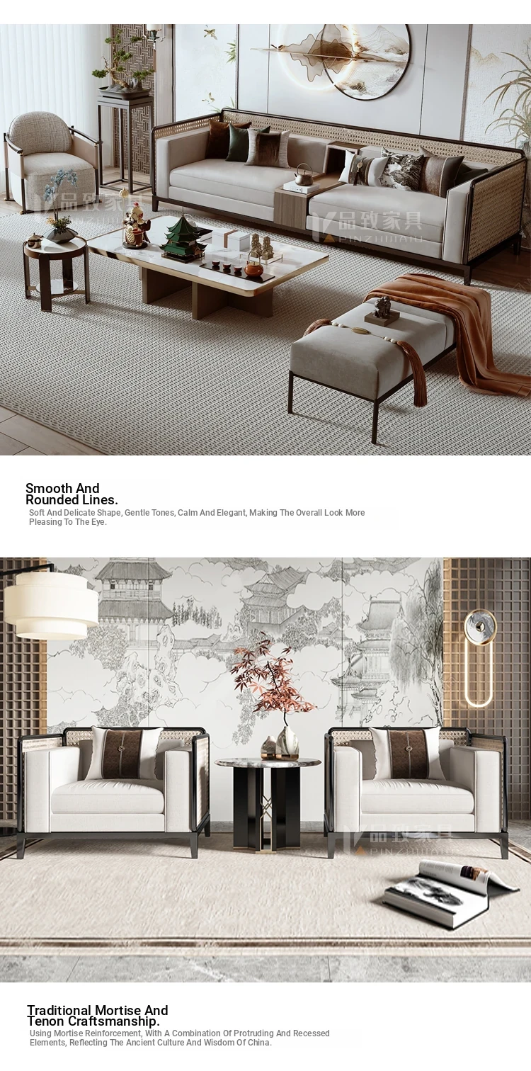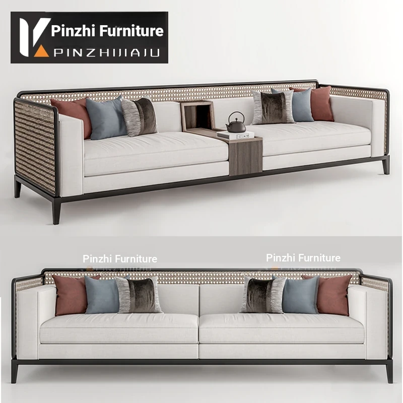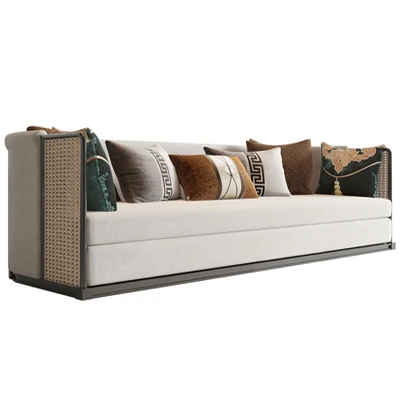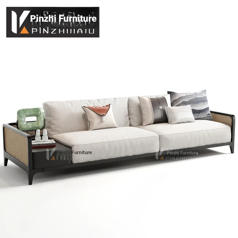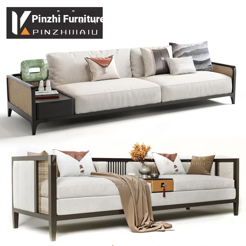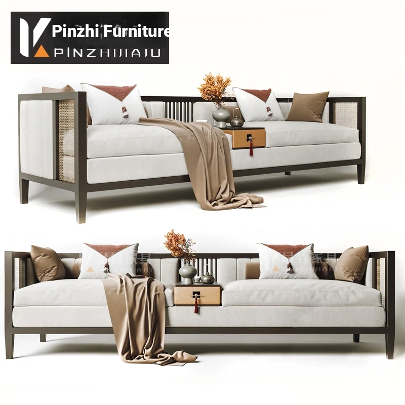New Chinese Style Three-Seater Sofa - Solid Wood and Rattan, Nordic Modern Wabi-Sabi Design for Hotels, Lounges, and Showrooms - Perfect for Cozy Spaces