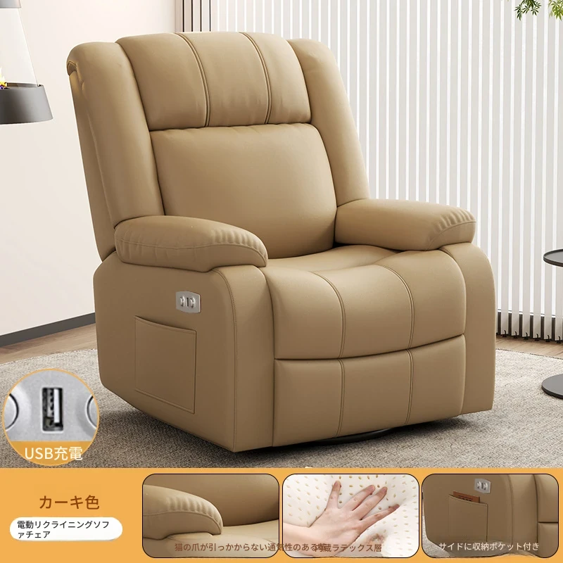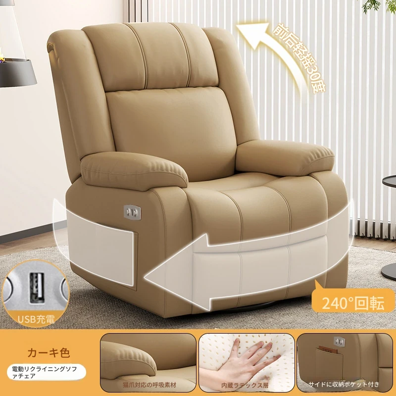 【キャットスクラッチレザー】カーキ-電動リクライニング+回転