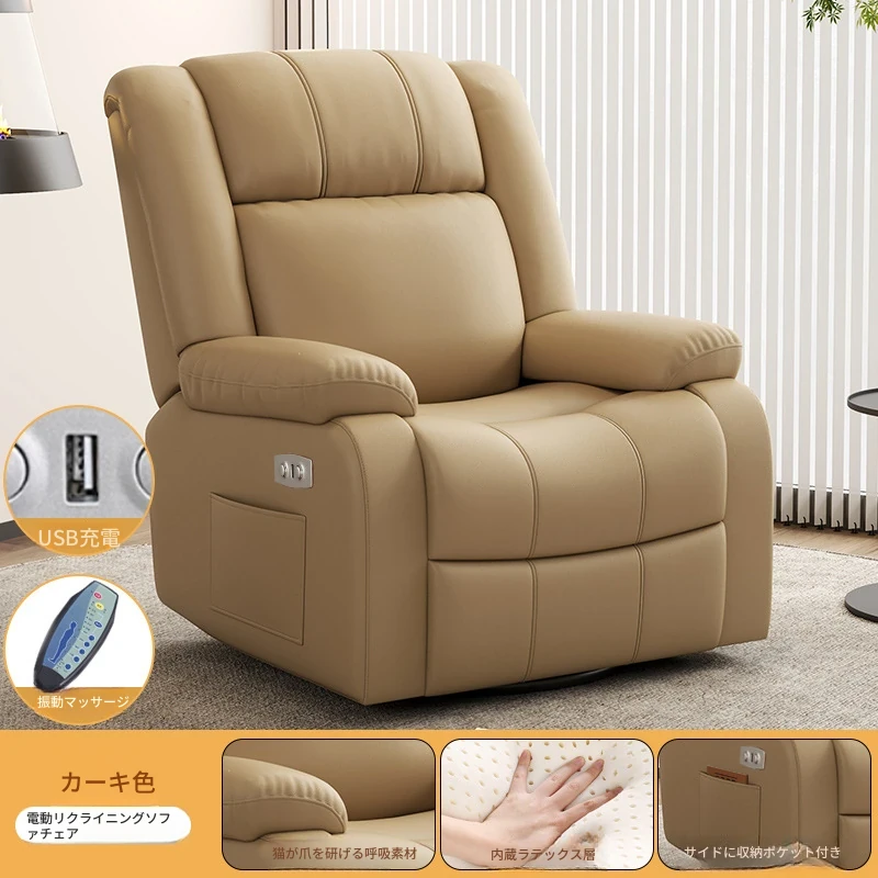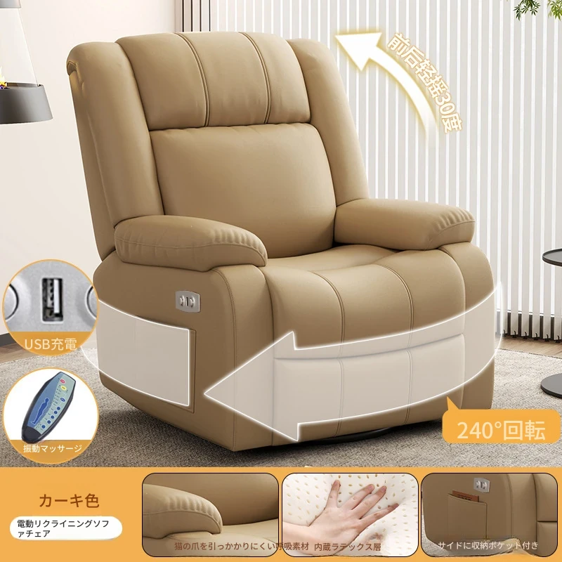 【キャットスクラッチレザー】カーキ-電動リクライニング+回転+振動マッサージ