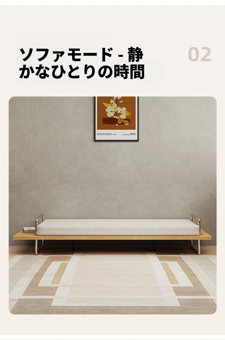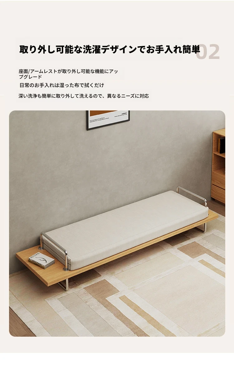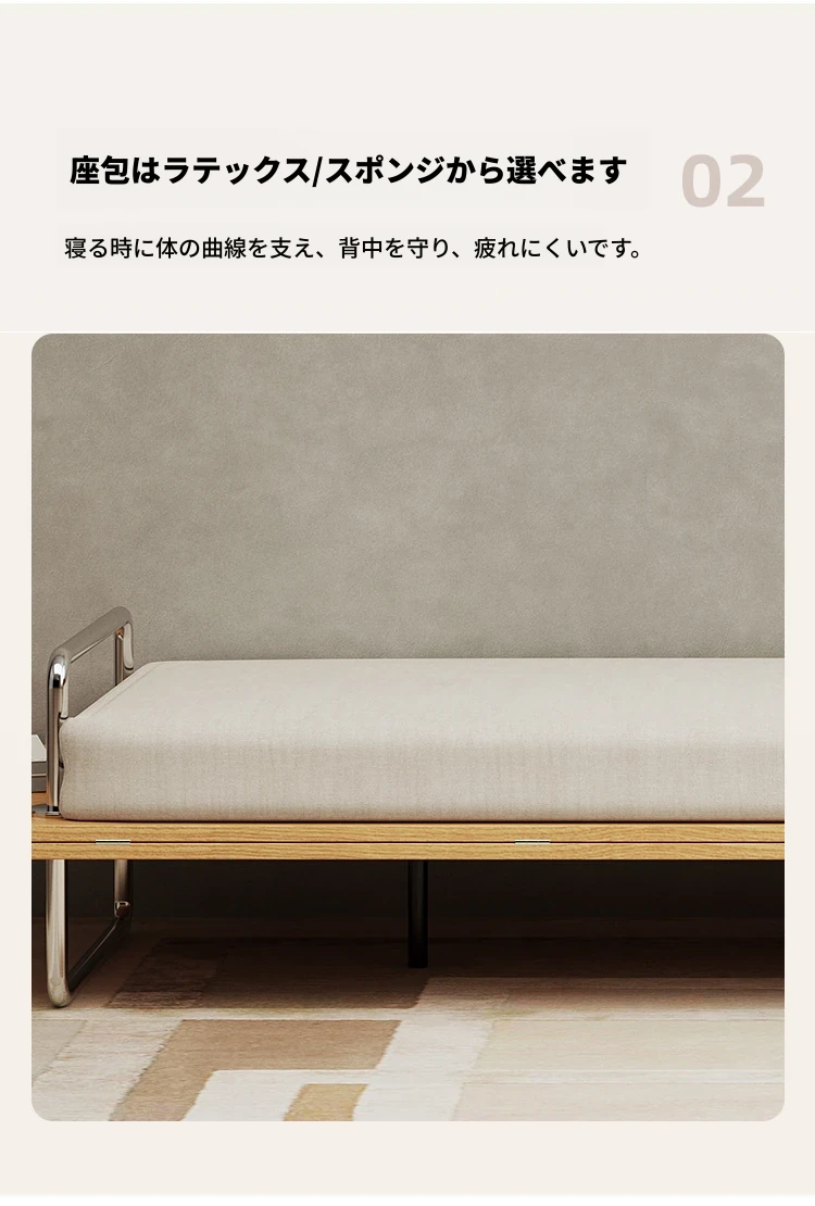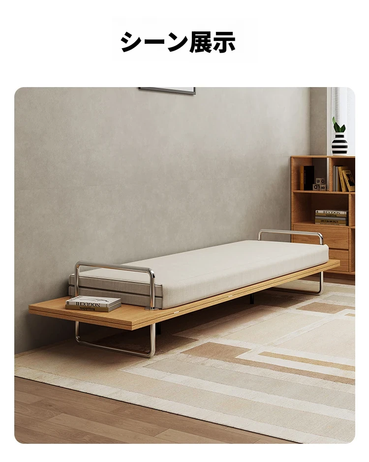 オーク色75CM幅シングルベッドフレーム(展開150CM)+スポンジクッション取り付け込み
