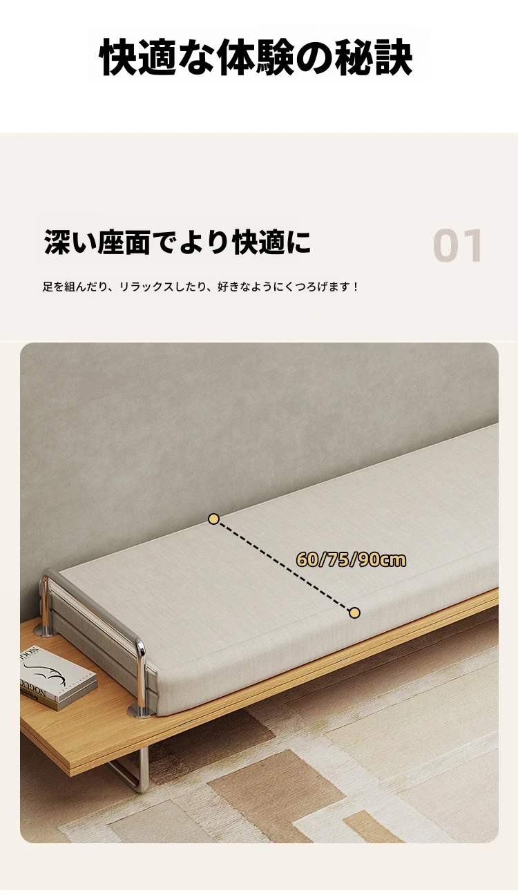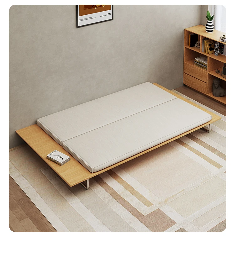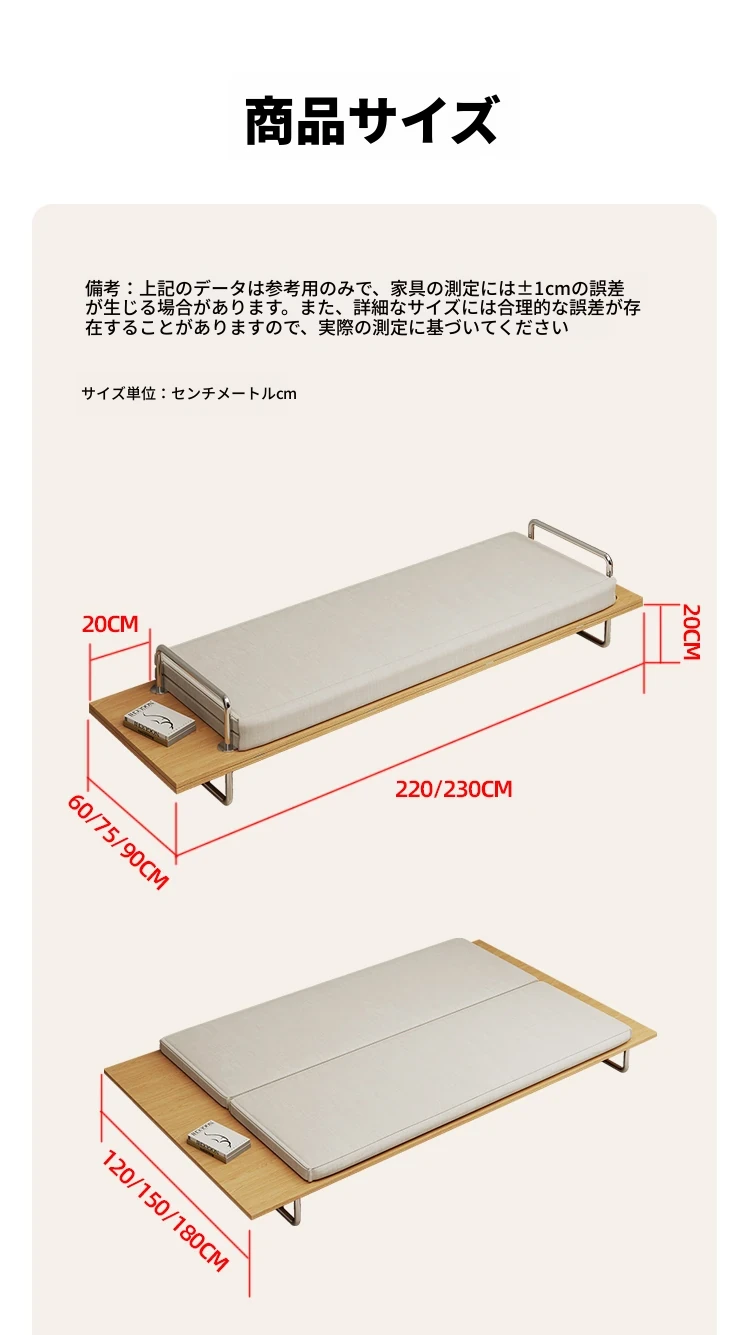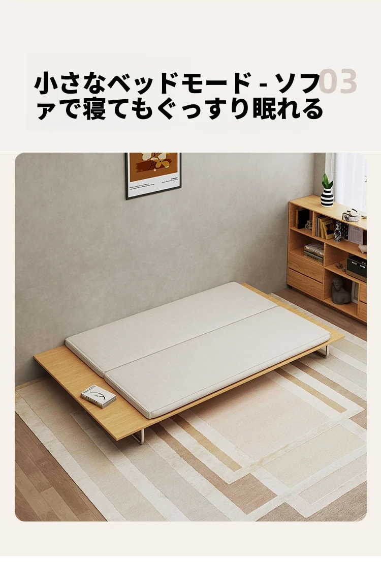 オーク色75CM幅シングルベッドフレーム(展開150CM)+スポンジクッション取り付け込み