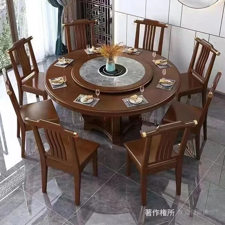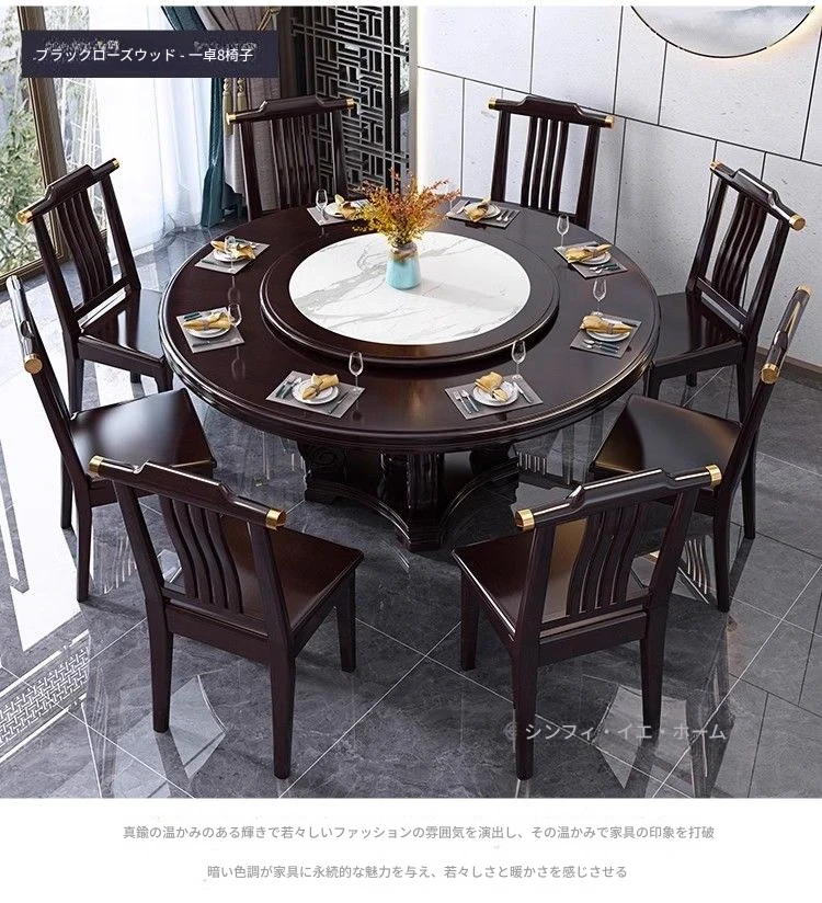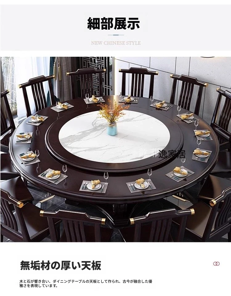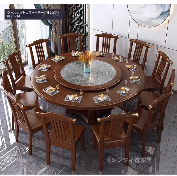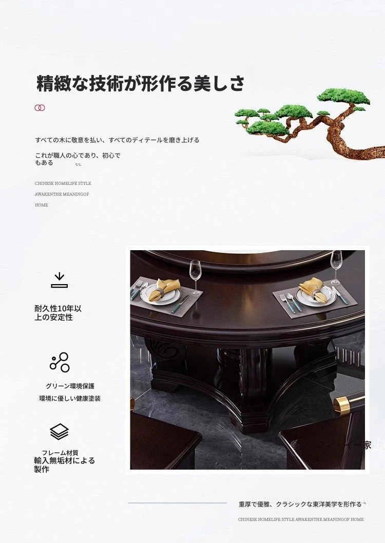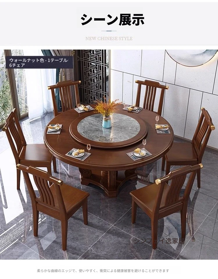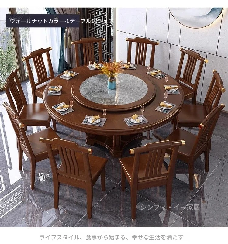 中華風の無垢材ダイニングテーブルセット - 高級感あふれる円形デザイン、家庭用・レストラン用に最適!電磁調理器対応、回転式テーブルで便利さ抜群!おしゃれで機能的な食卓を実現します。