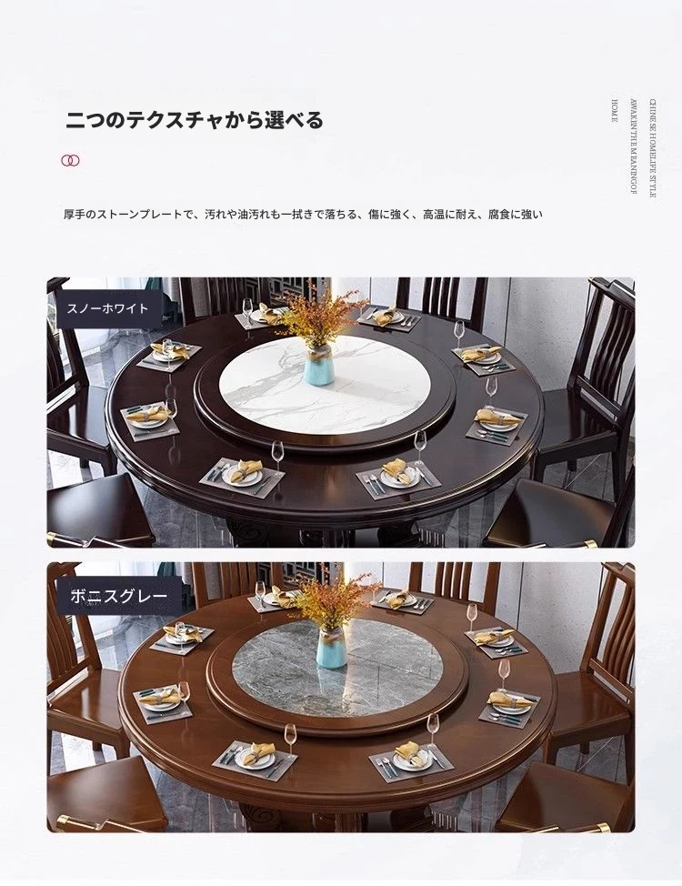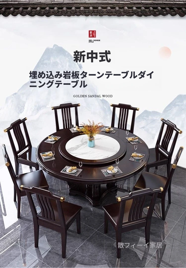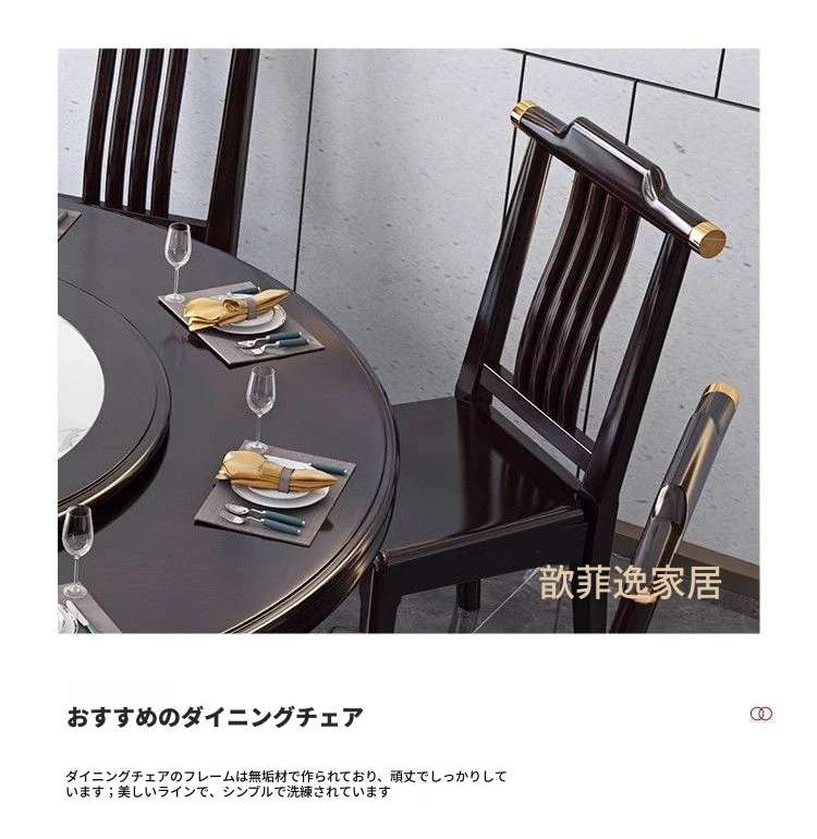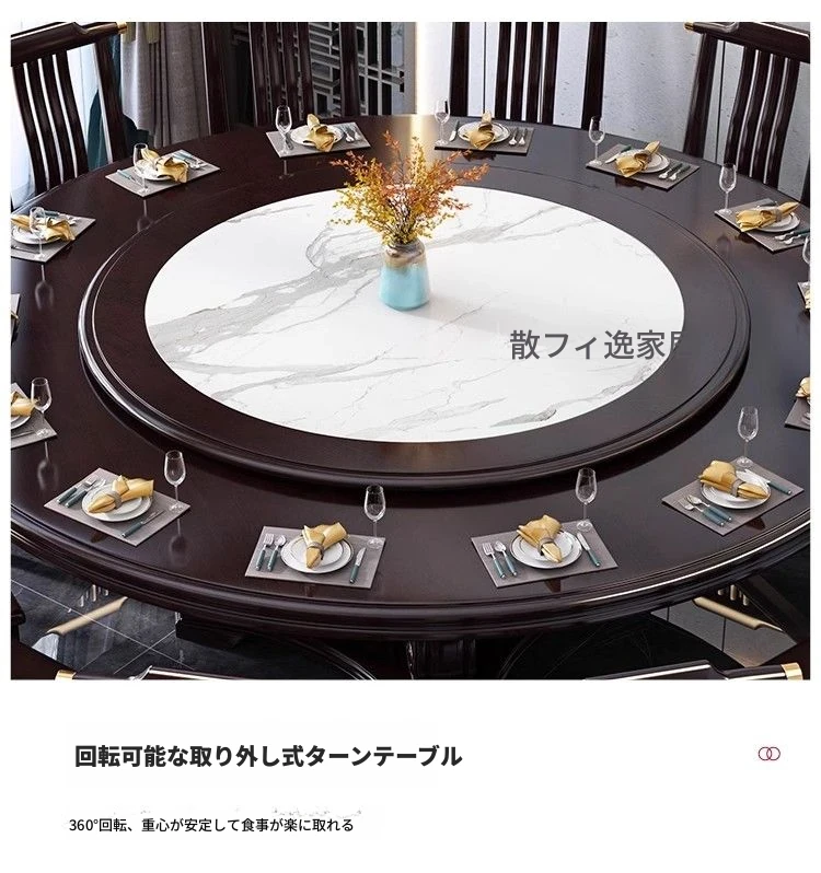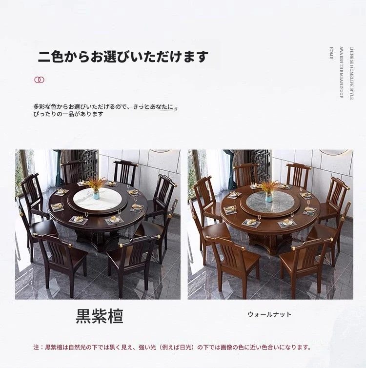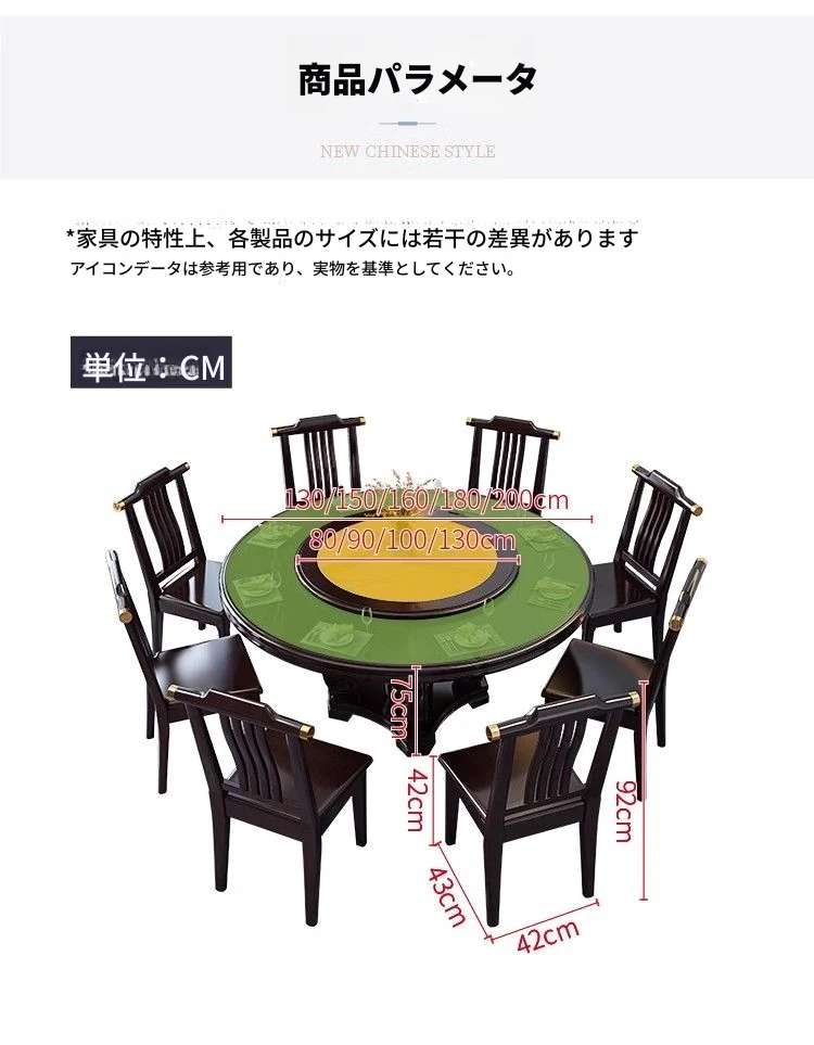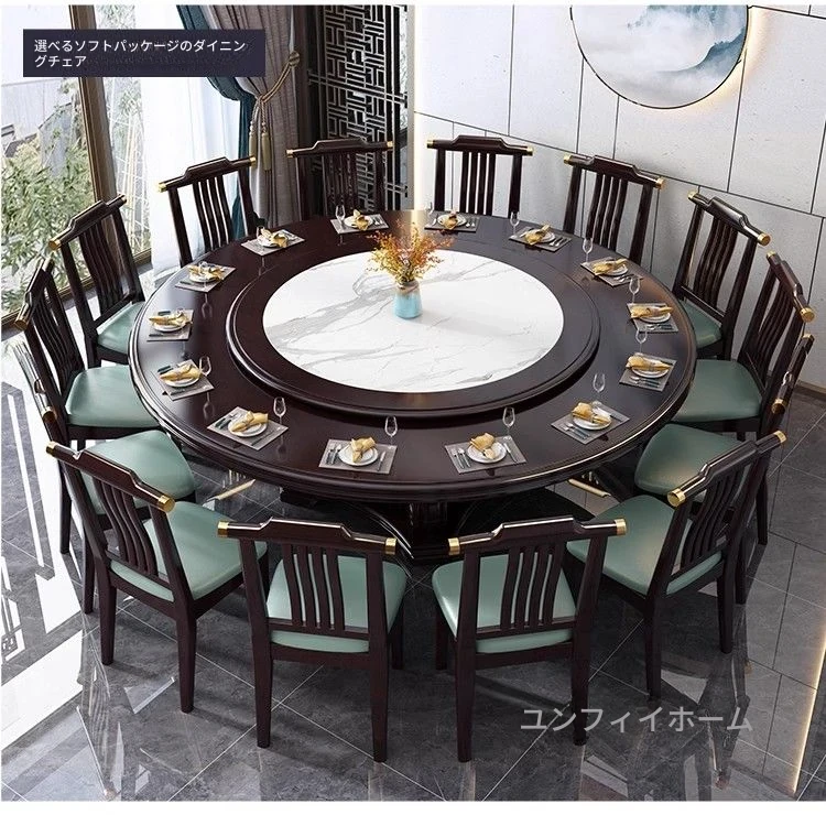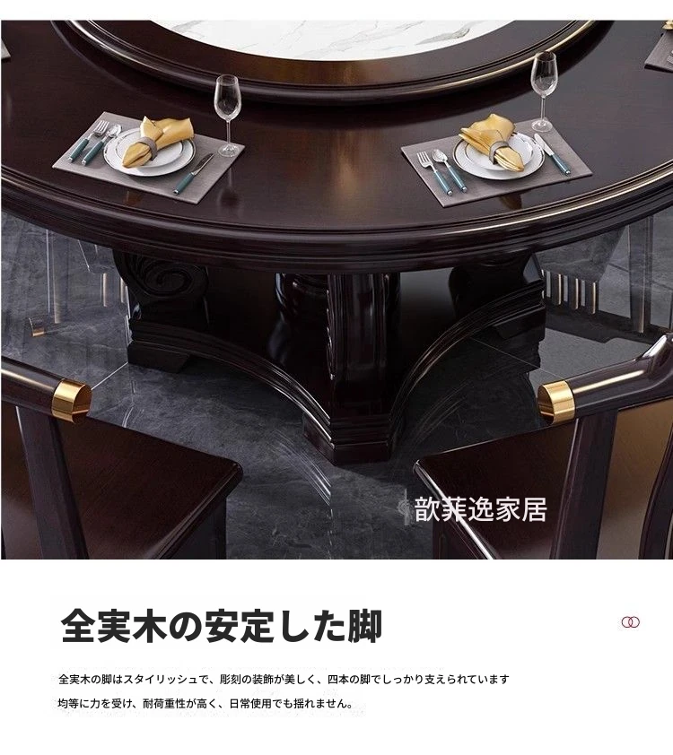 中華風の無垢材ダイニングテーブルセット - 高級感あふれる円形デザイン、家庭用・レストラン用に最適!電磁調理器対応、回転式テーブルで便利さ抜群!おしゃれで機能的な食卓を実現します。