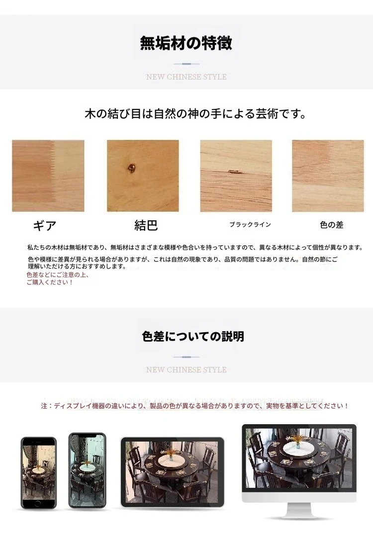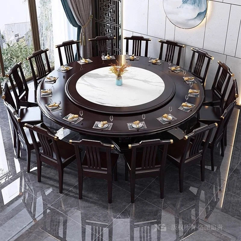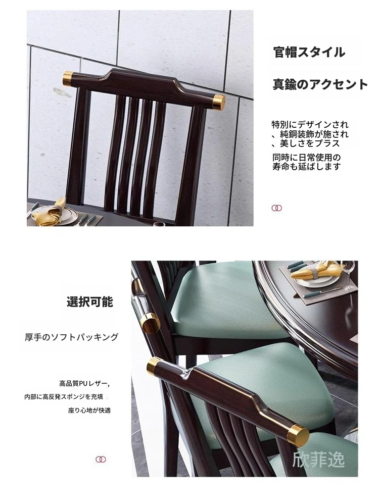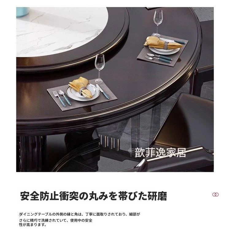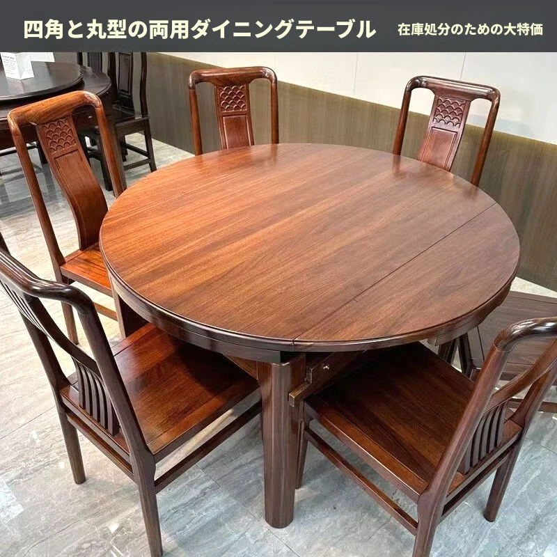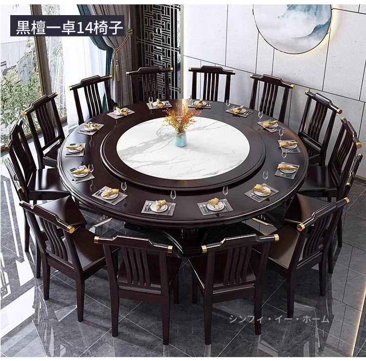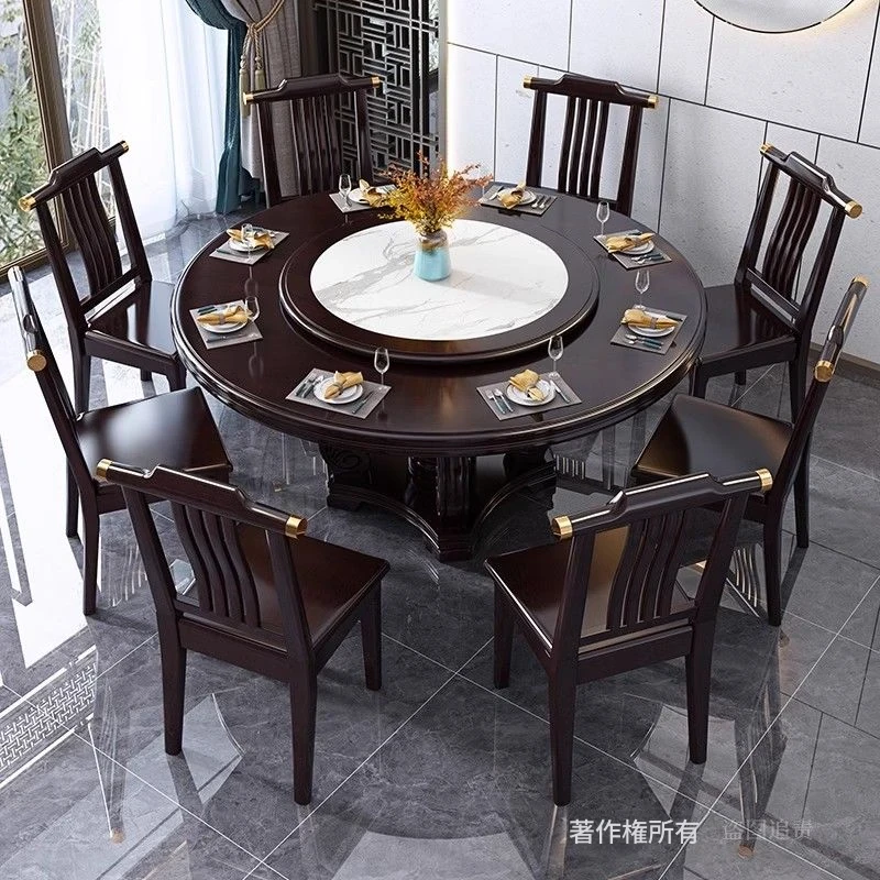 中華風の無垢材ダイニングテーブルセット - 高級感あふれる円形デザイン、家庭用・レストラン用に最適!電磁調理器対応、回転式テーブルで便利さ抜群!おしゃれで機能的な食卓を実現します。