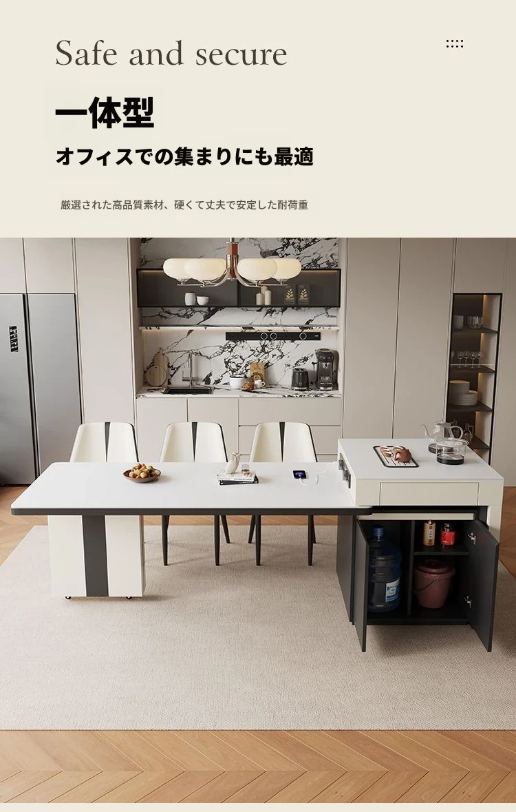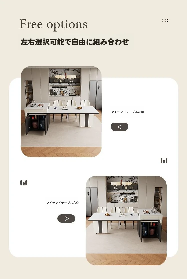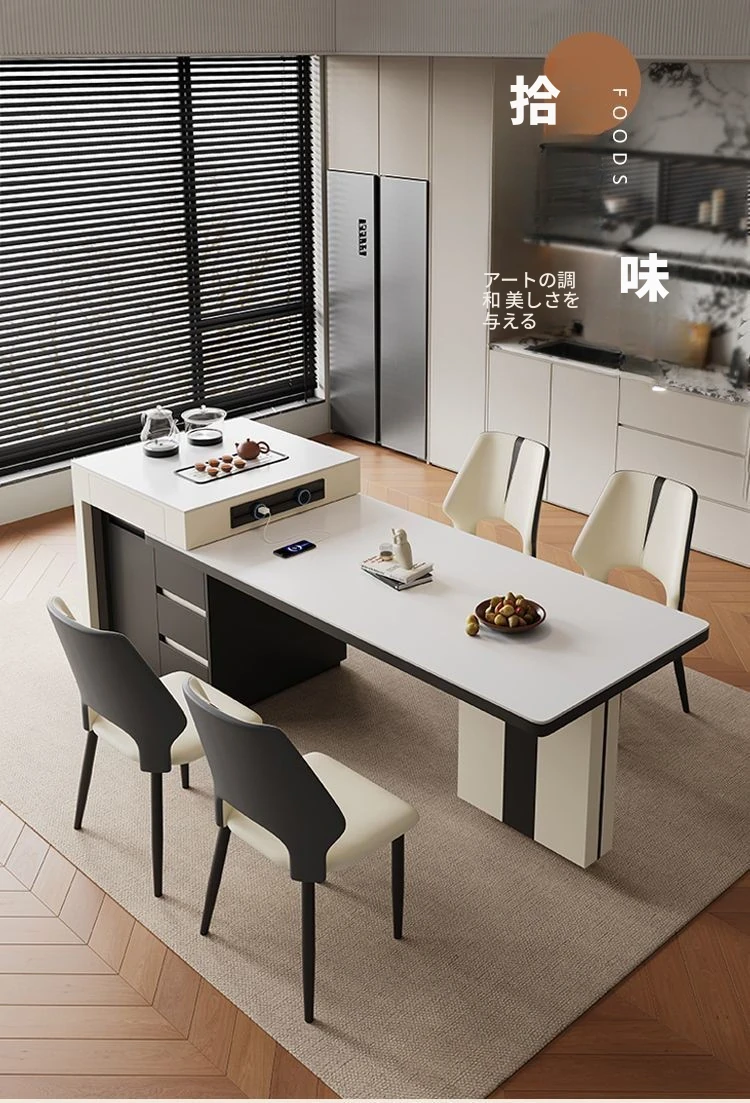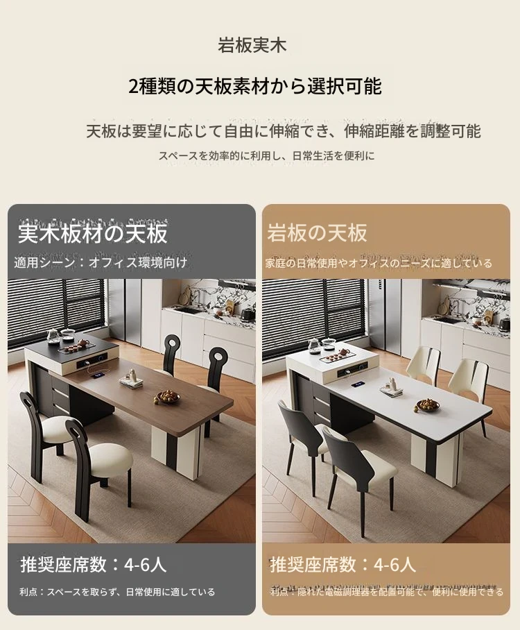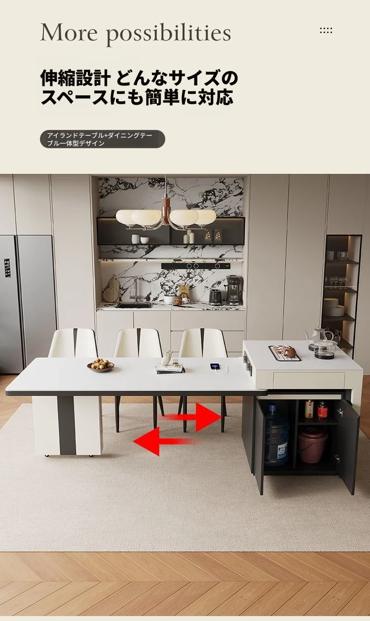 シンプルでラグジュアリーな伸縮式アイランドダイニングテーブル - 小型住宅に最適なモダンで多機能な食卓。高級感あふれるデザインで、食事をより特別なひとときに演出します!