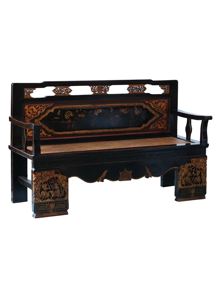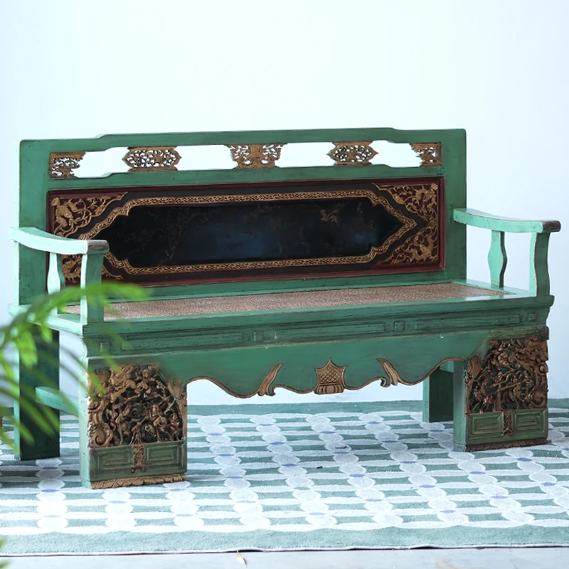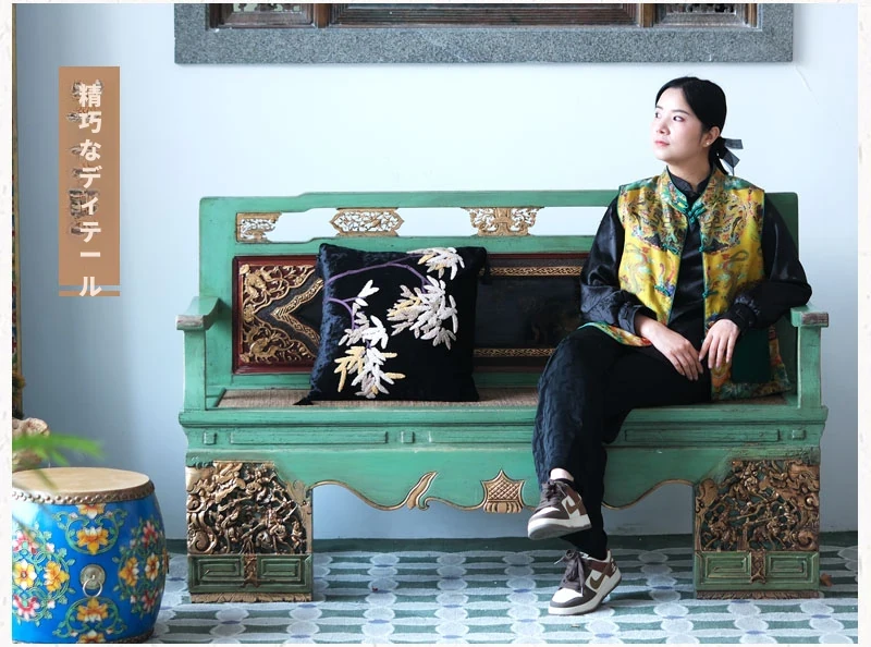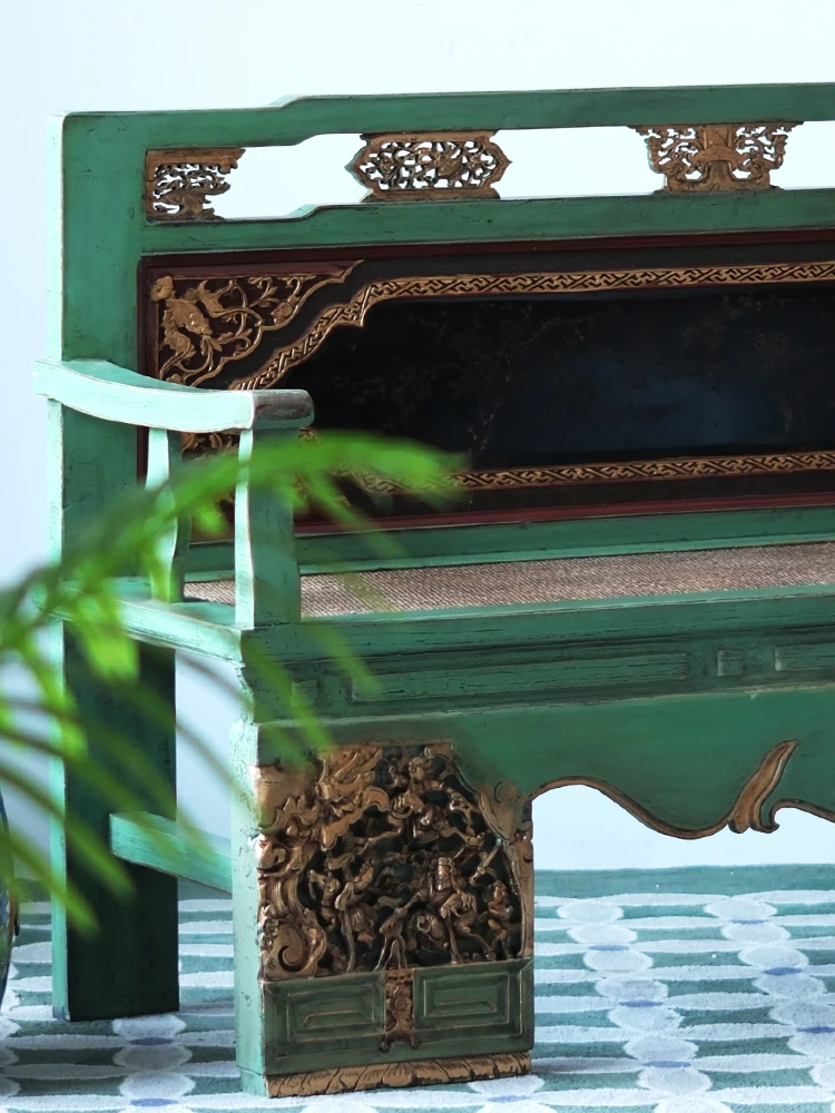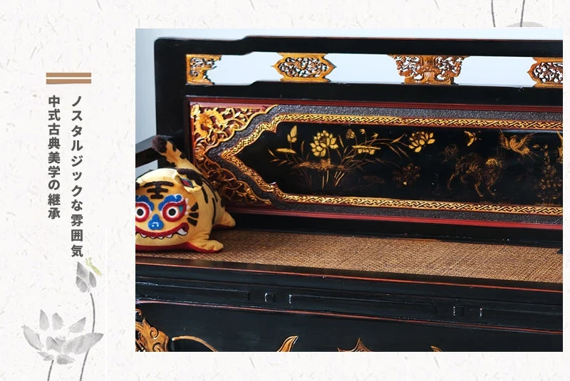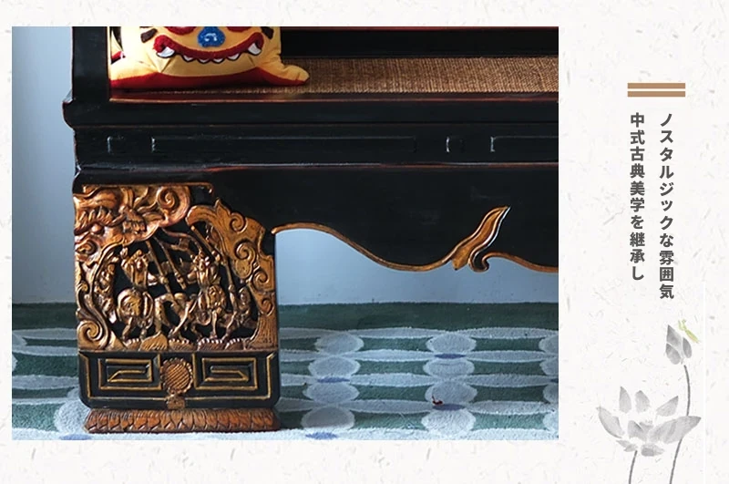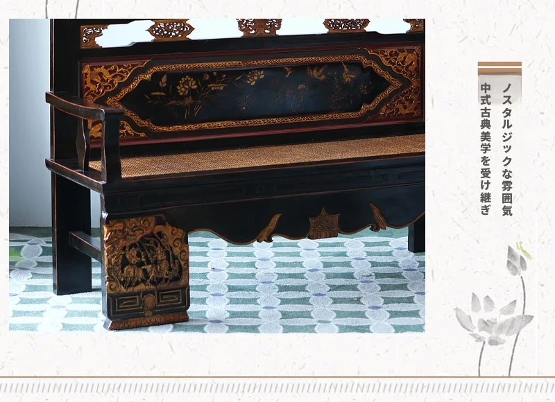 現代中式手描き実木ソファチェア、彫刻付きアームレストデザイン、アンティーク風仕上げの主役椅子。デザイナーアートチェアとして、優雅な空間を演出します。