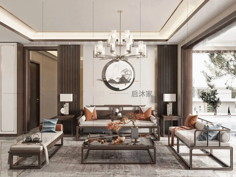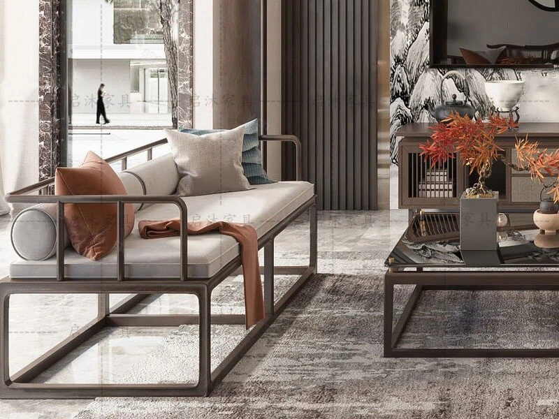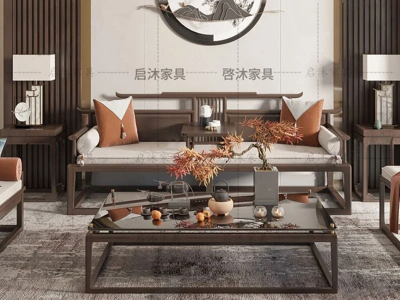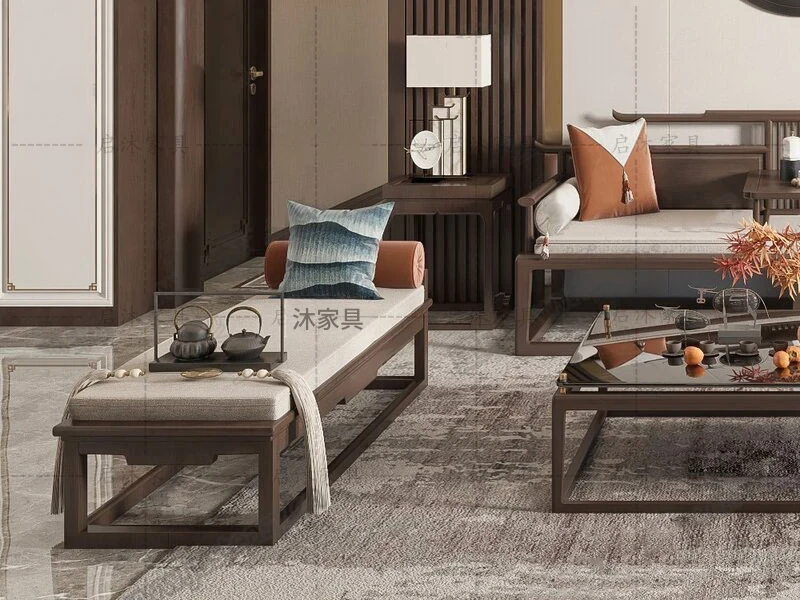 新中式デザインのソファ - 現代的でシンプルな無垢材とファブリックの組み合わせ、禅の雰囲気を醸し出す中国風のモデルルーム用リビング家具。おしゃれで心地よい空間を演出します!