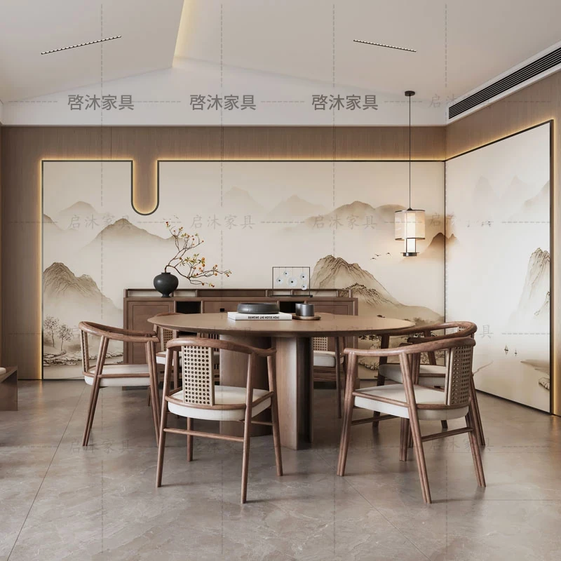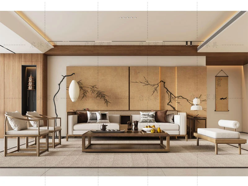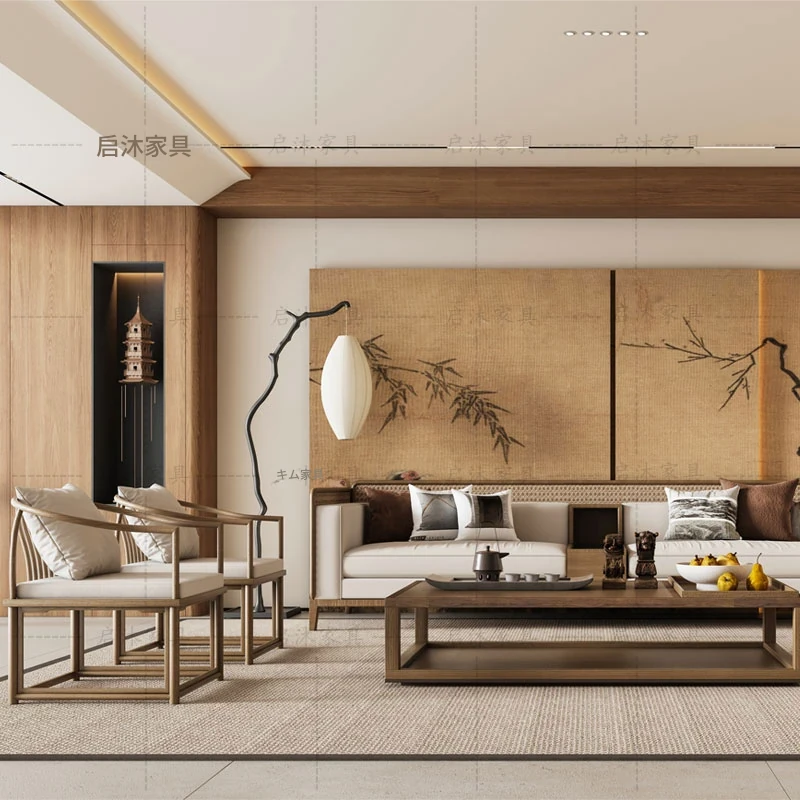 新中式スタイルの現代的なミニマリストデザイン!天然木とラタン編みのコンビネーションソファ、コンパクトな小型住宅やモデルルームに最適なデザイナーズ家具。スタイリッシュなインテリアを実現します!