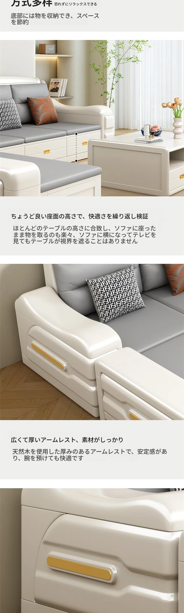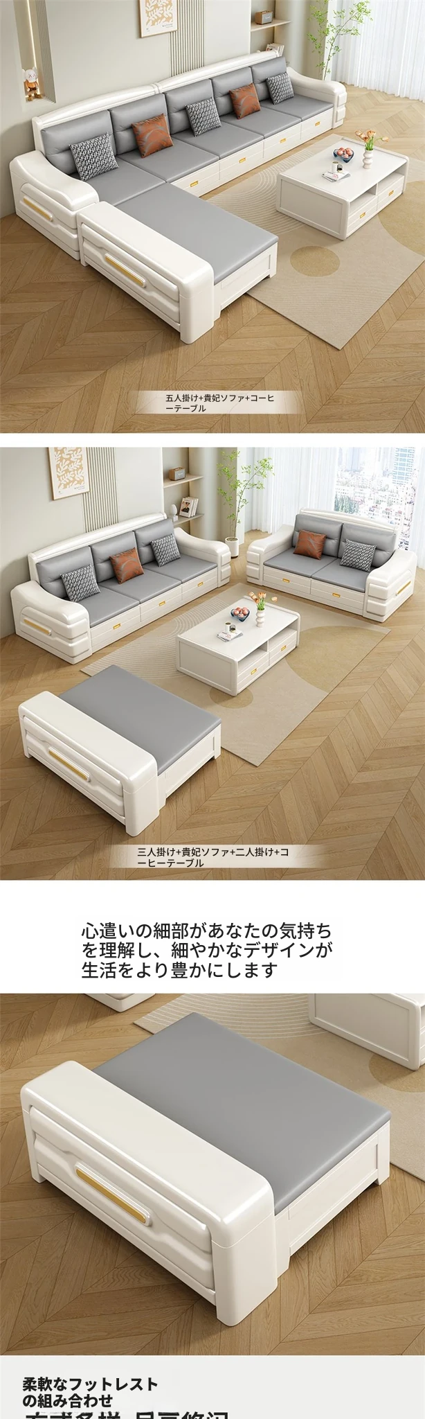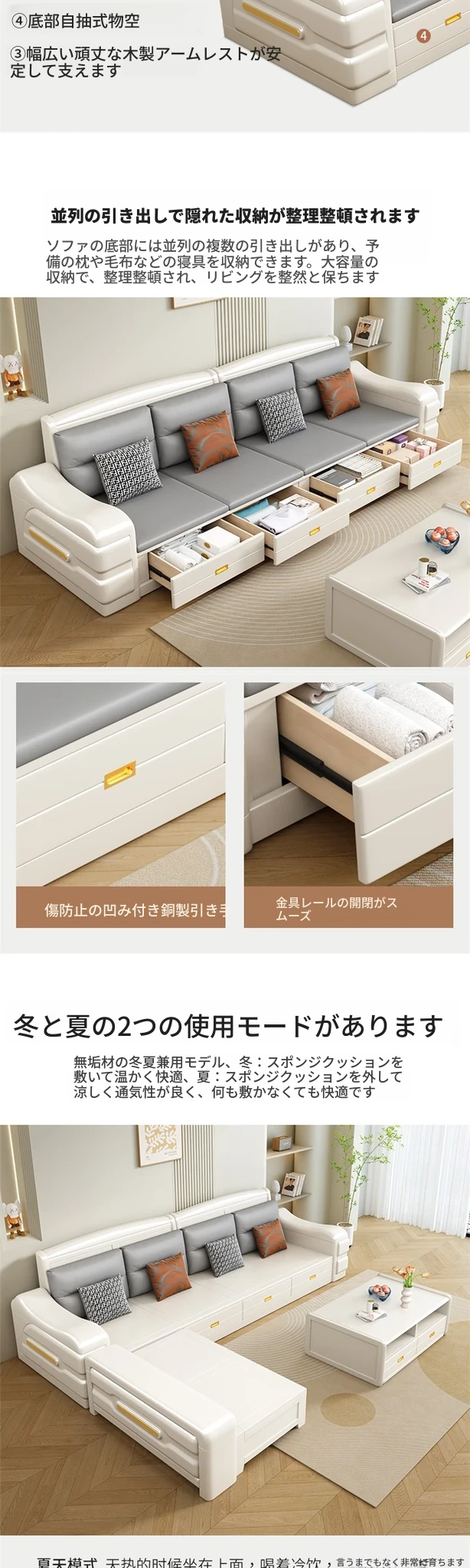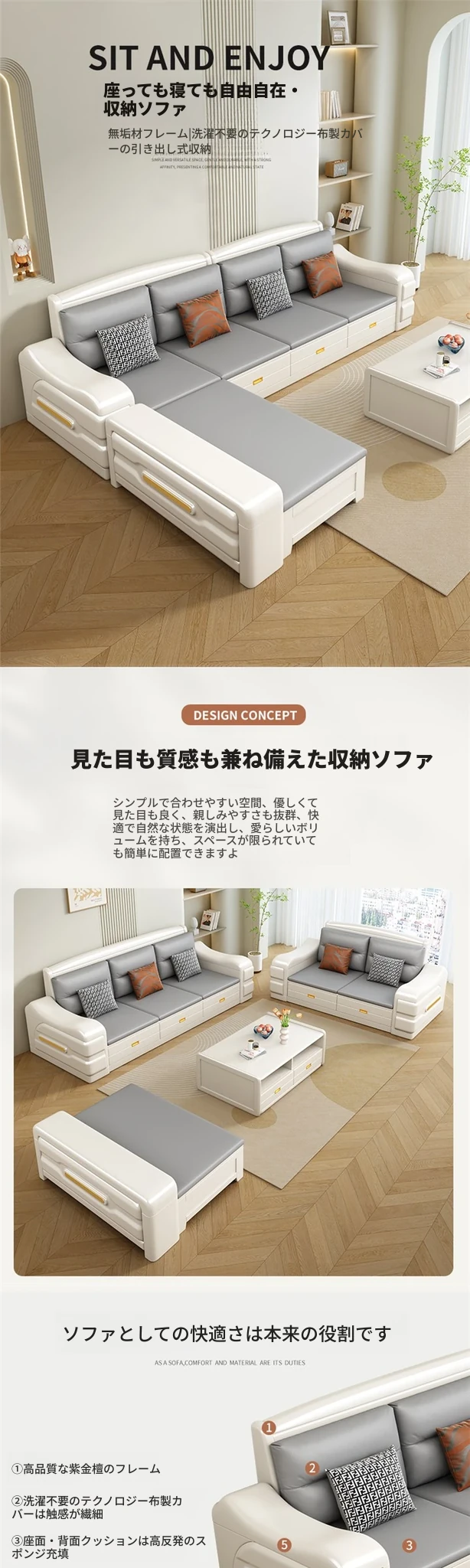 モダンデザインのウッドソファ|ホワイトファブリック|収納付き引き出し|冬夏両用のコーナーカウチ|リビングに最適なシンプルでスタイリッシュな一品!