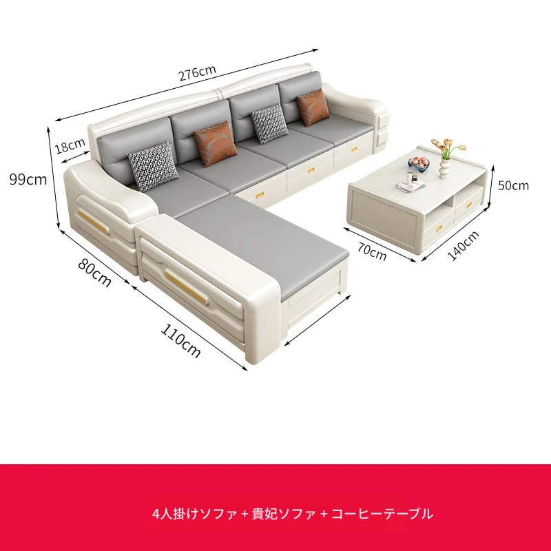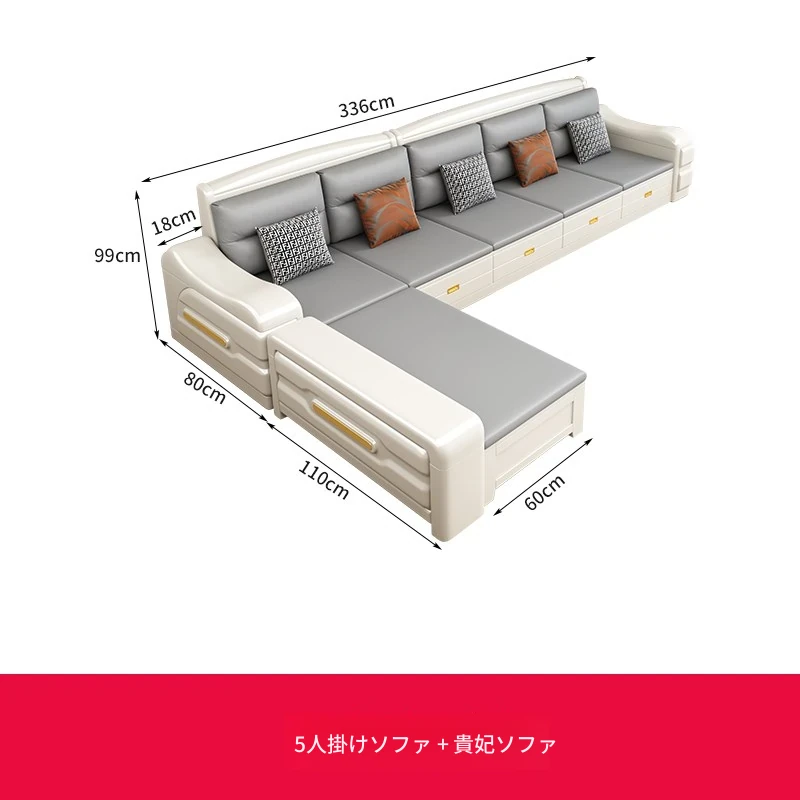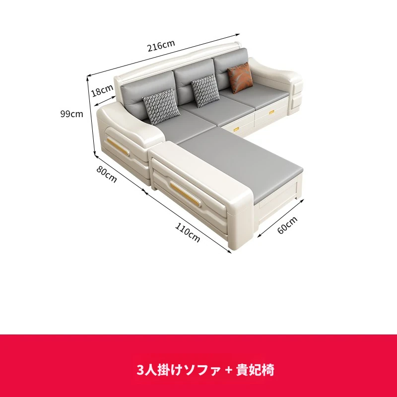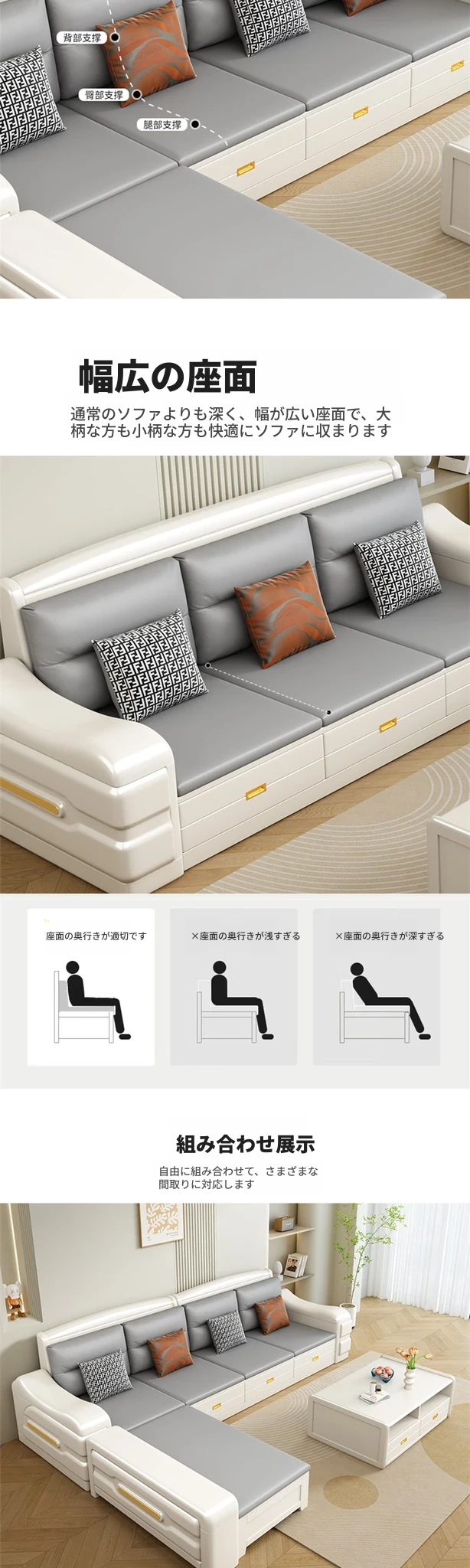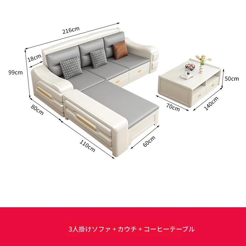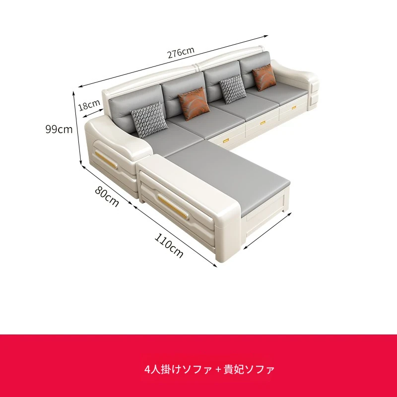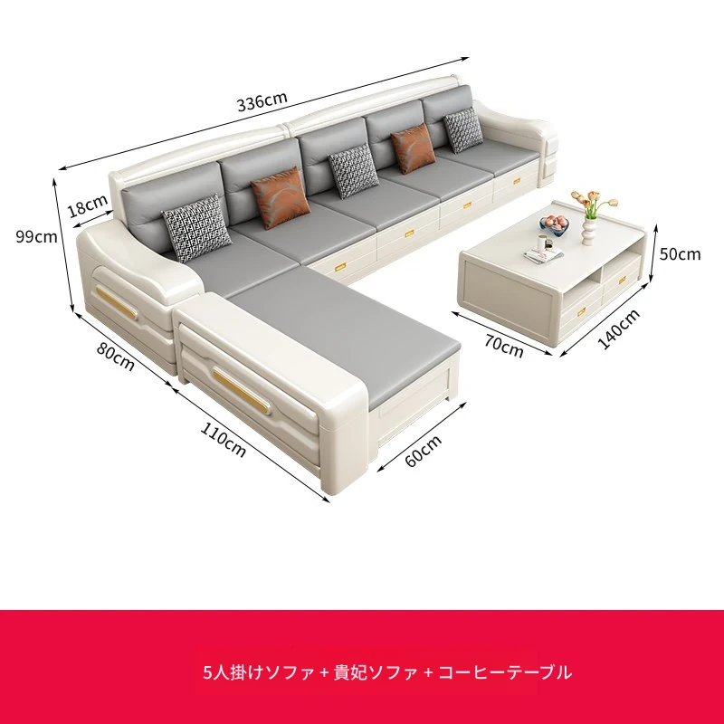 モダンデザインのウッドソファ|ホワイトファブリック|収納付き引き出し|冬夏両用のコーナーカウチ|リビングに最適なシンプルでスタイリッシュな一品!