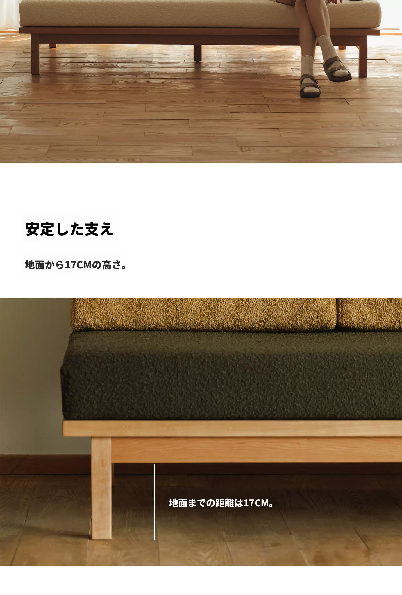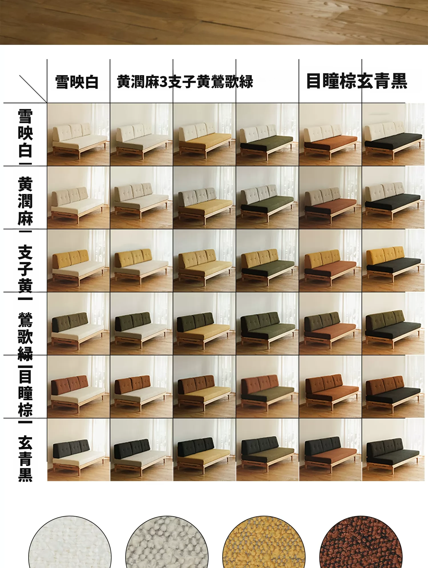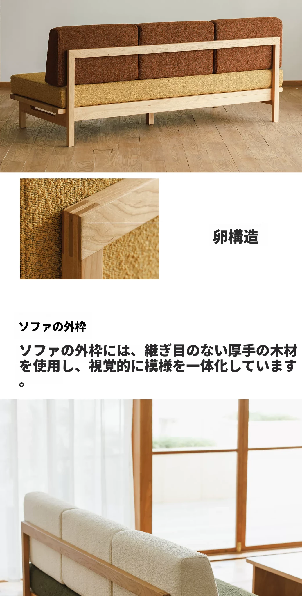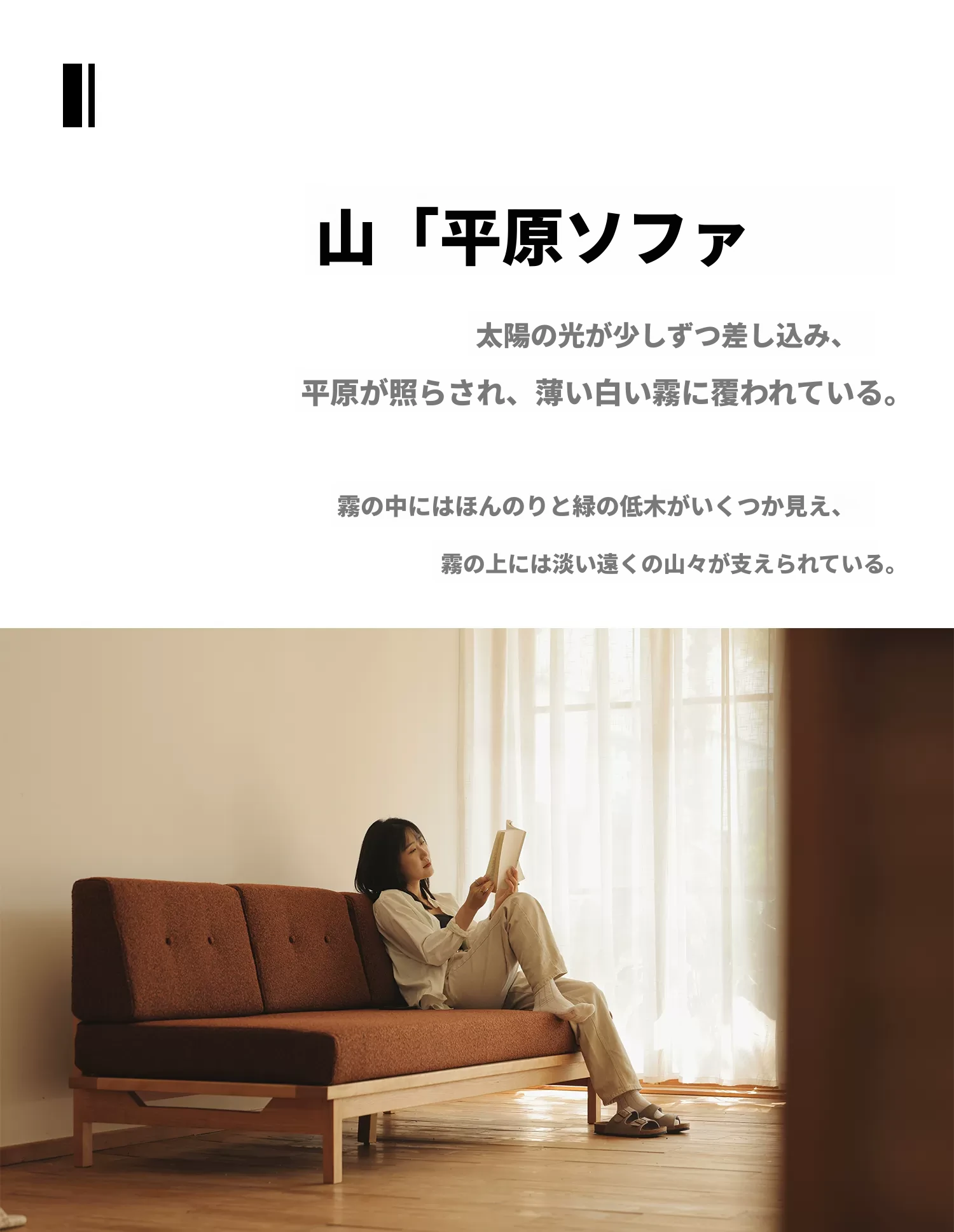 山の平原ソファー - 和風チェリーウッド無肘の天然木製ソファ、レトロスタイルのリビングルームにぴったりなファブリックコットンリネン素材。心地よいくつろぎを演出します!