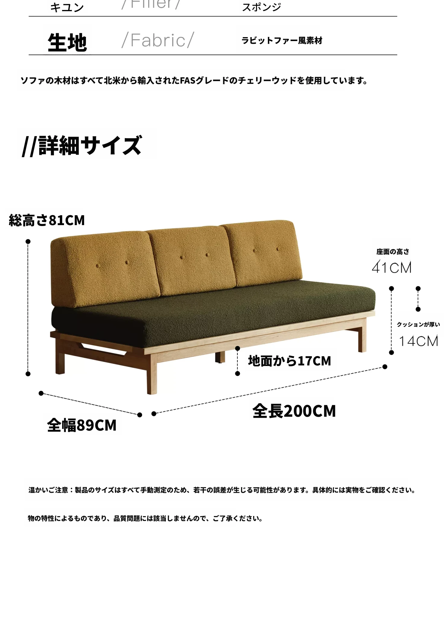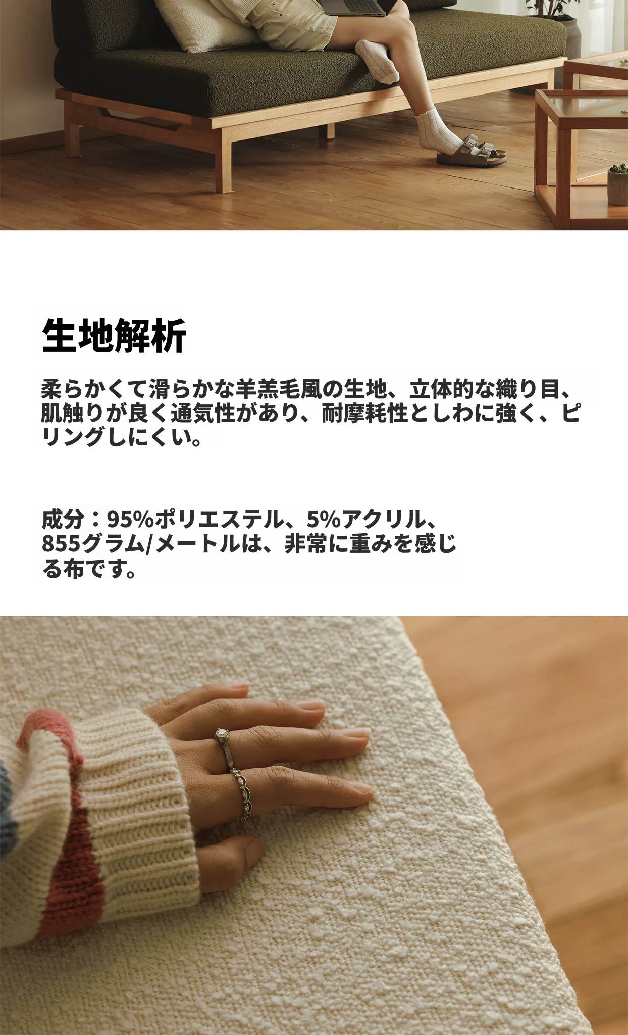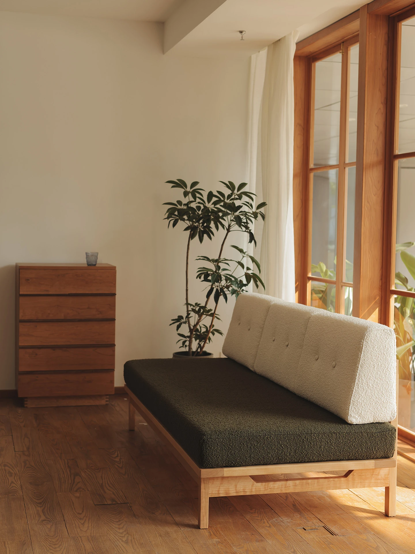 山の平原ソファー - 和風チェリーウッド無肘の天然木製ソファ、レトロスタイルのリビングルームにぴったりなファブリックコットンリネン素材。心地よいくつろぎを演出します!