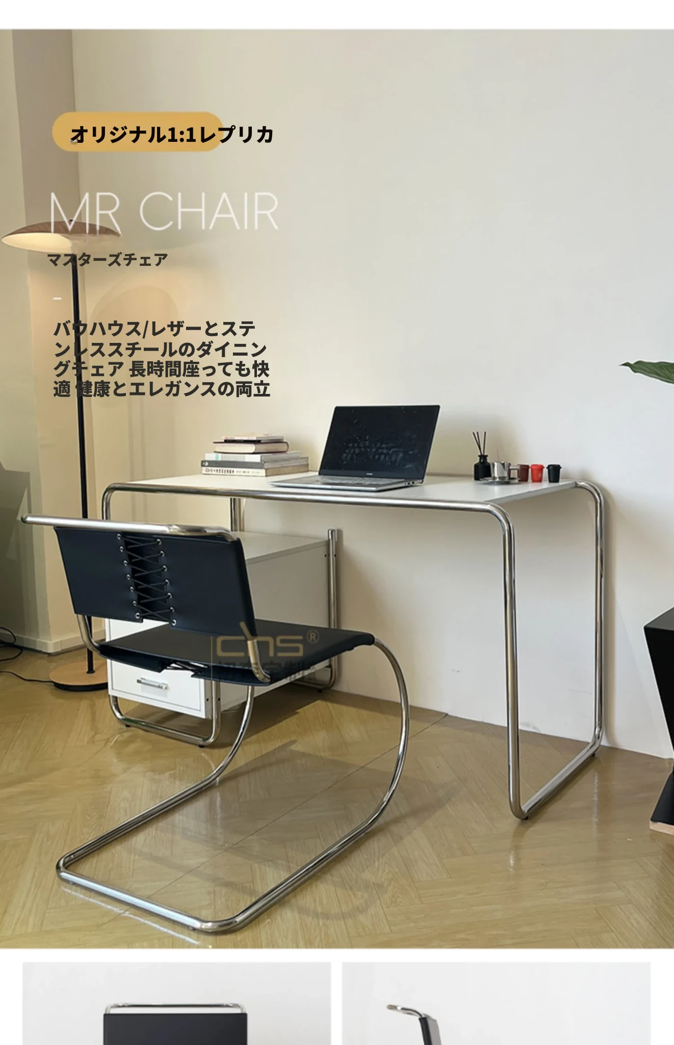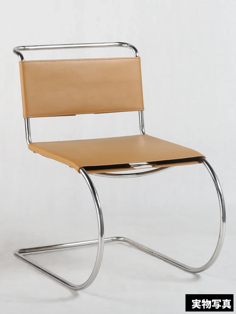 初森MRチェア - バウハウススタイルのインダストリアルデザイン、厚手レザー背もたれとステンレススチールパイプ使用のダイニングチェア。おしゃれで耐久性抜群、あなたのインテリアにぴったりの一品!
