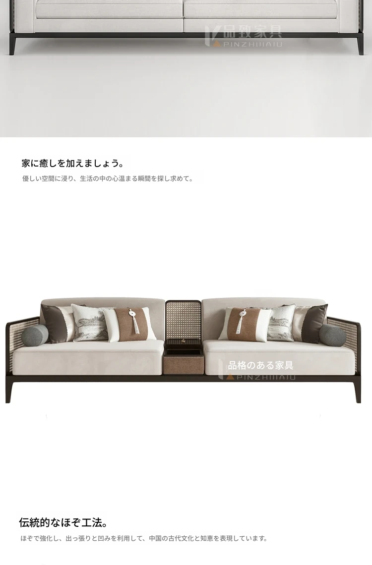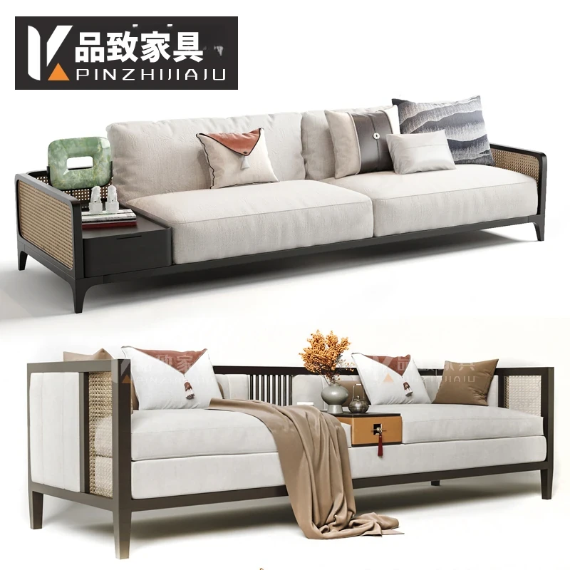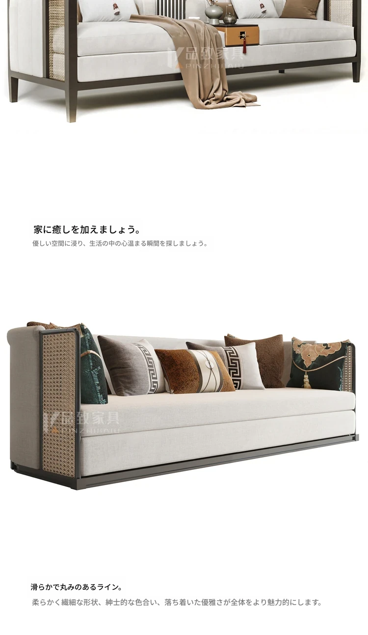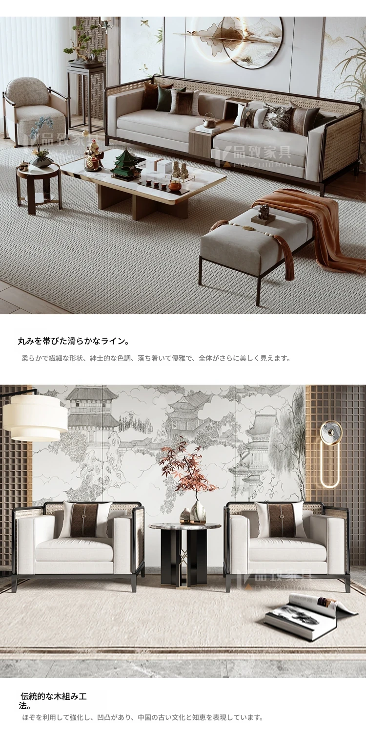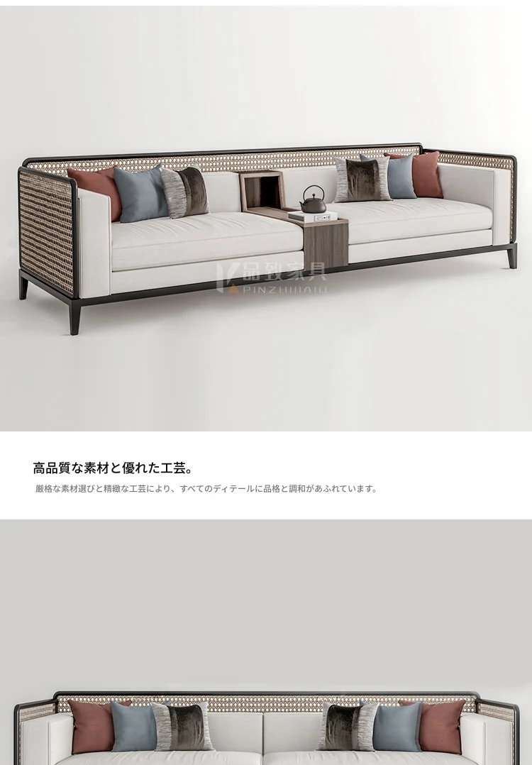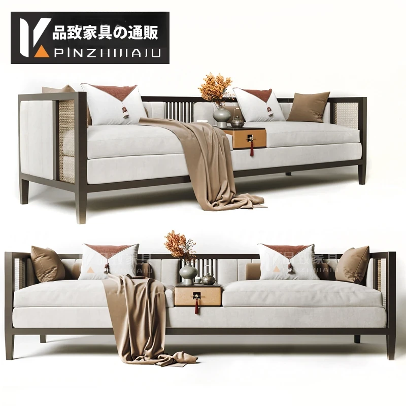 新中式スタイルの3人掛けソファ、無垢材とラタン編みの北欧モダンな侘び寂び風。ホテルや会所、客室のモデルルームに最適なカウンター席!心地よい空間を演出します。