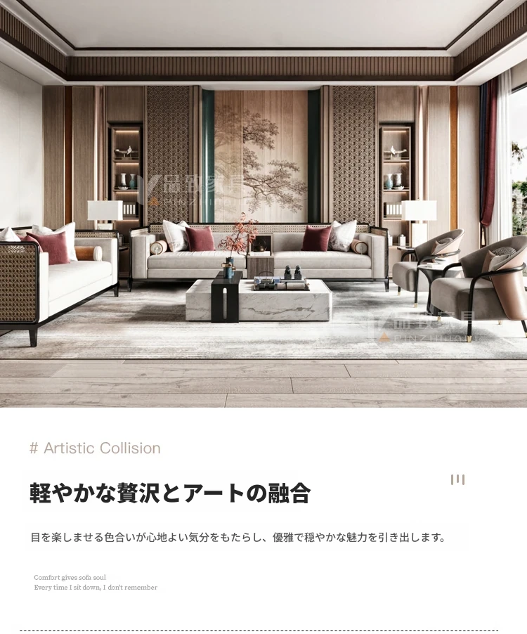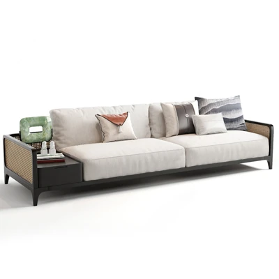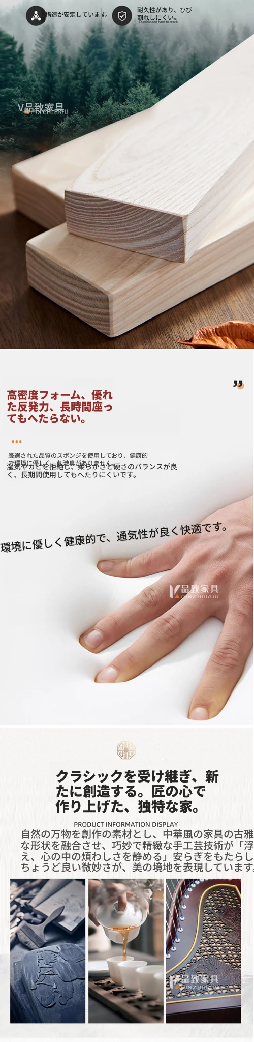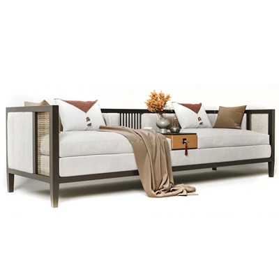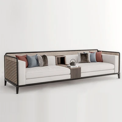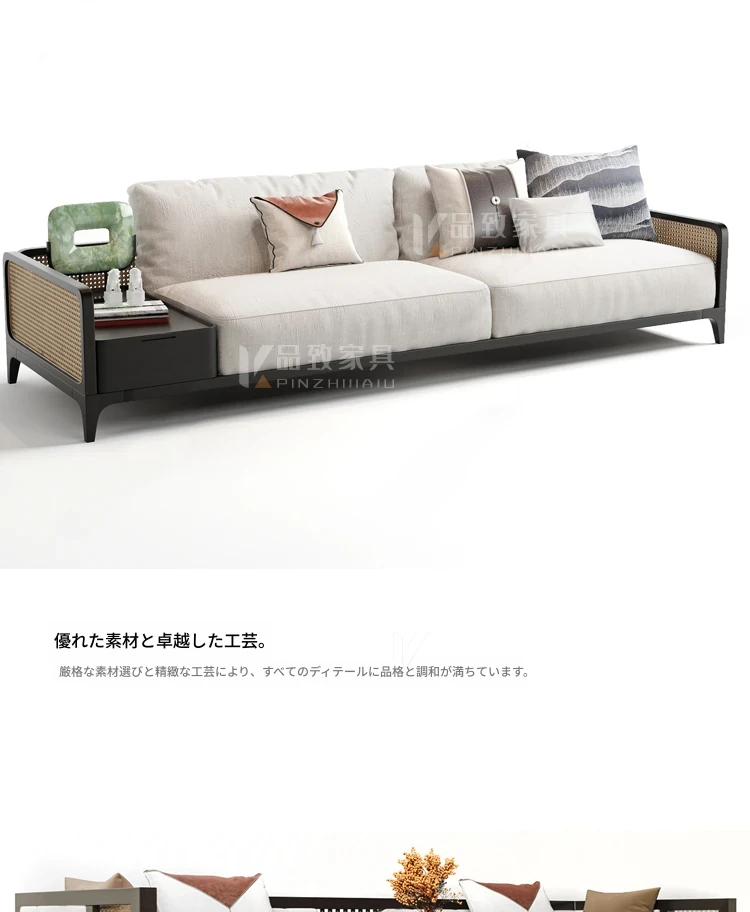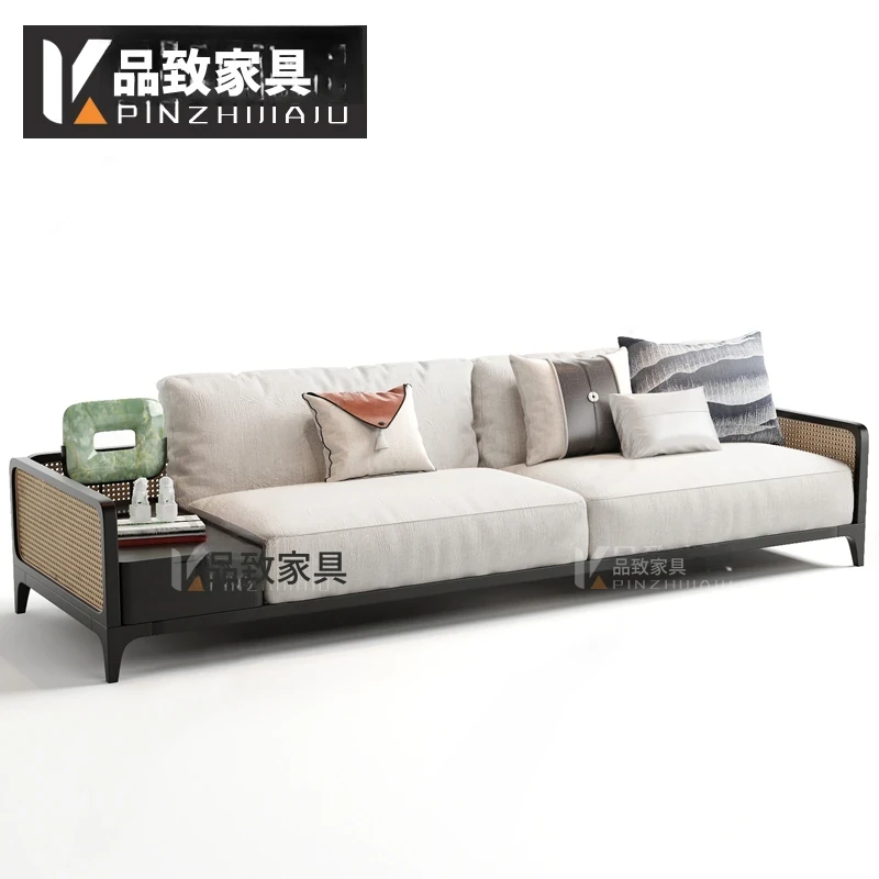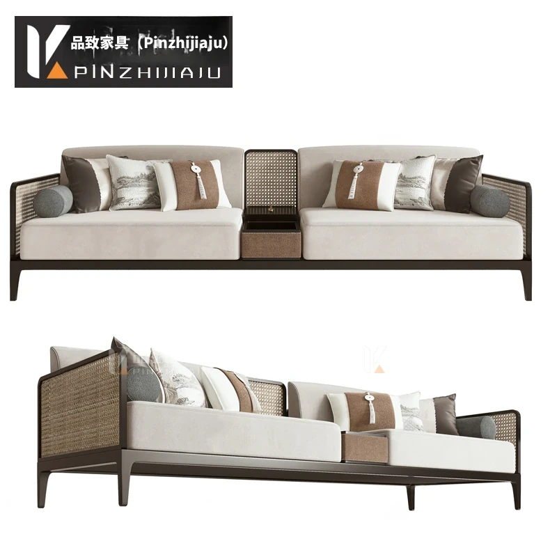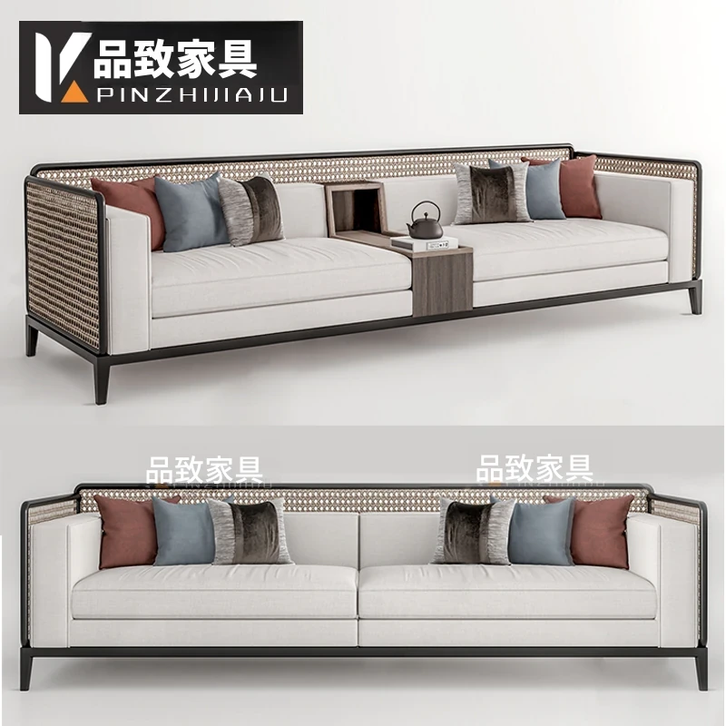 新中式スタイルの3人掛けソファ、無垢材とラタン編みの北欧モダンな侘び寂び風。ホテルや会所、客室のモデルルームに最適なカウンター席!心地よい空間を演出します。