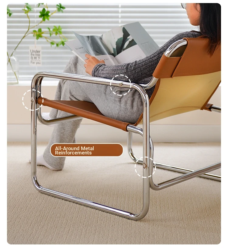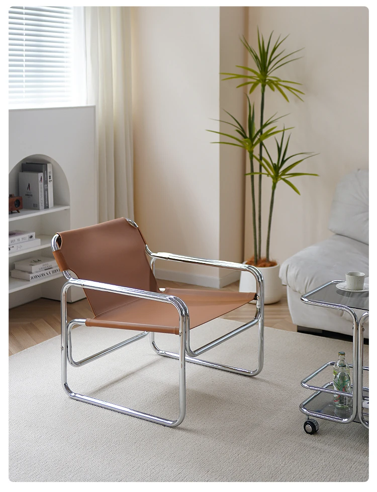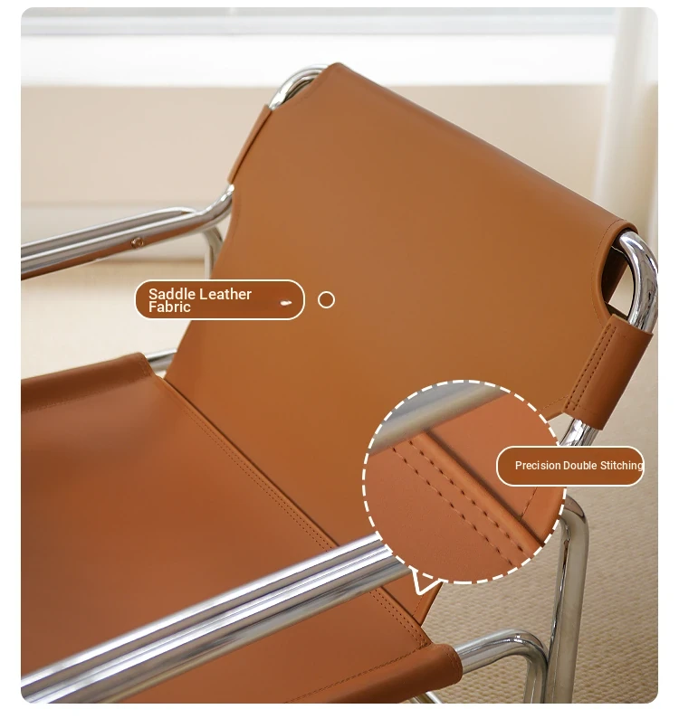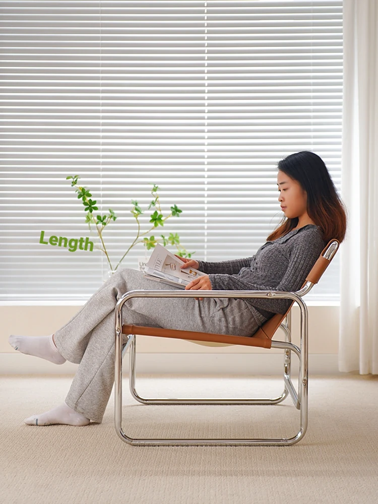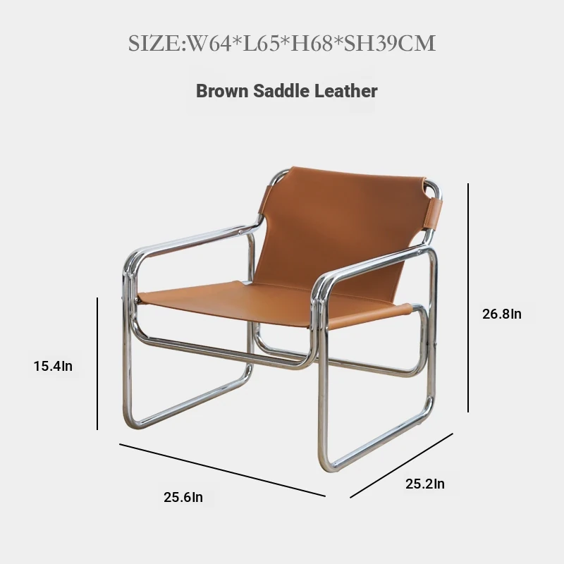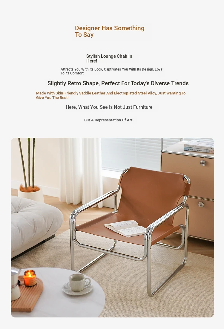 Nordic Vintage Leisure Chair - Modern Designer Lounge Chair with Stainless Steel Armrests and Saddle Leather Upholstery for a Chic Living Room Aesthetic