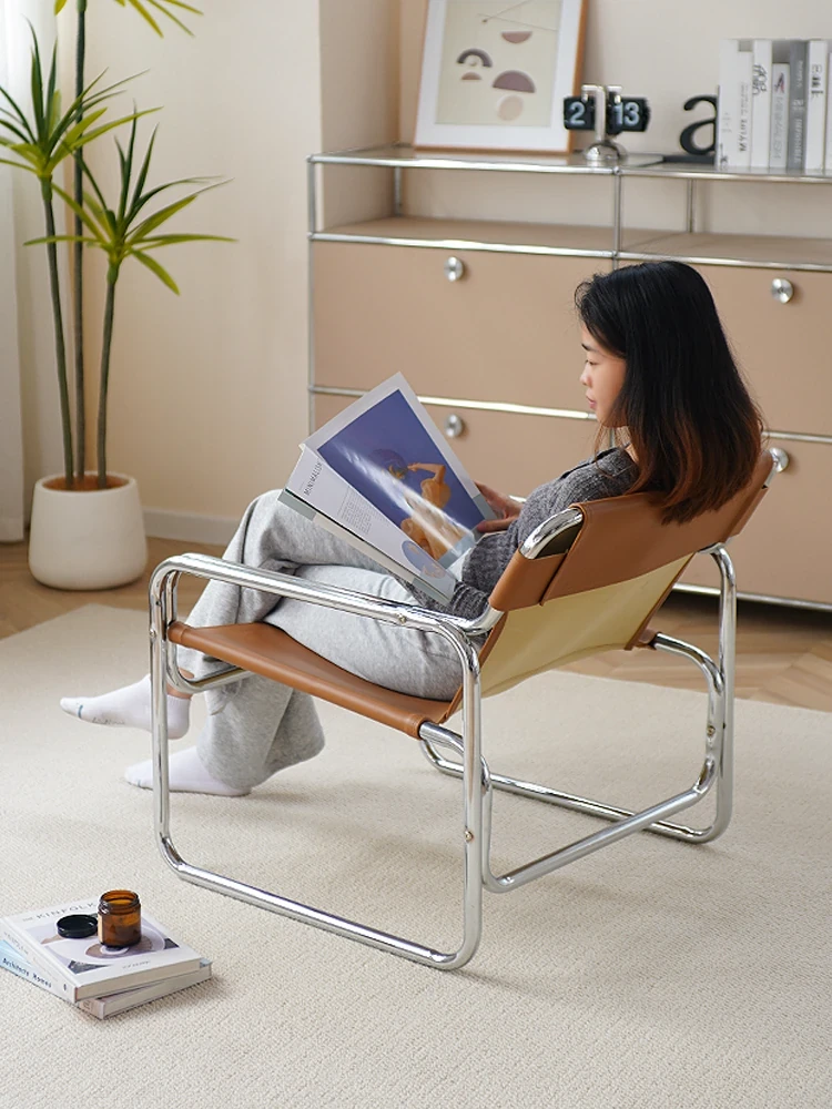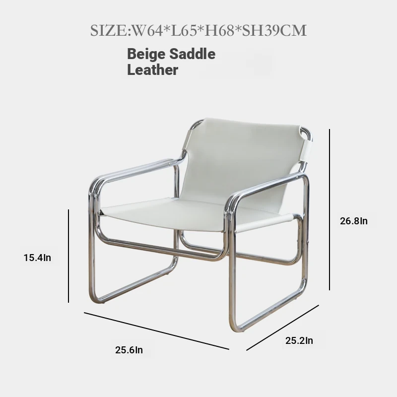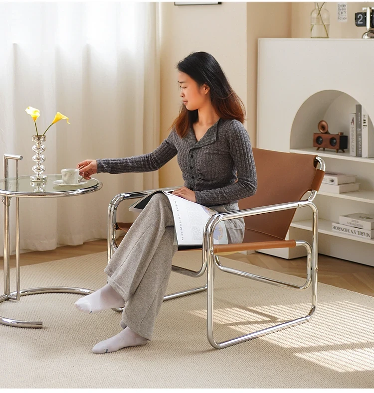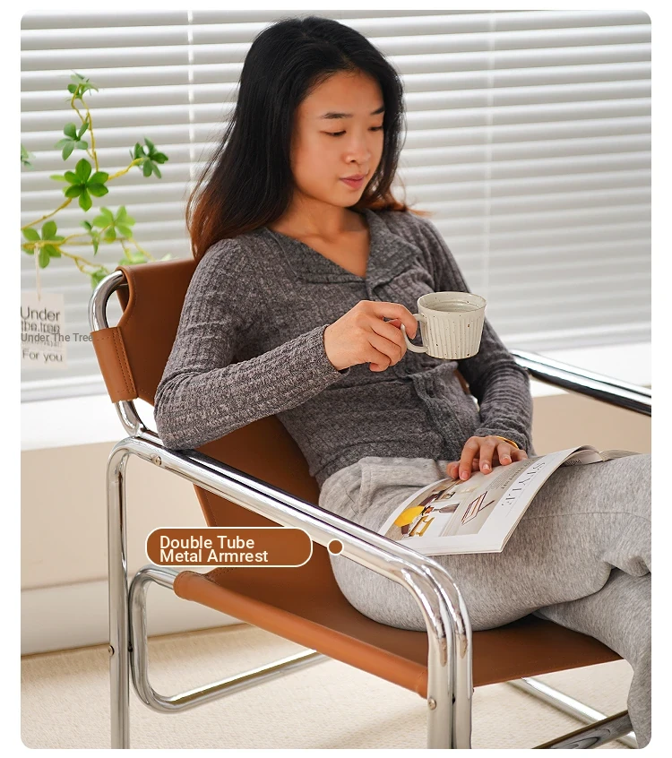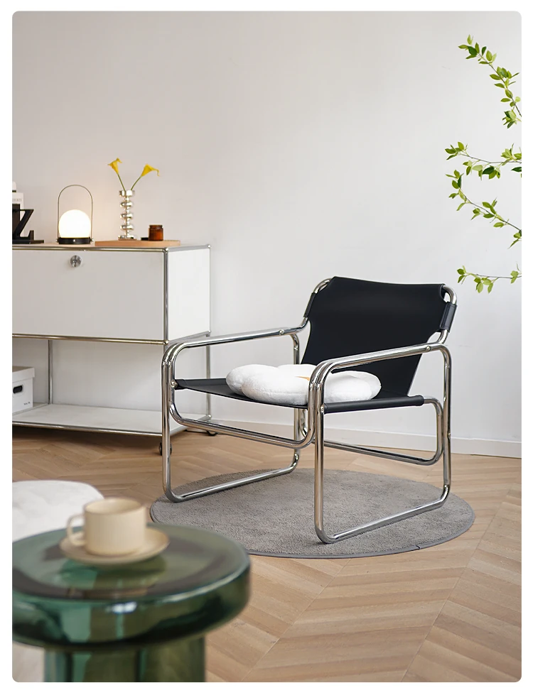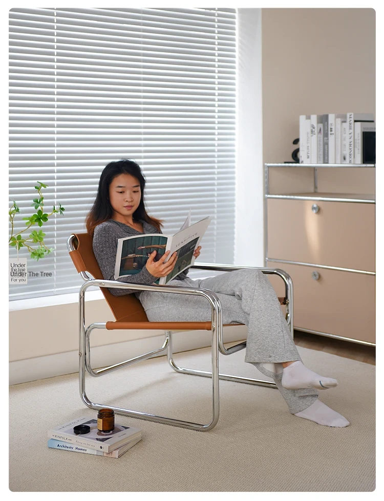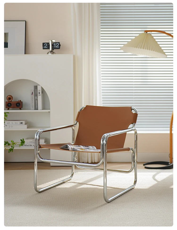 Nordic Vintage Leisure Chair - Modern Designer Lounge Chair with Stainless Steel Armrests and Saddle Leather Upholstery for a Chic Living Room Aesthetic