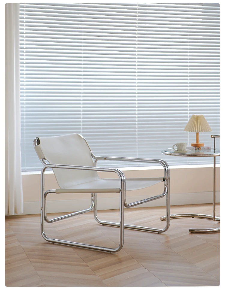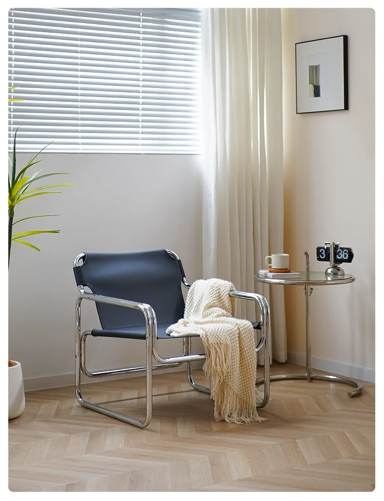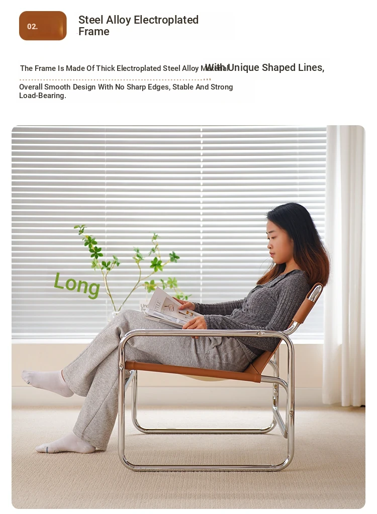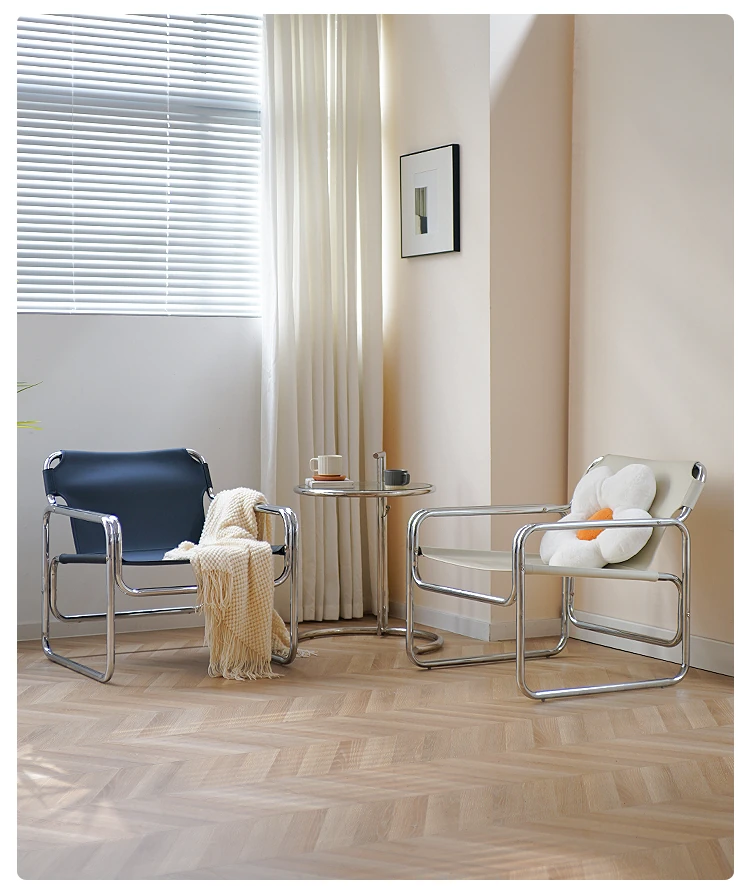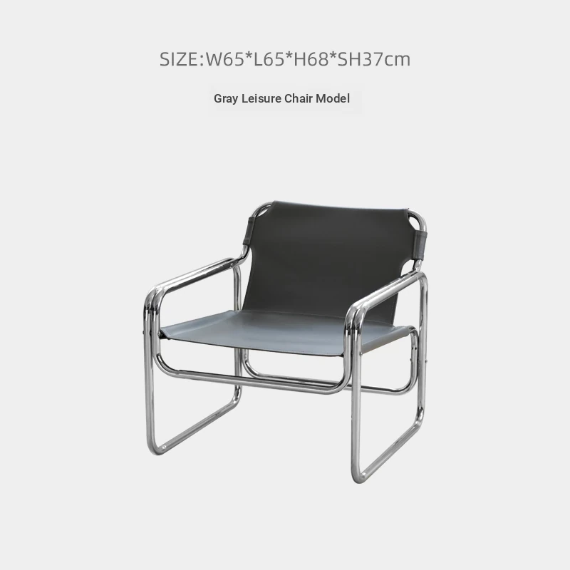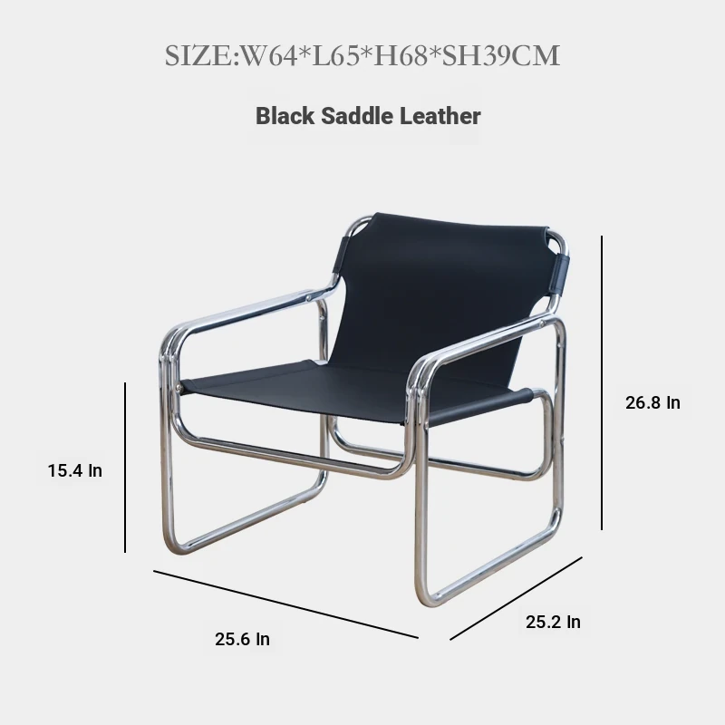 Nordic Vintage Leisure Chair - Modern Designer Lounge Chair with Stainless Steel Armrests and Saddle Leather Upholstery for a Chic Living Room Aesthetic