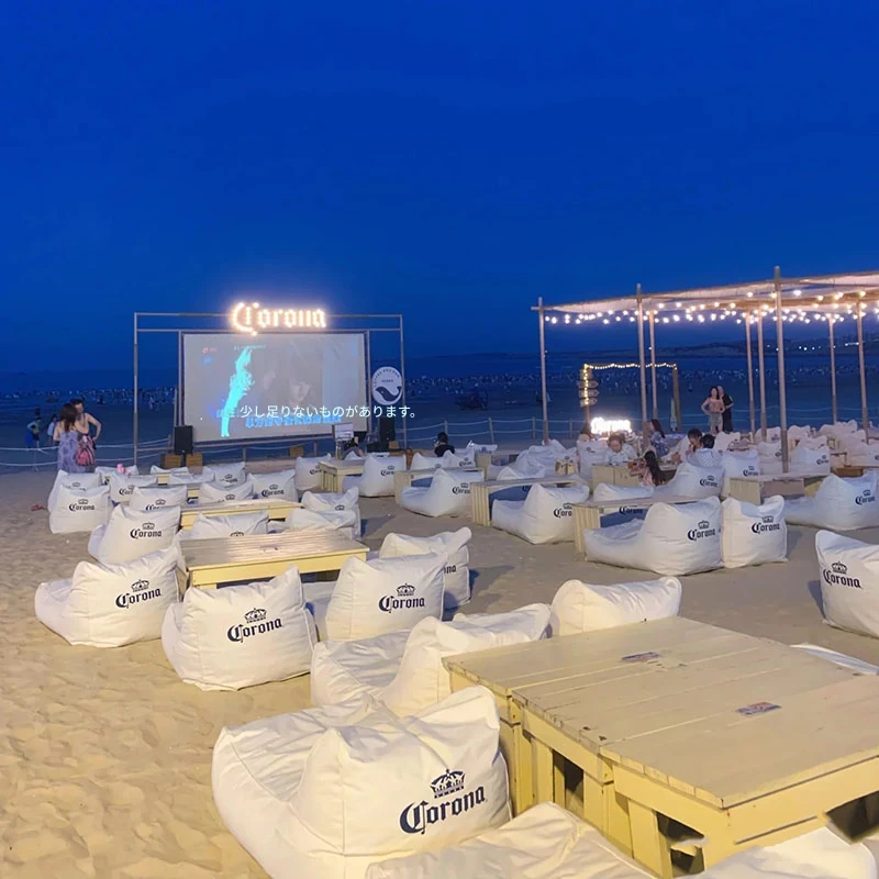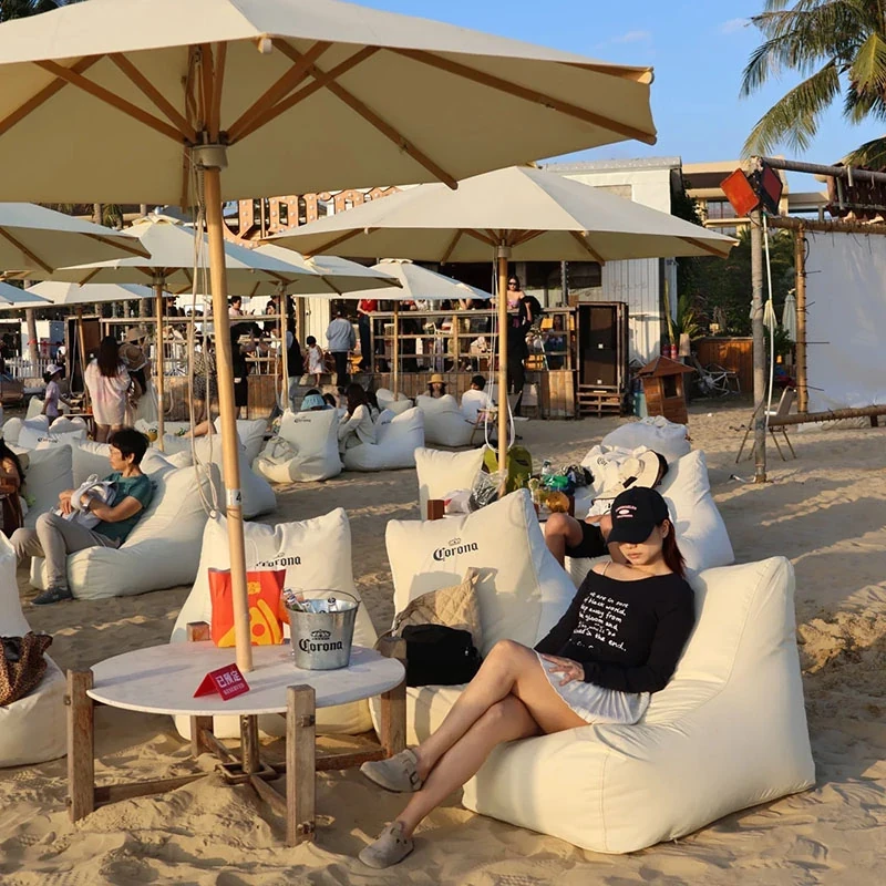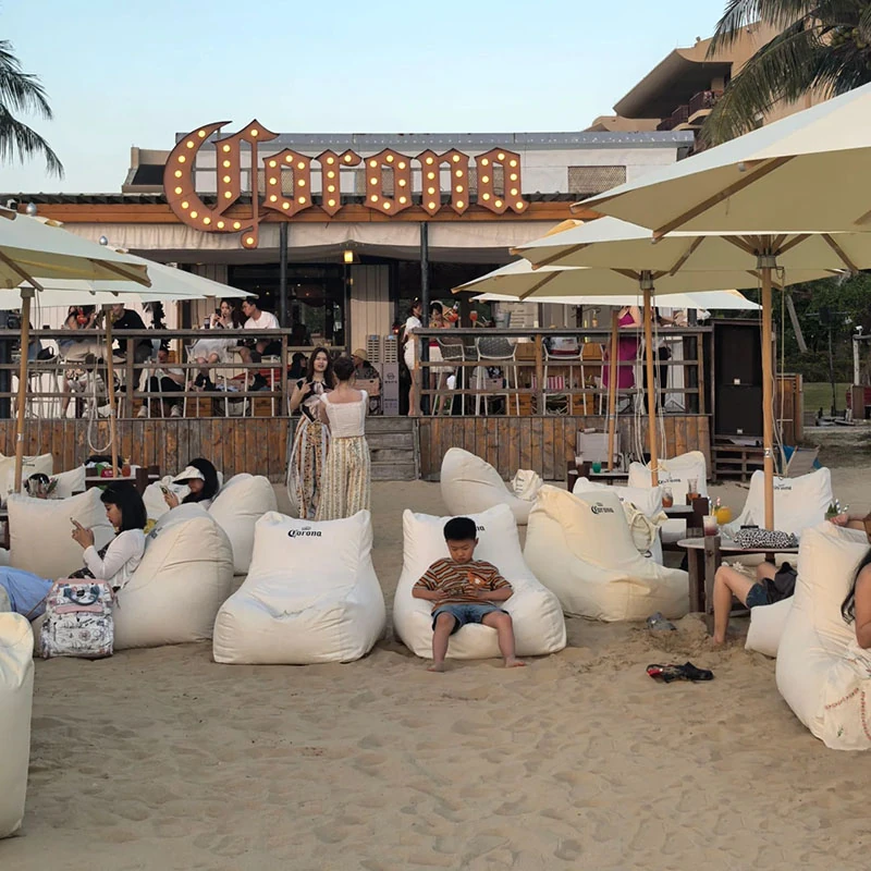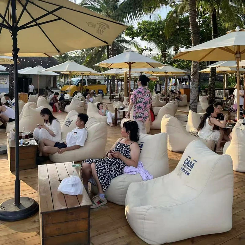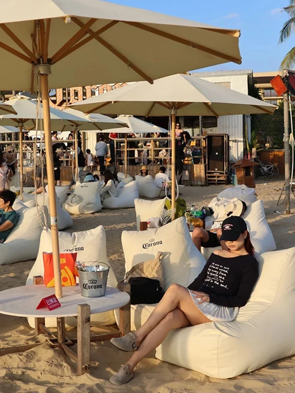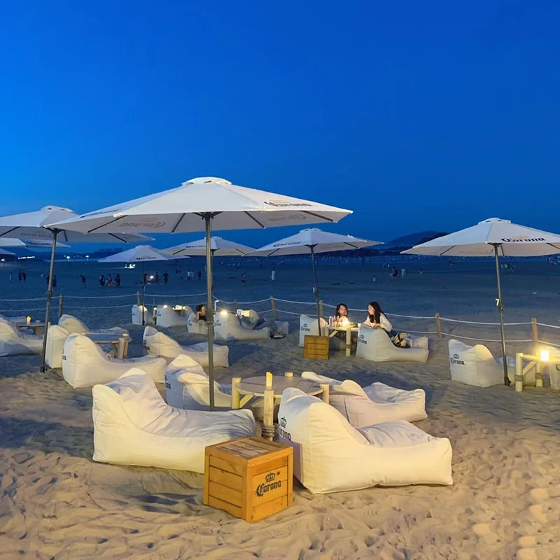 アウトドア防水・UVカットのリラックスソファセット!ビーチやバーに最適なサンシェードと豆袋クッション付き。寝転んだり、くつろいだり、あなたのスタイルに合わせてお使い頂けます。ロゴ印刷も可能!