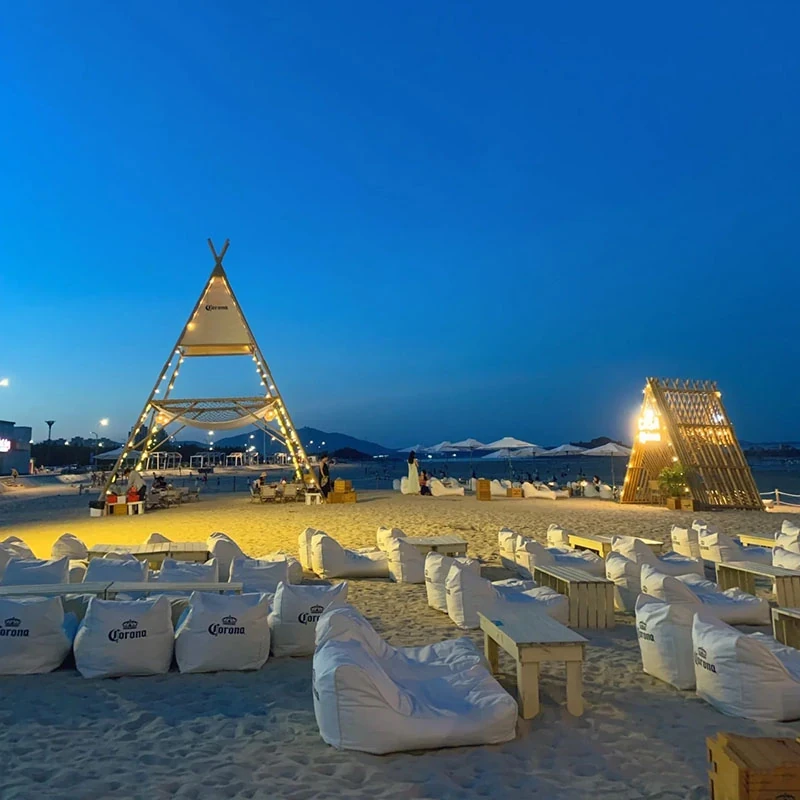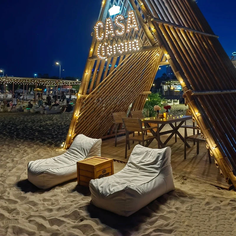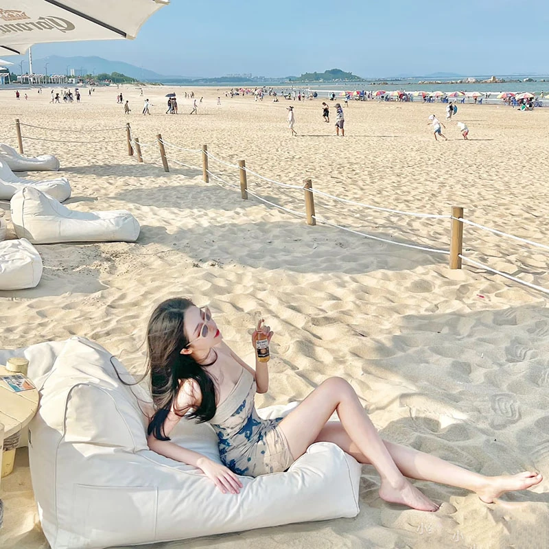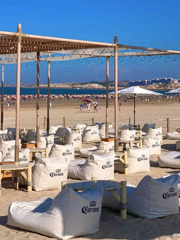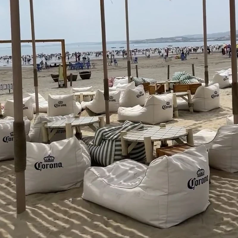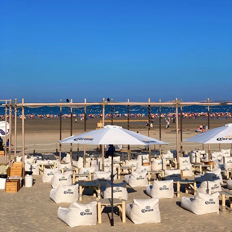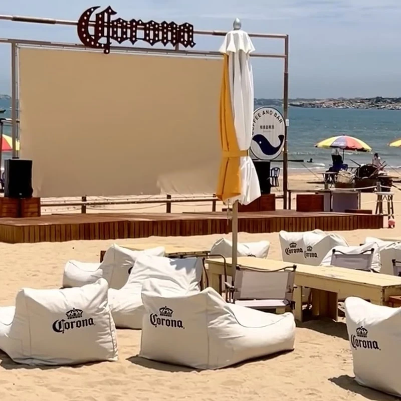 アウトドア防水・UVカットのリラックスソファセット!ビーチやバーに最適なサンシェードと豆袋クッション付き。寝転んだり、くつろいだり、あなたのスタイルに合わせてお使い頂けます。ロゴ印刷も可能!