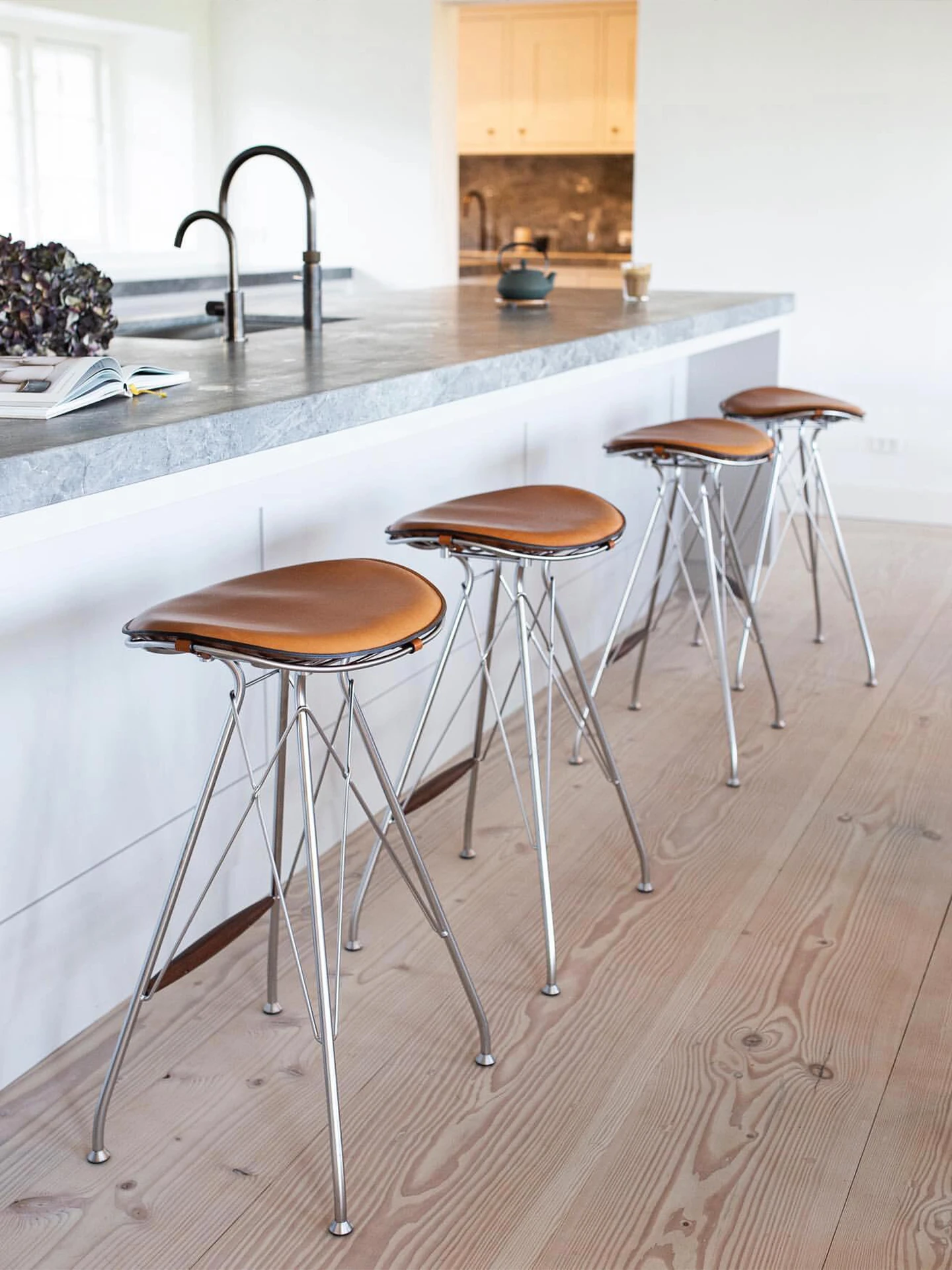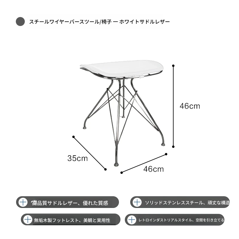 スツール-白のサドルレザー+ステンレススチールの素地の脚