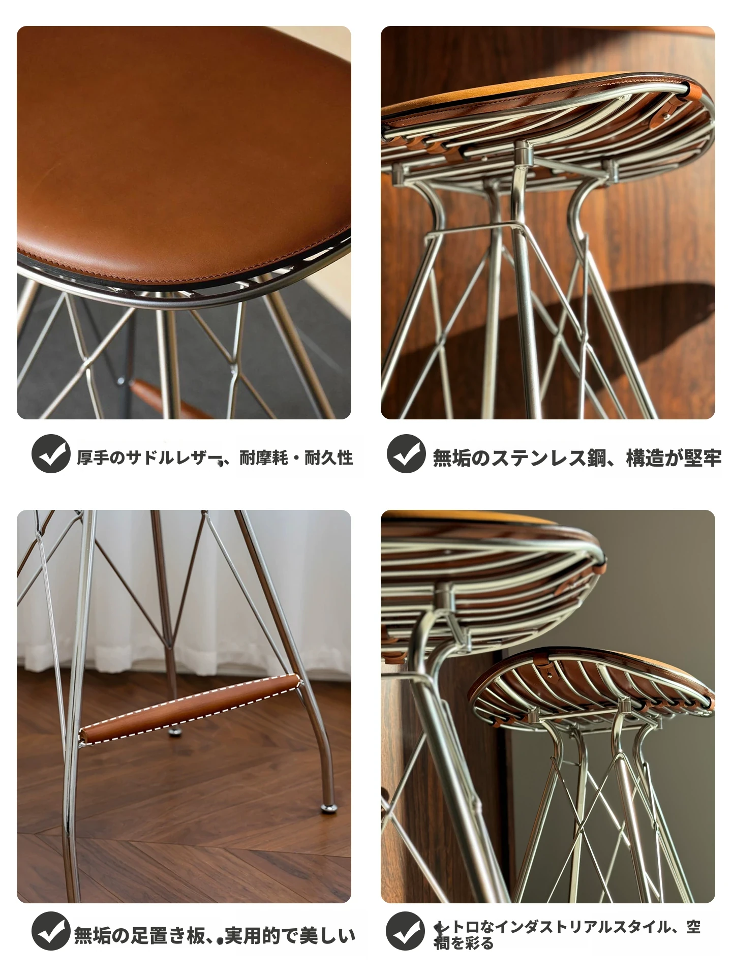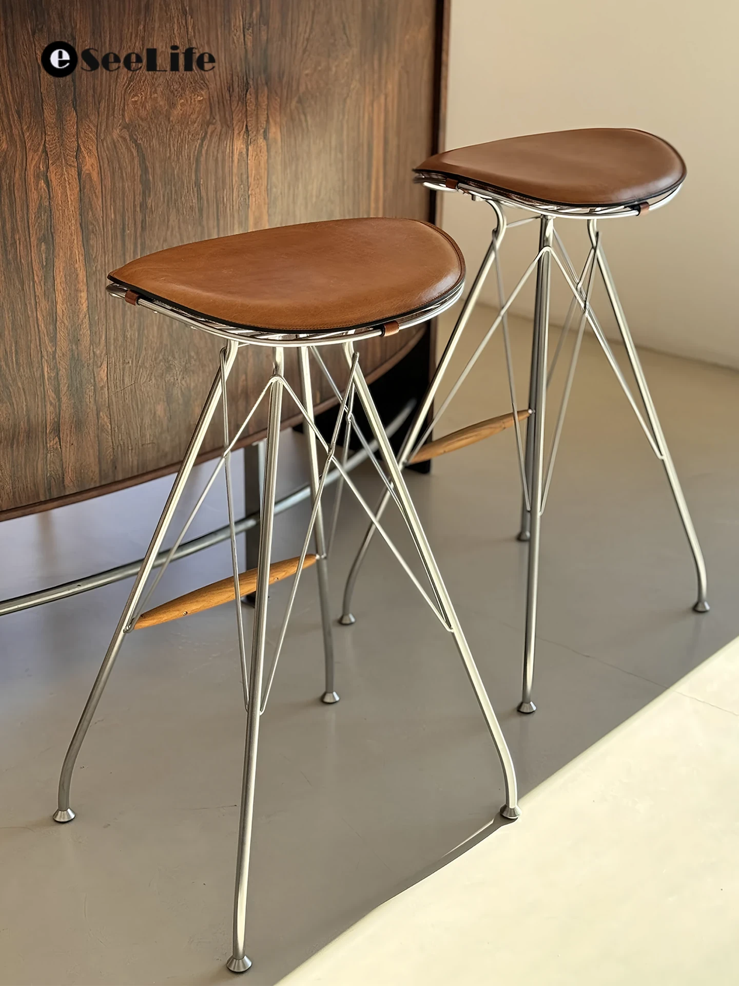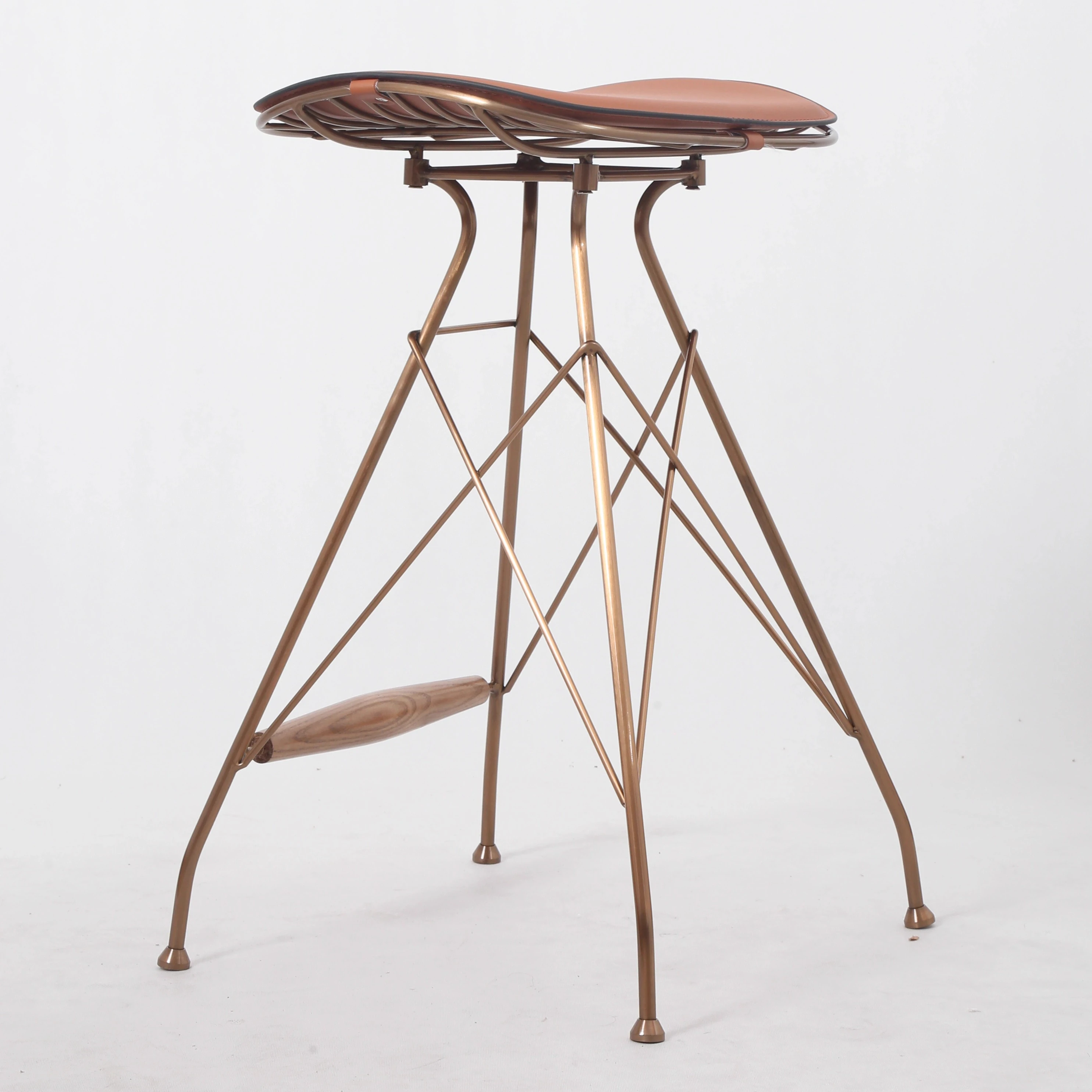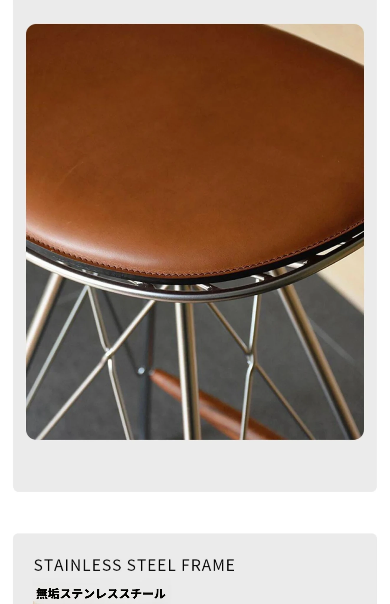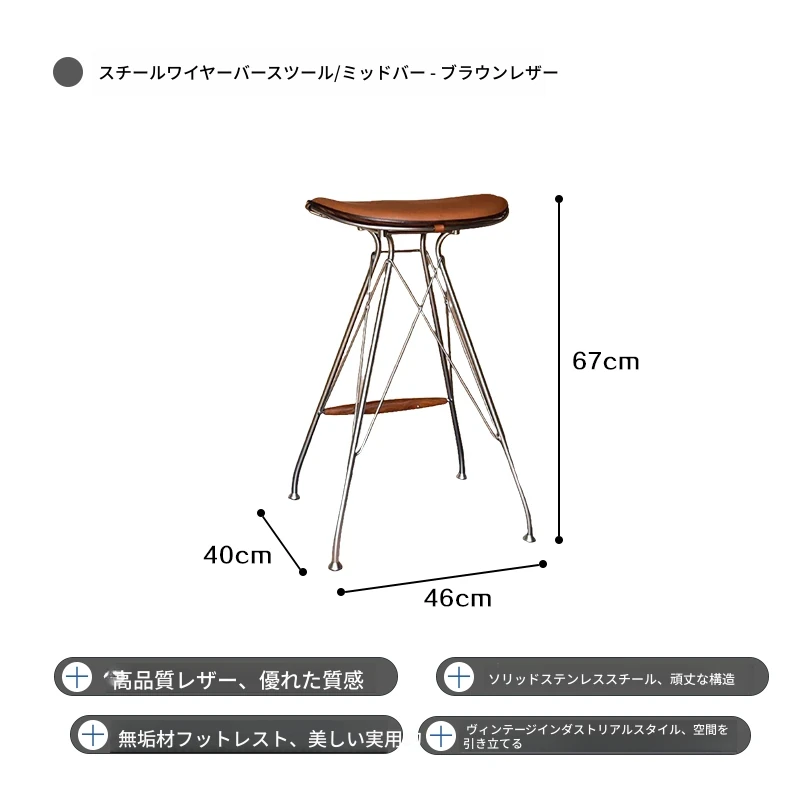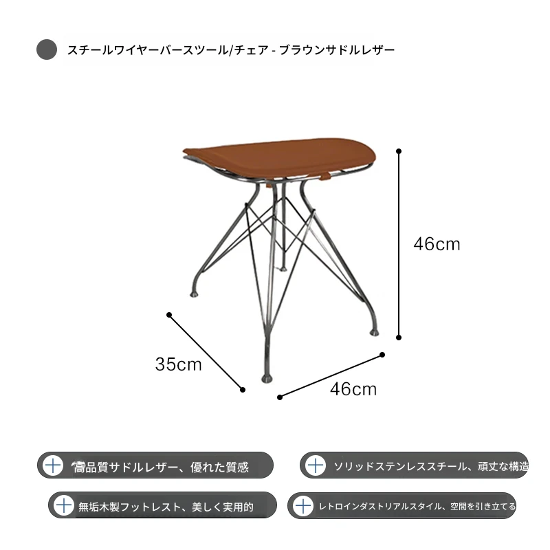 スツール-茶色のサドルレザー+ステンレススチールの素地の脚