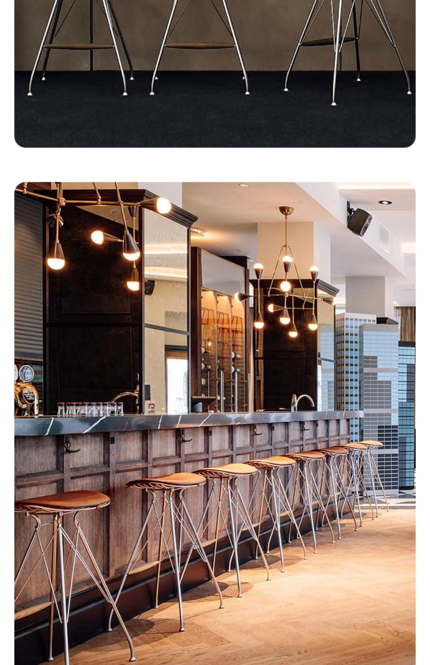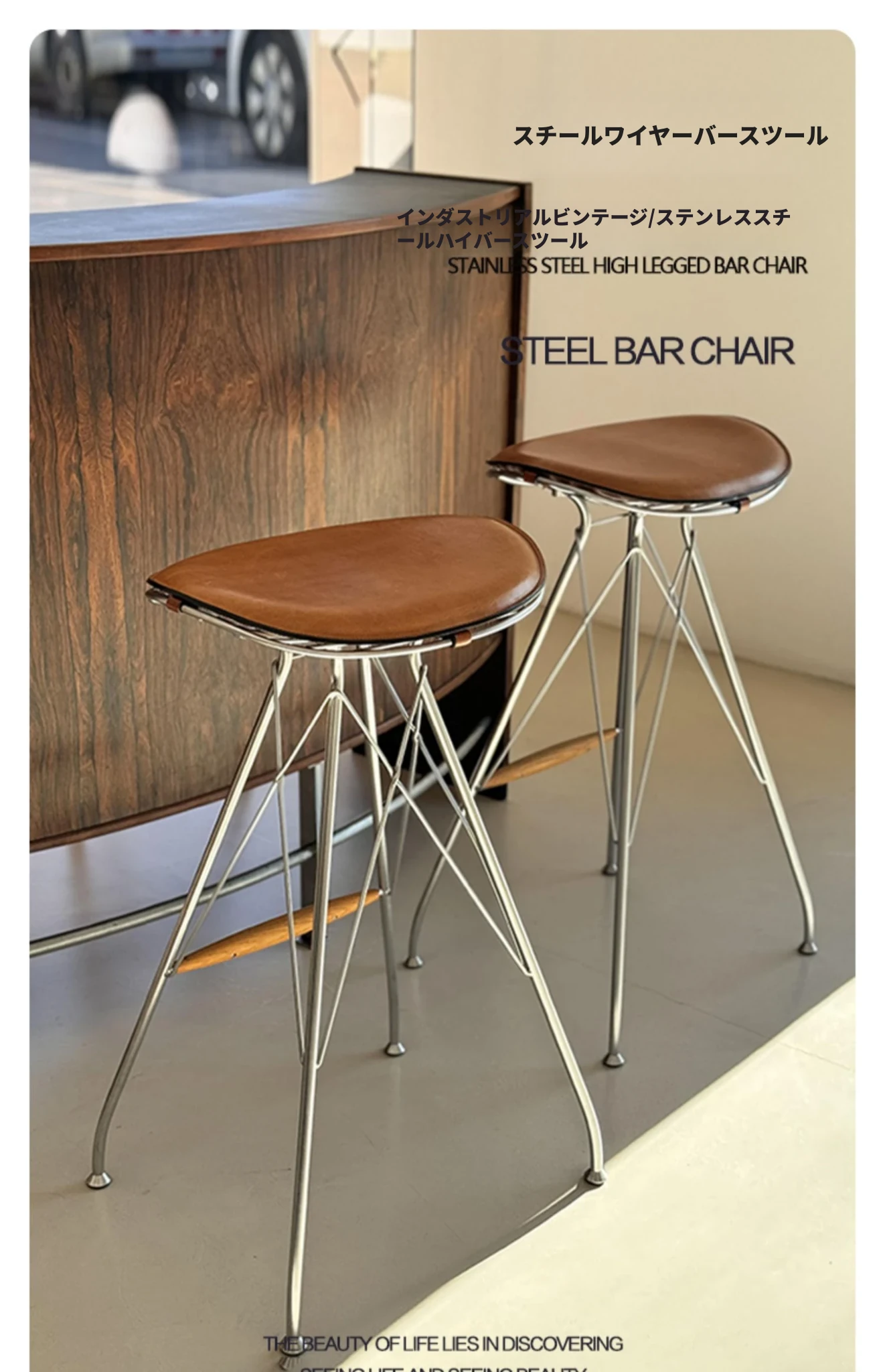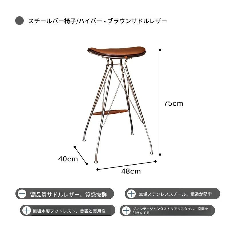 ハイバースツール-茶色のサドルレザー+ステンレススチールの素地の脚