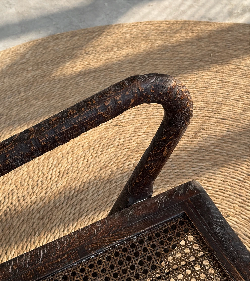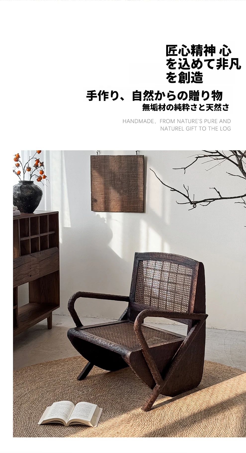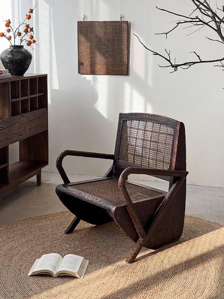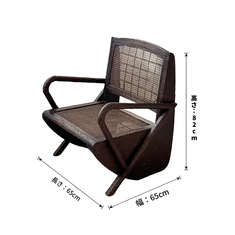 一人用リラックスソファー、ラタン仕上げの快適なデザイン。侘寂スタイルの無垢材チェア。おしゃれで居心地の良い中古風リビングにぴったり!デザイナーおすすめの一品です。