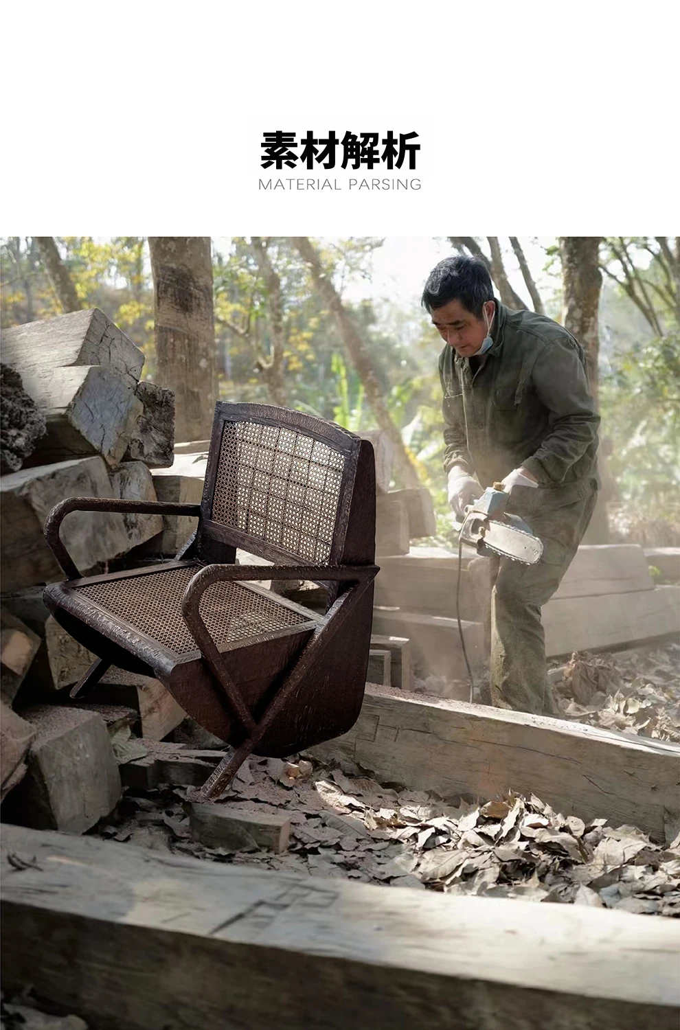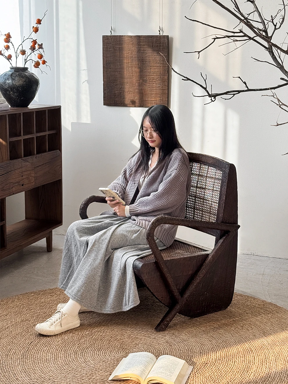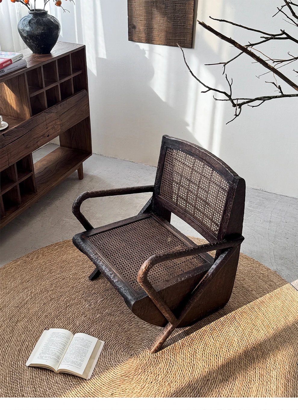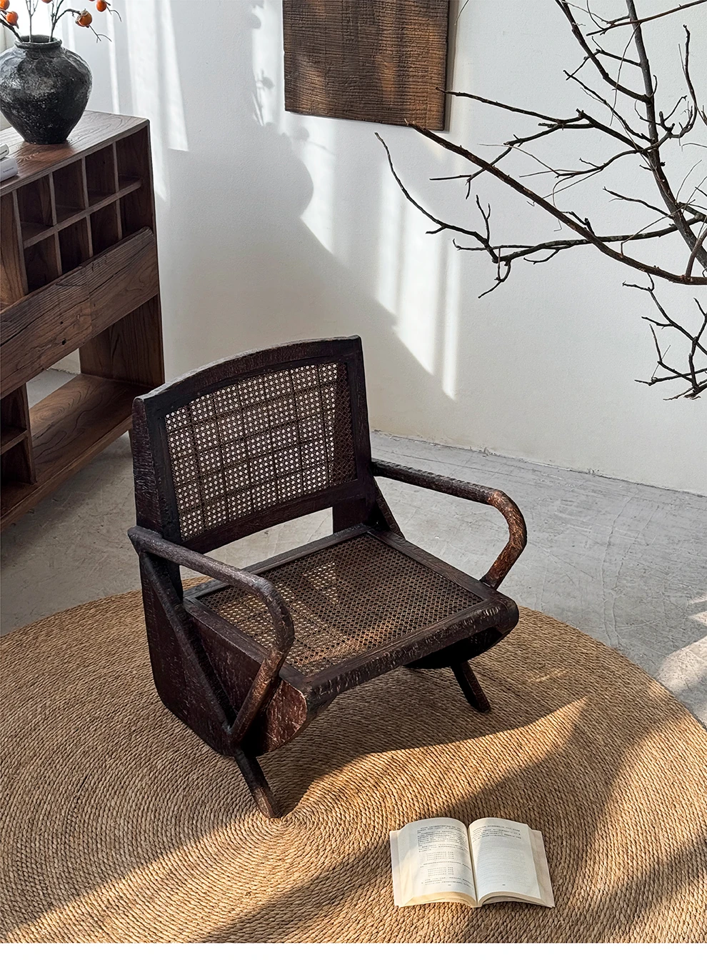 一人用リラックスソファー、ラタン仕上げの快適なデザイン。侘寂スタイルの無垢材チェア。おしゃれで居心地の良い中古風リビングにぴったり!デザイナーおすすめの一品です。