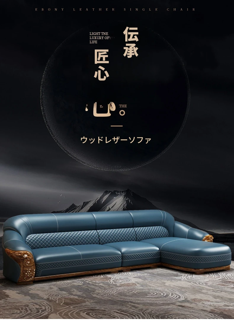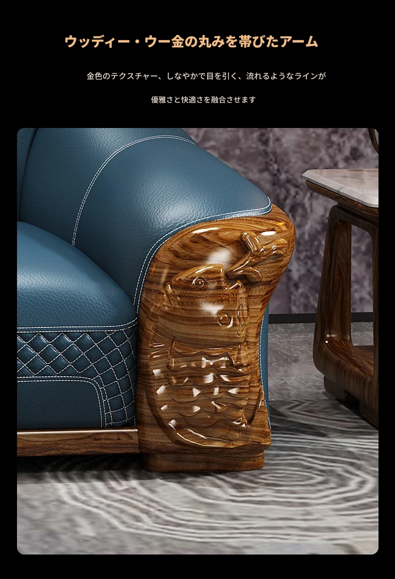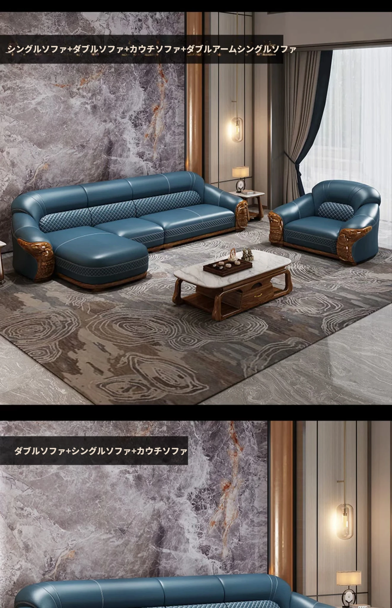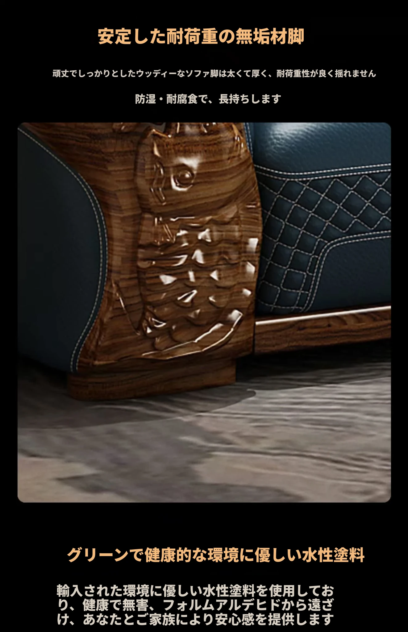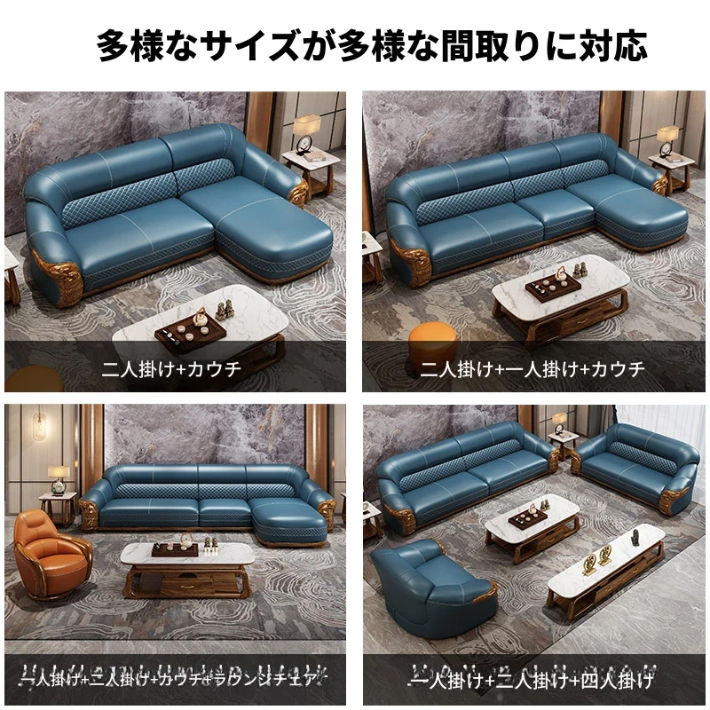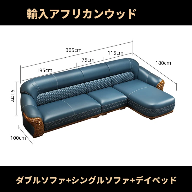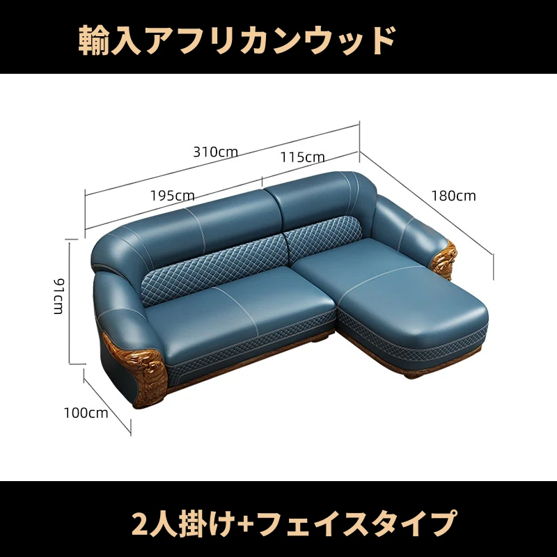 高級感溢れる欧風ウッド調本革ソファ!小型住居にも最適なL字型コンビネーション。上質な牛革と無垢材使用で、贅沢なリビング空間を演出します。