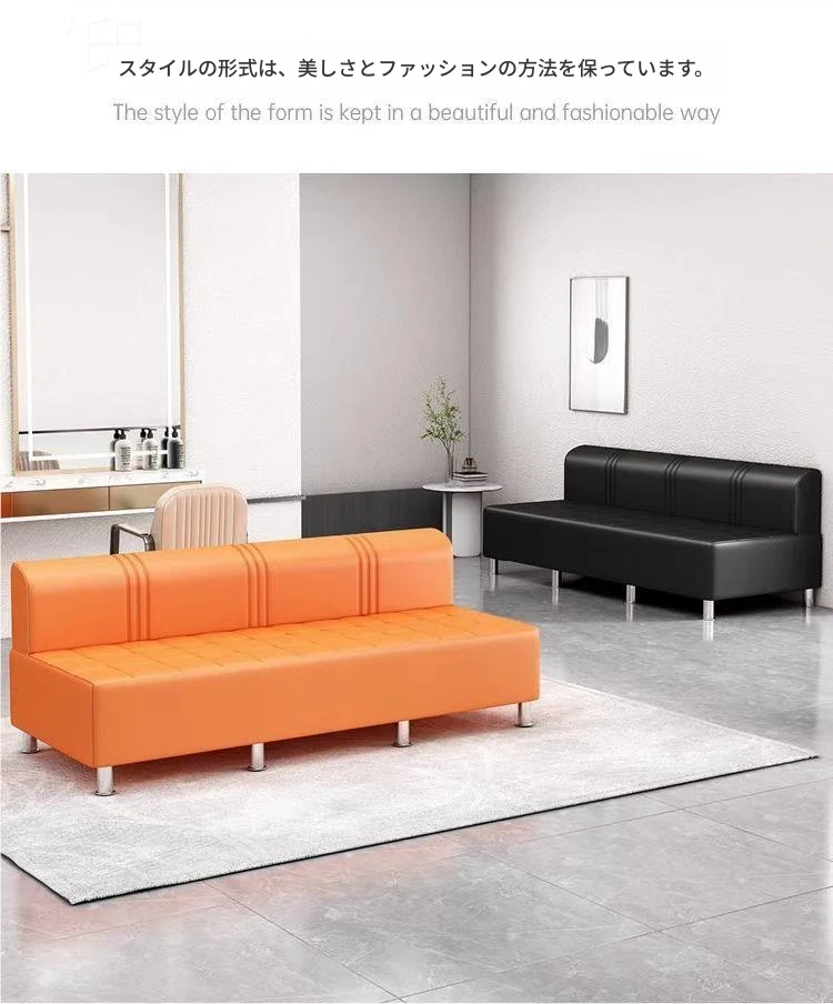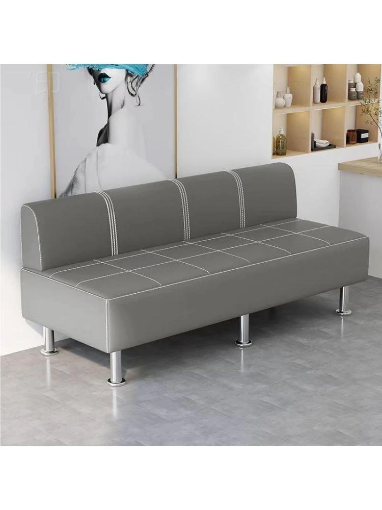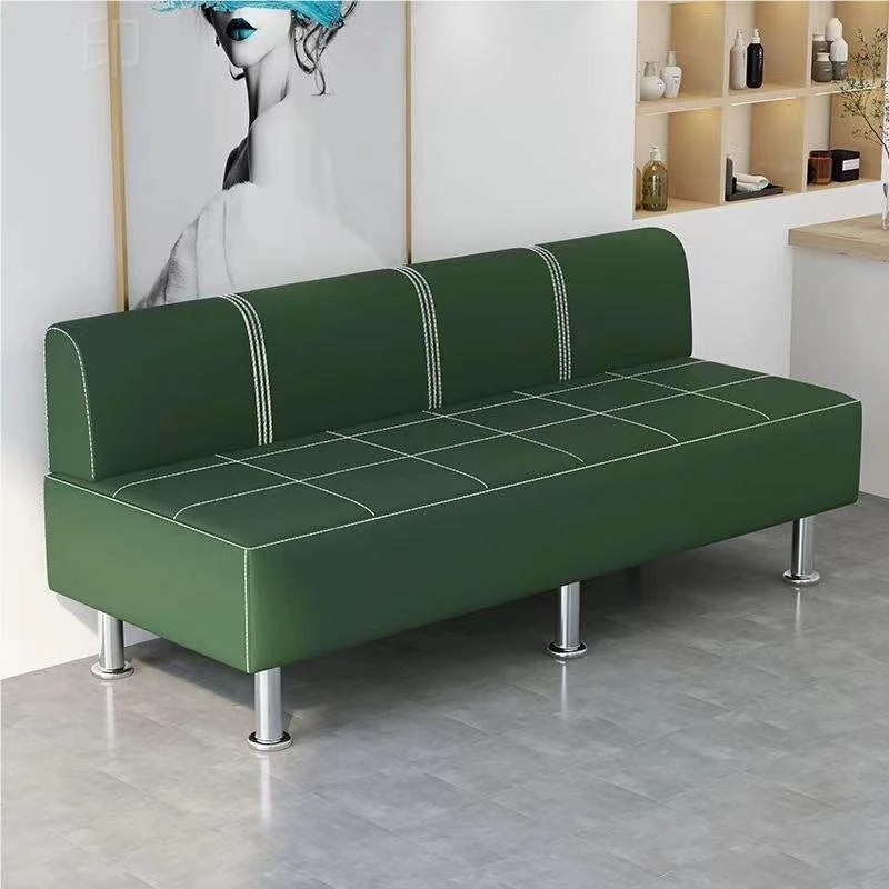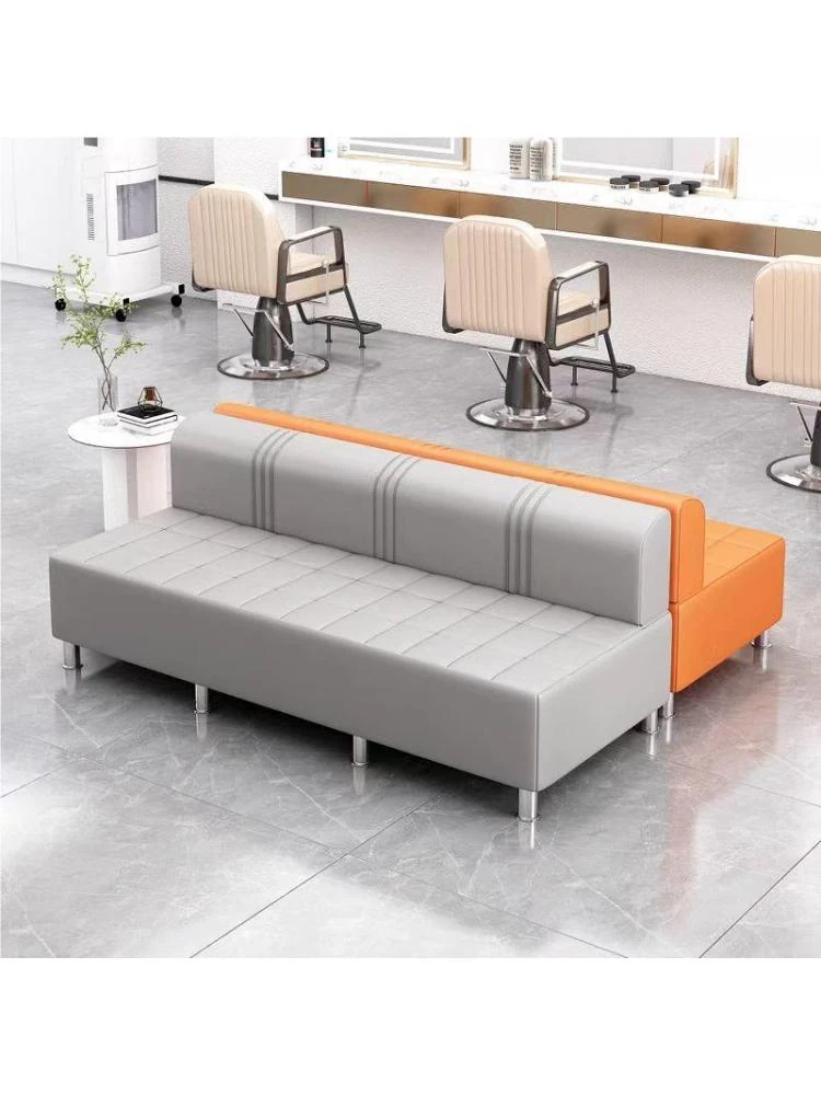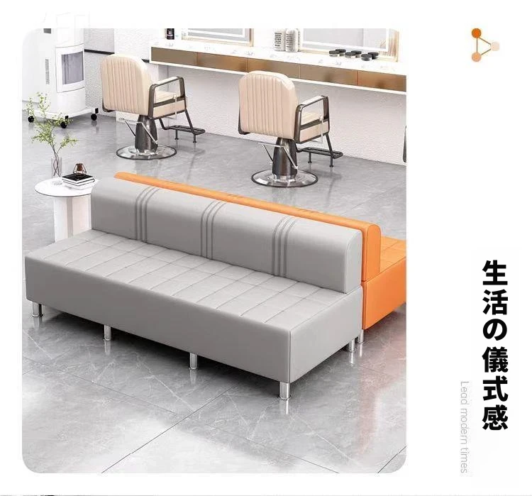 美容室の休憩エリアに最適!おしゃれなソファと待機椅子 - 人気のヘアサロンでの快適な待ち時間を提供する専用ロングベンチ。お客様をリラックスさせるデザインで、見た目も抜群!